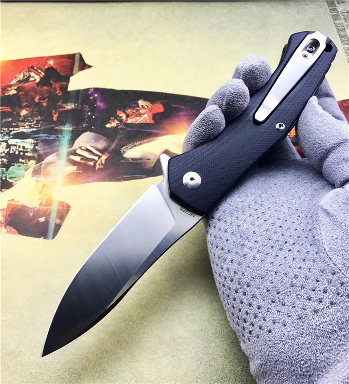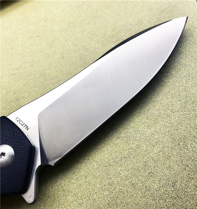 直升机轴承快开折刀 全长:195mm 刃长:85mm 刃宽:27mm 刃厚:4.0mm 材料:12cr27 硬度:58 锁定线锁,轴承快开折刀,刀身数控精磨,电脑锣加工 手柄:G10,减轻重量。CNC加工搭配黑色G10手柄圆弧表面,有背夹 战术折刀,水滴头,切割能力强