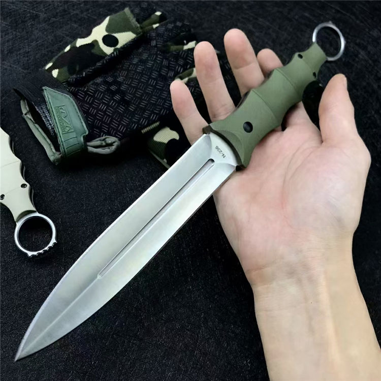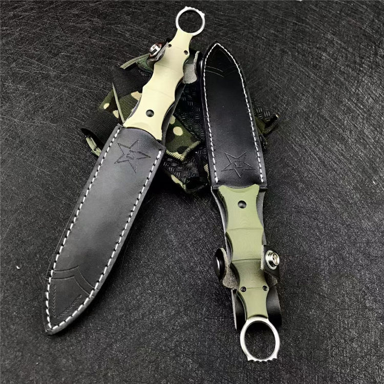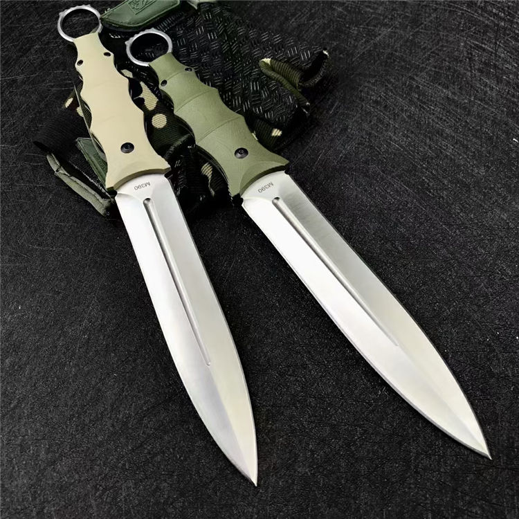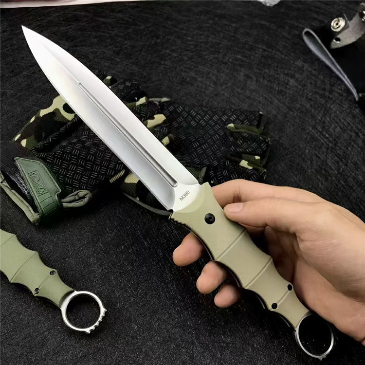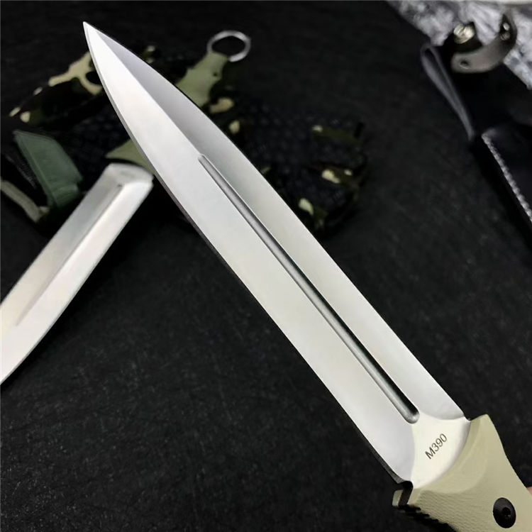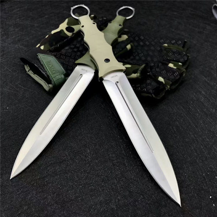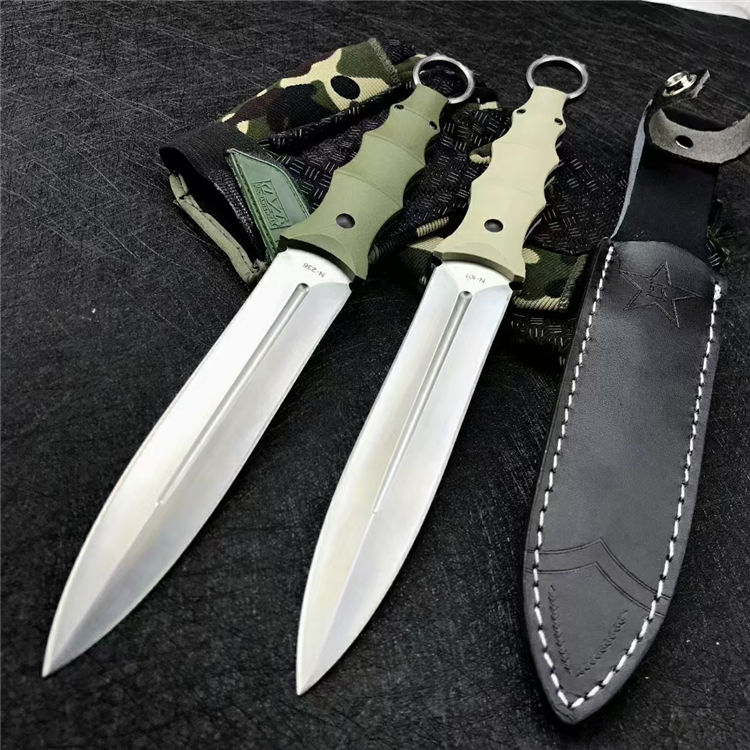 毒液双刃刺刀 全长:29.5CM 刃长:16CM 厚:0.5CM 刃宽:3CM 刃材:M-390 硬度:60(真空油冷热处理) 战术牛皮,刀套牛皮挂件