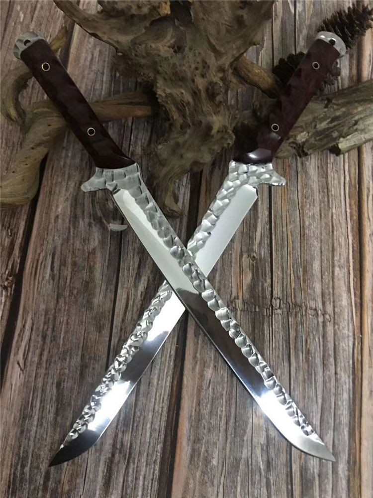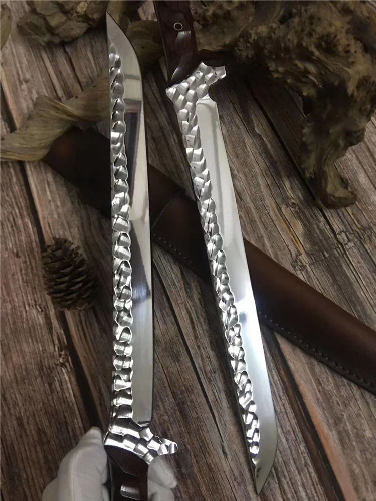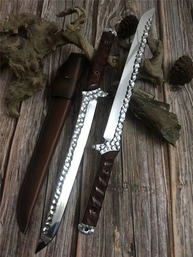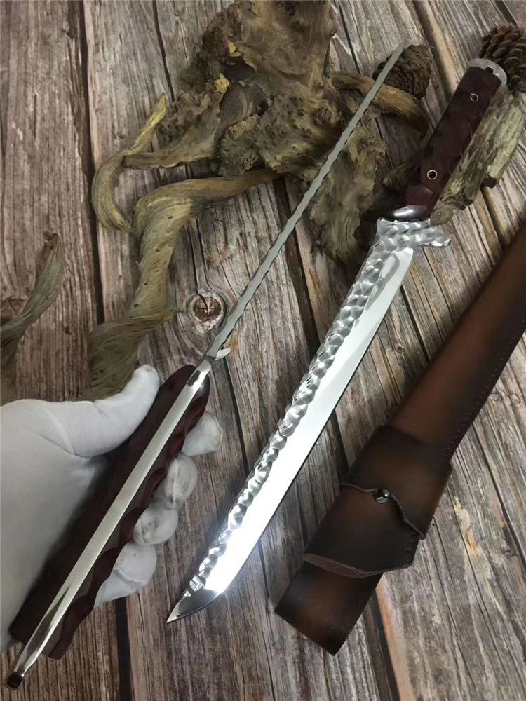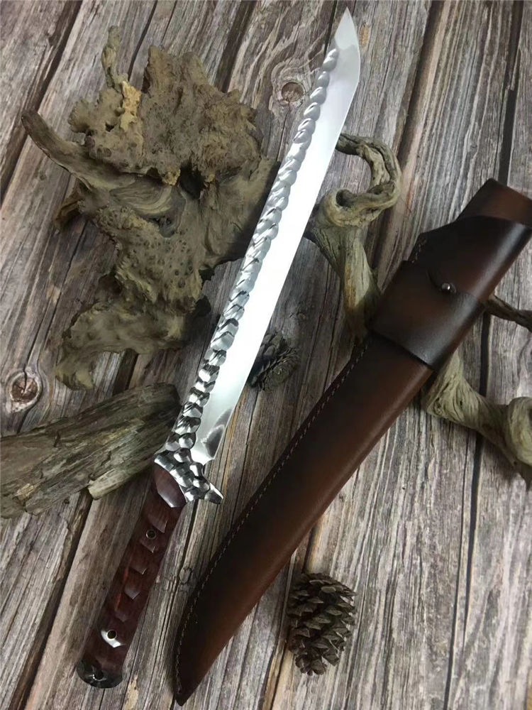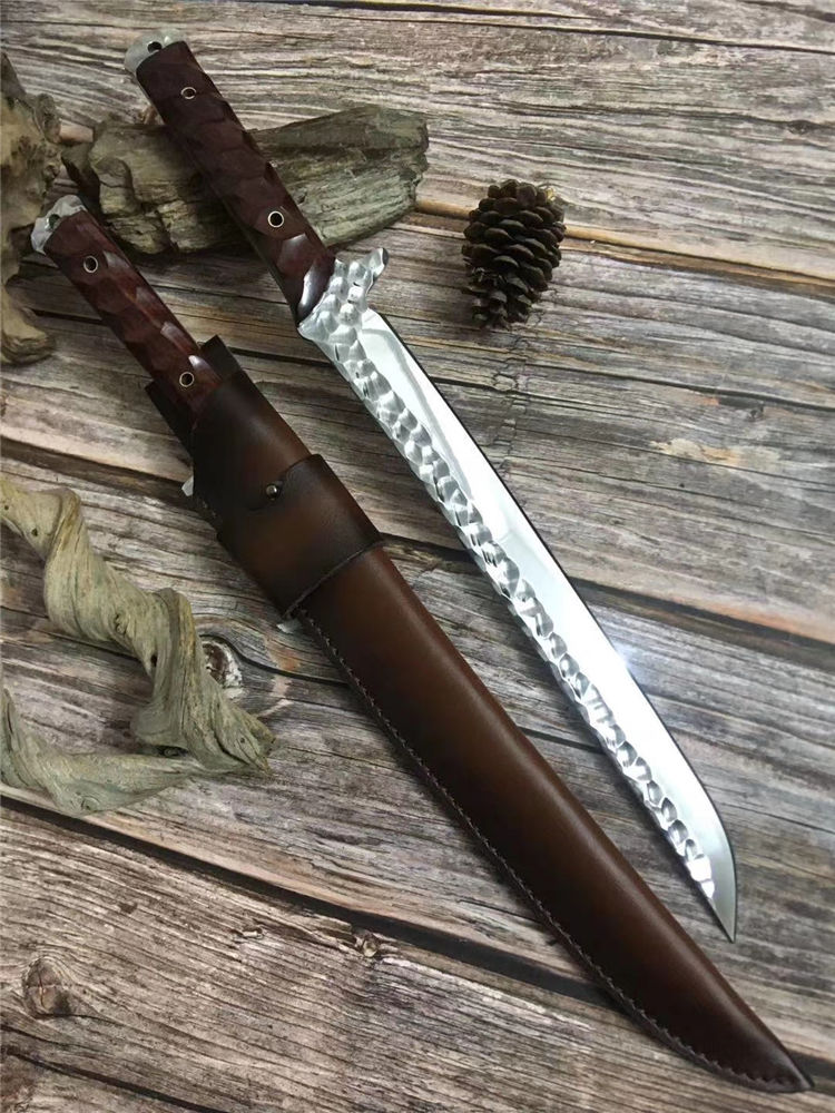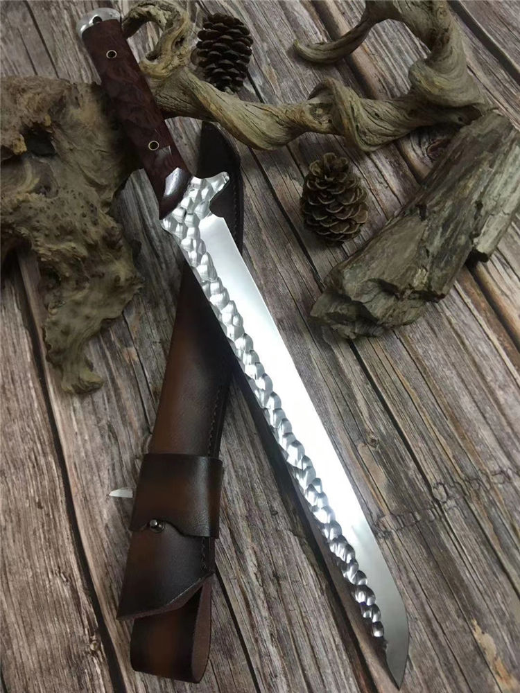 新版手工沼泽鼠武士刀 总长:44cm 刃长:28.5cm 柄长:14cm 厚度:5.5MM 钢材:进口高速钢、真空热处理 硬度:61HRC 柄材:进口红酸枝木 搭配:手工牛皮套 高端武士,大师作品,进口一体高速钢锻造制作,纯手工表面雕工沧桑复古效果,刃部镜光效果出色,手工开刃方式,蛤刃,非常锋利,造型相当霸气,柄部搭配进口红酸枝木材手工打磨山丘式防滑效果,佩手工牛皮套
