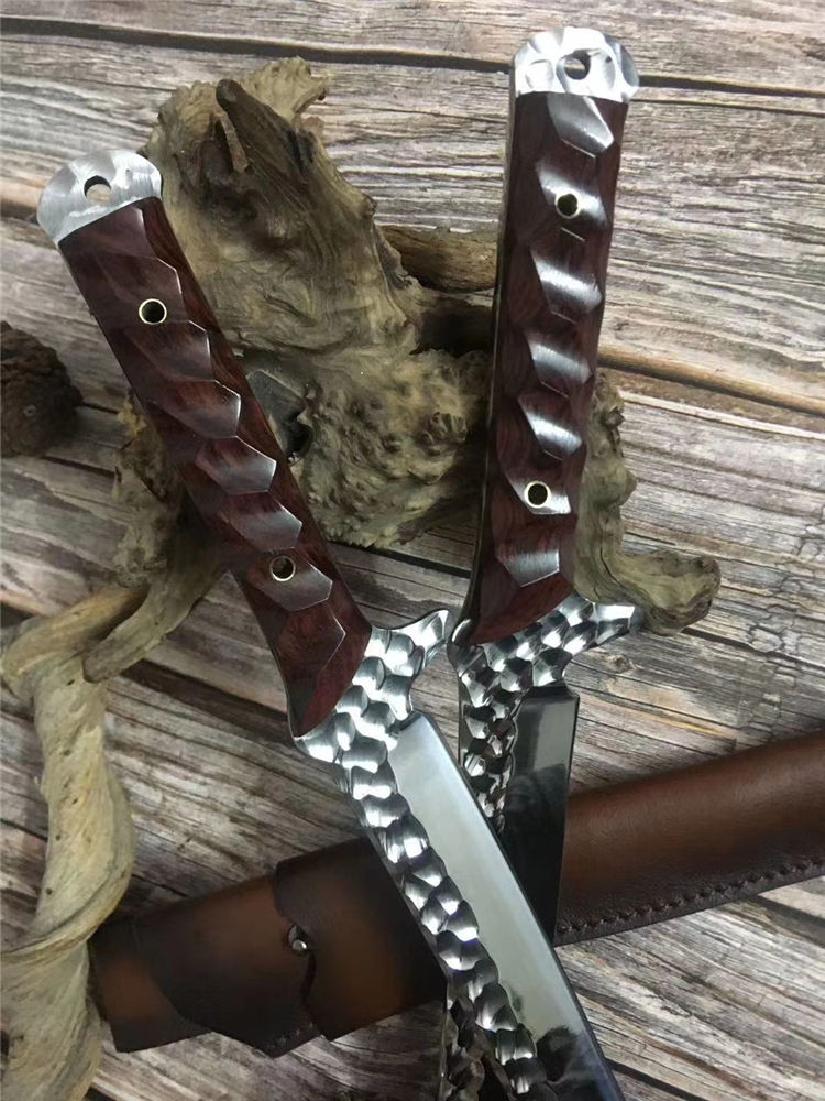 高端武士,大师作品,进口一体高速钢锻造制作,纯手工表面雕工沧桑复古效果,刃部镜光效果出色,手工开刃方式,蛤刃,非常锋利,造型相当霸气,柄部搭配进口红酸枝木材手工打磨山丘式防滑效果,佩手工牛皮套