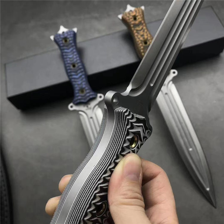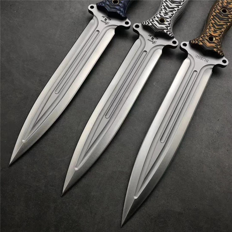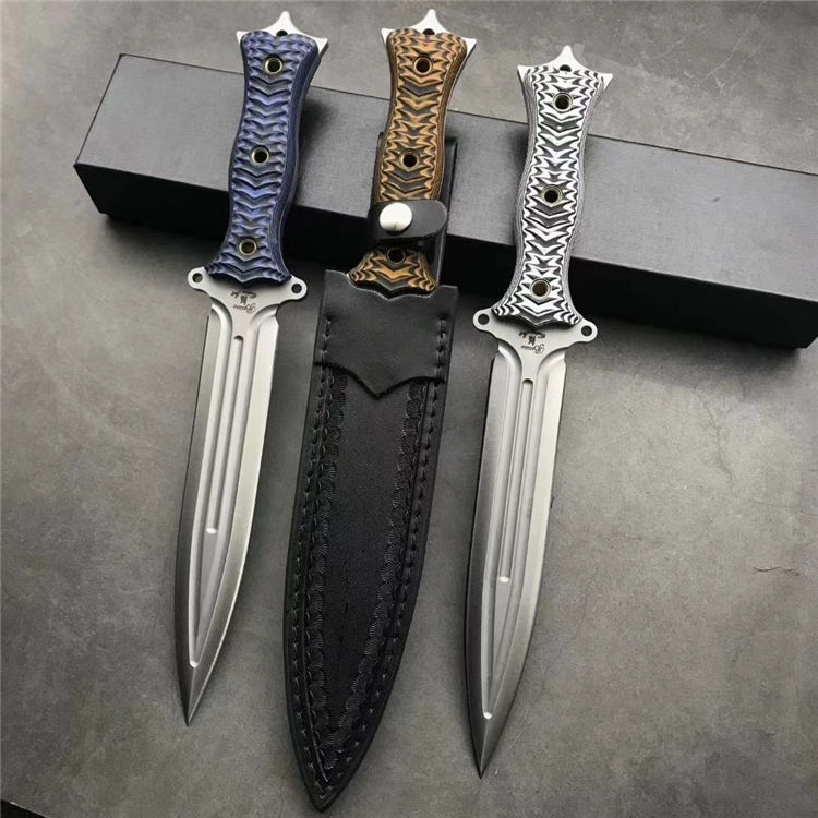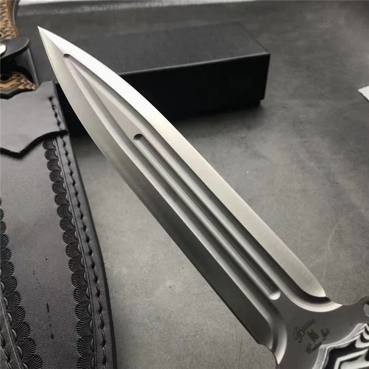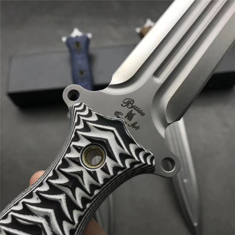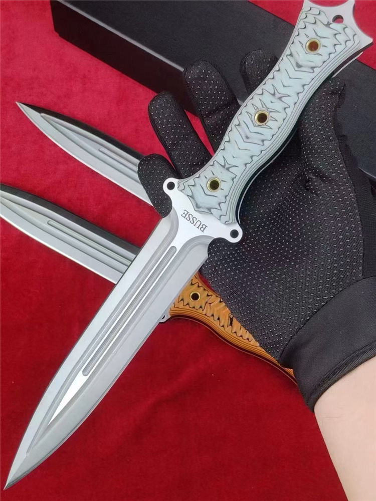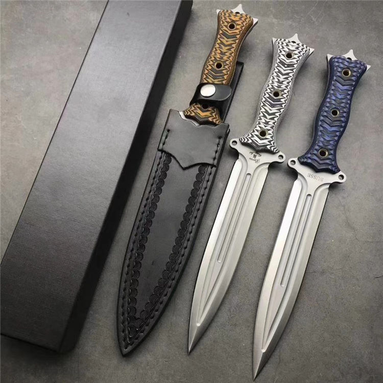 巴斯魔君双刃直刀 全长: 33cm 刃长: 18cm 刃宽:3.5cm(最宽处) 柄长:15cm 刃厚: 5.5mm 刃材:440C 硬度: 58RHC 表面:砂光 柄材: G10,经电脑锣精加工防滑格纹 重量:417克 包装:皮套+黑色礼品盒