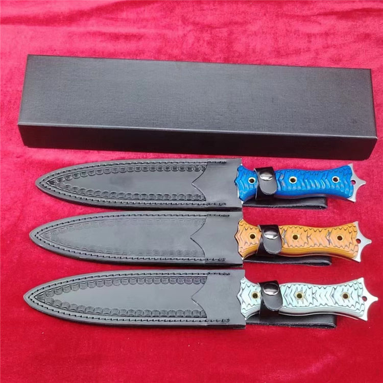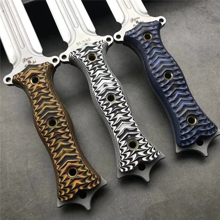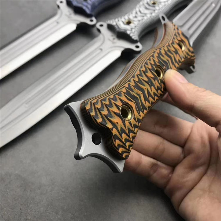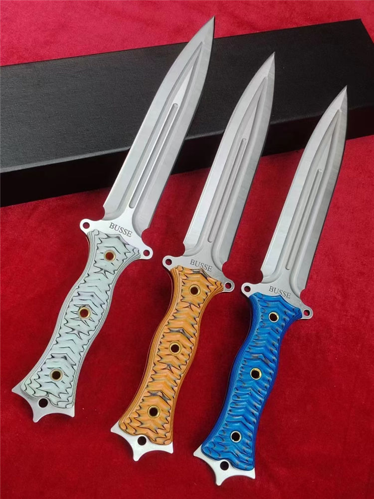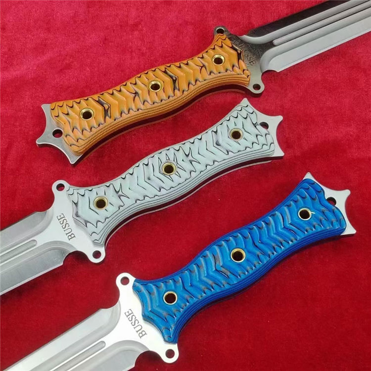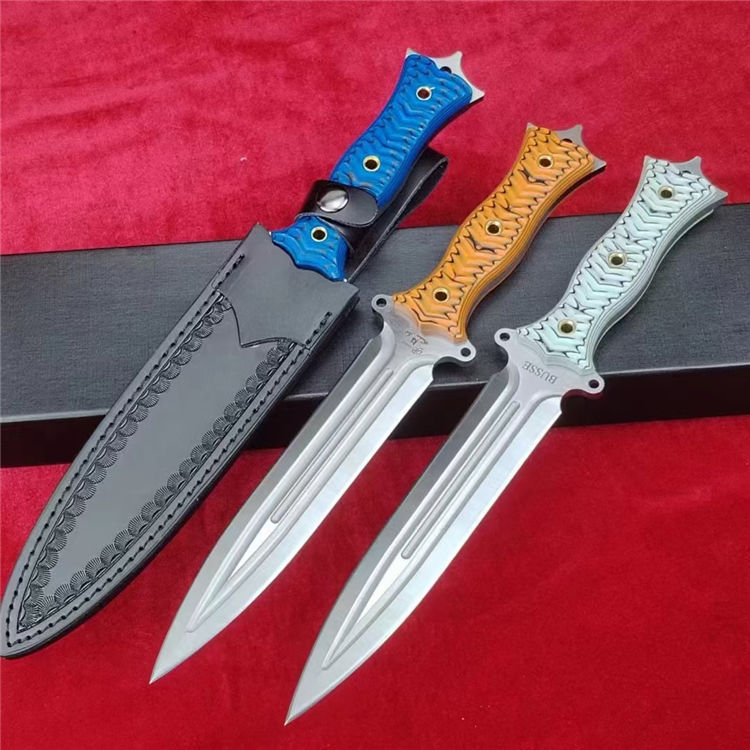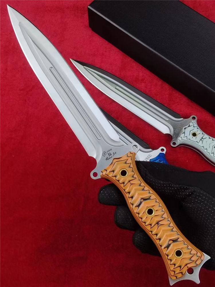 巴斯魔君双刃直刀 全长: 33cm 刃长: 18cm 刃宽:3.5cm(最宽处) 柄长:15cm 刃厚: 5.5mm 刃材:440C 硬度: 58RHC 表面:砂光 柄材: G10,经电脑锣精加工防滑格纹 重量:417克 包装:皮套+黑色礼品盒