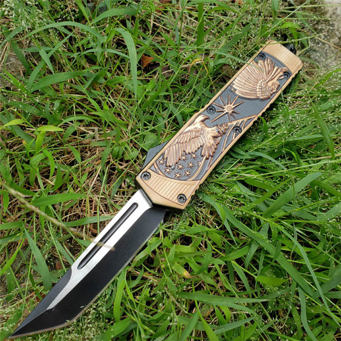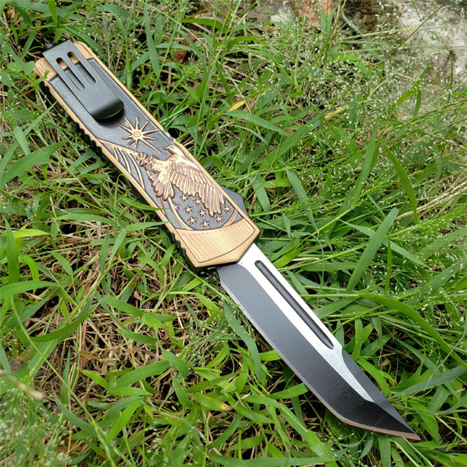 印第安猎鹰直出跳刀 开启长度:23.0CM 合起长度:14.CM 刃长:9cm 刃厚:2.9CM 硬度:57HRC 刃材:440 表面:刀刃发黑伴拉丝 把手:锌铝合金 净重:231克(整刀) 毛重:450克(含包装物) 开合:双动作,直推开关,自动弹出和收回 包装:耐磨专用战术尼龙套 口袋刀夹:弹簧刀夹 玻璃敲击器:钨质玻璃敲击器