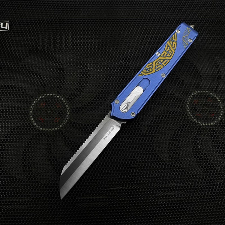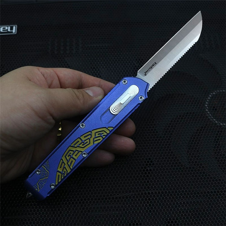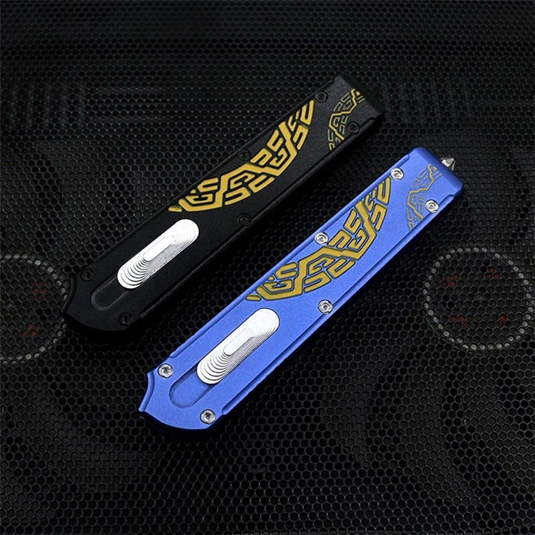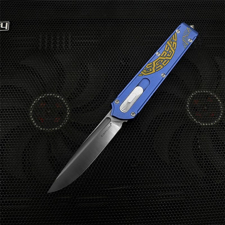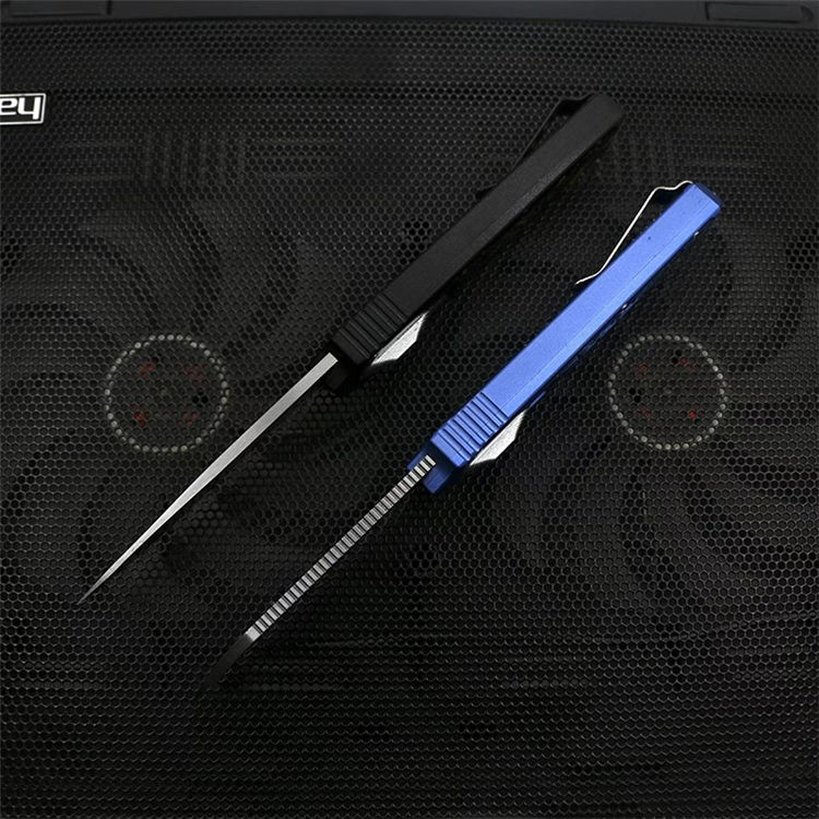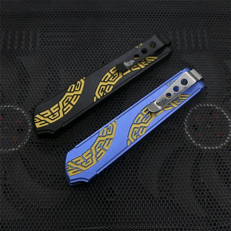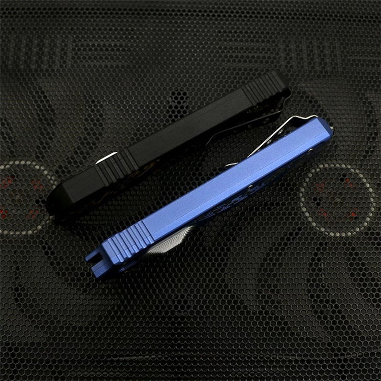 Slenderman直出跳刀 全长:215mm 刃长:85mm 厚度:3.0mm 刀片:9CR18MOV 手柄:航空铝(T6-6061) 硬度:59-60HRC 热处理:真空热处理 刀片处理:打磨 处理:氧化+ 3D打印 尾巴:玻璃撞击器后 背夹:不锈钢 净重:92g