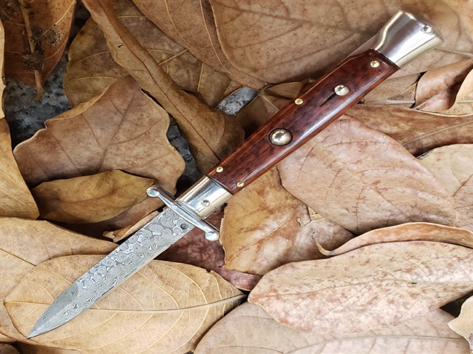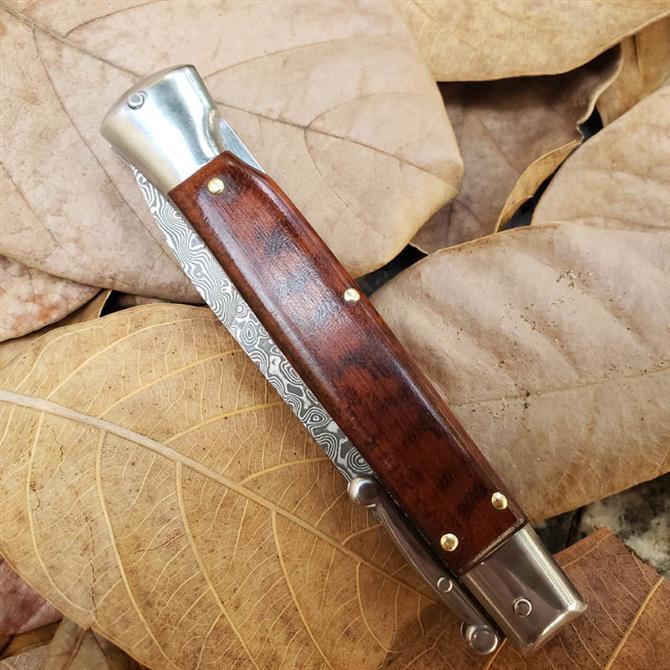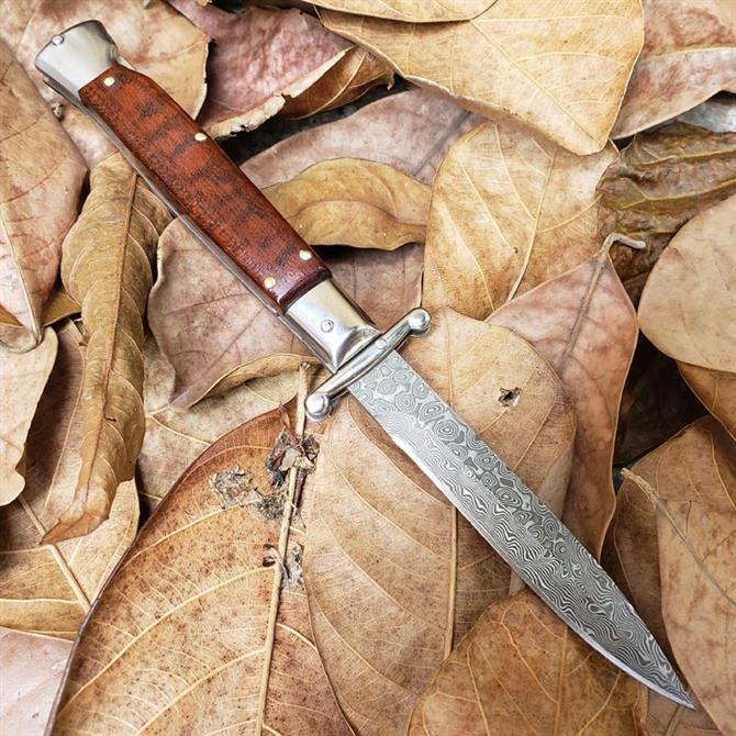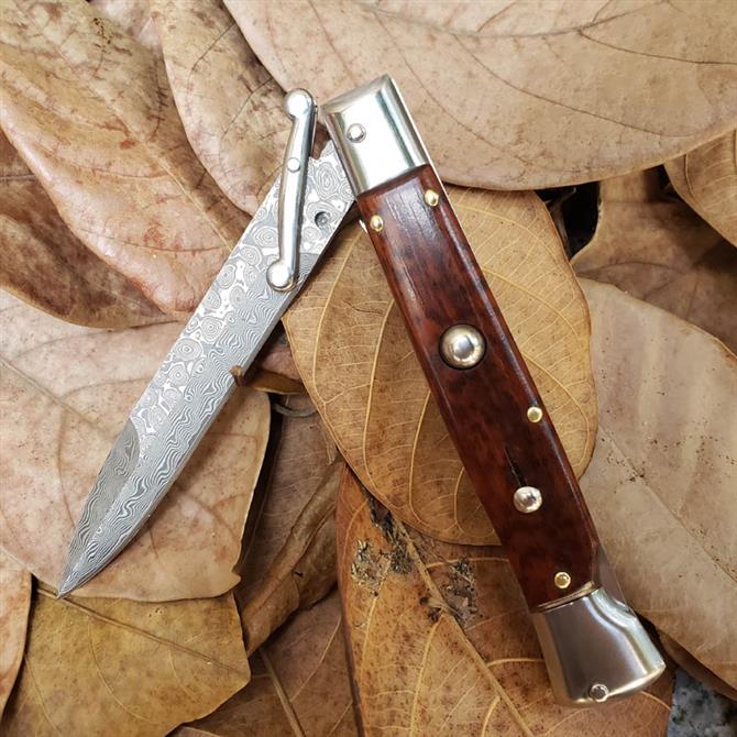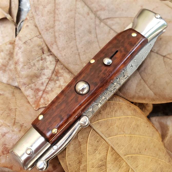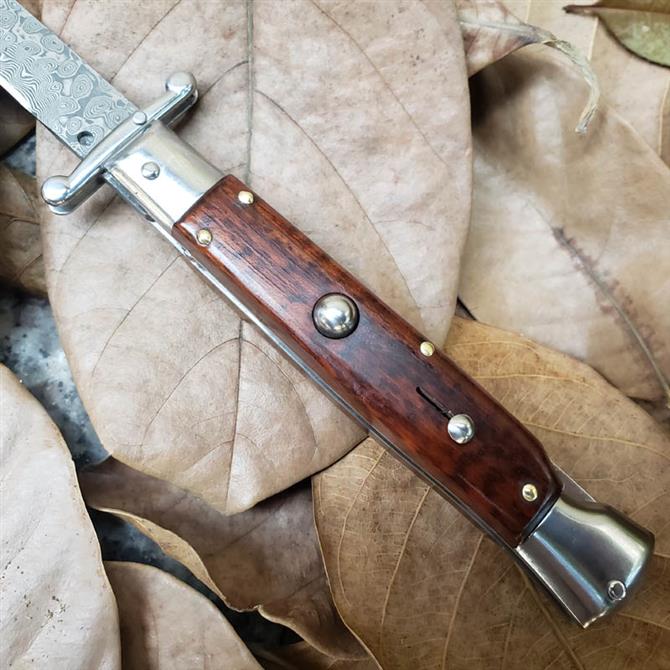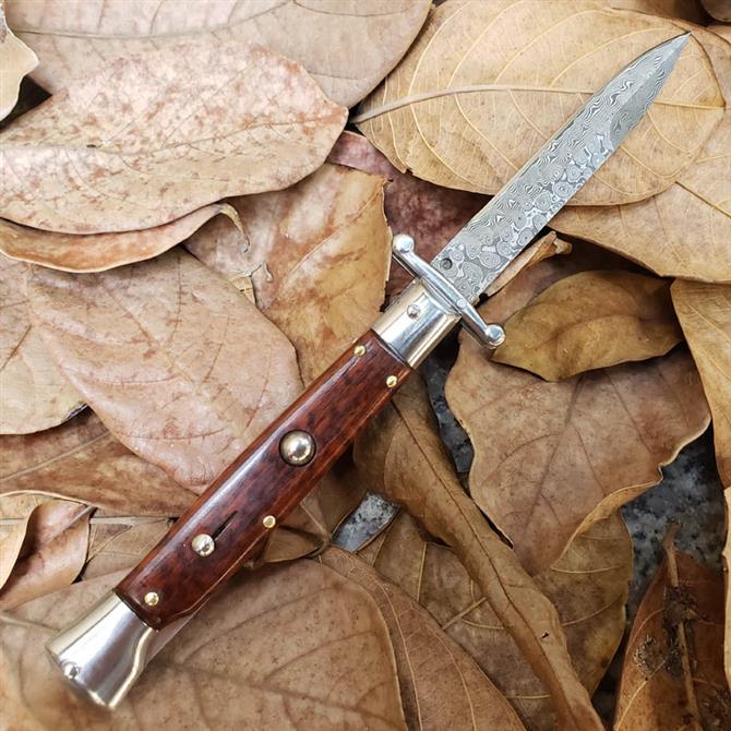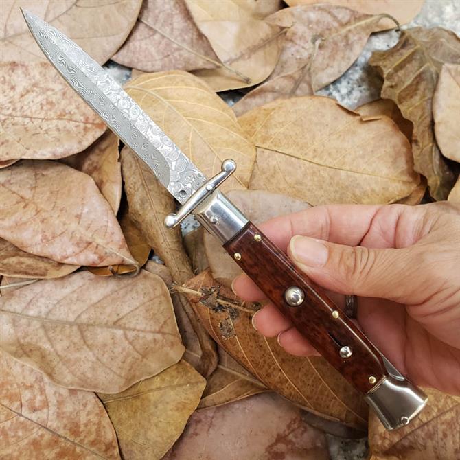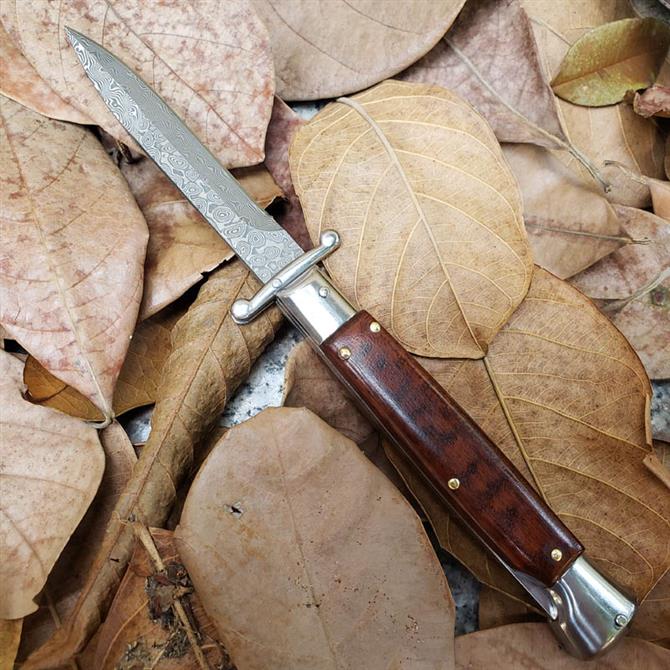 大马士革意大利守护神侧开跳刀 全长:22.86CM 刃长:10CM 刃厚:3MM 刃材:大马士革 柄材:全钢+蛇纹木 重量:120克 包装:礼盒