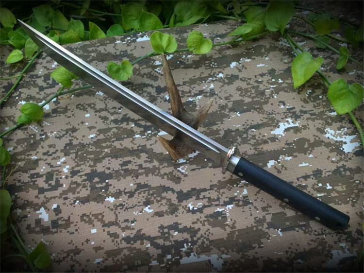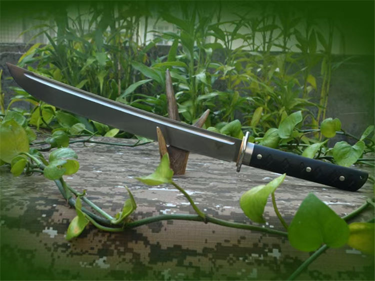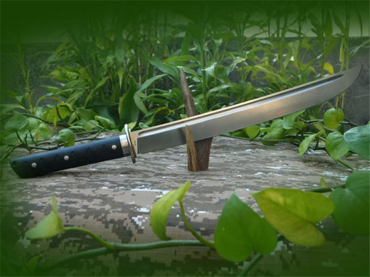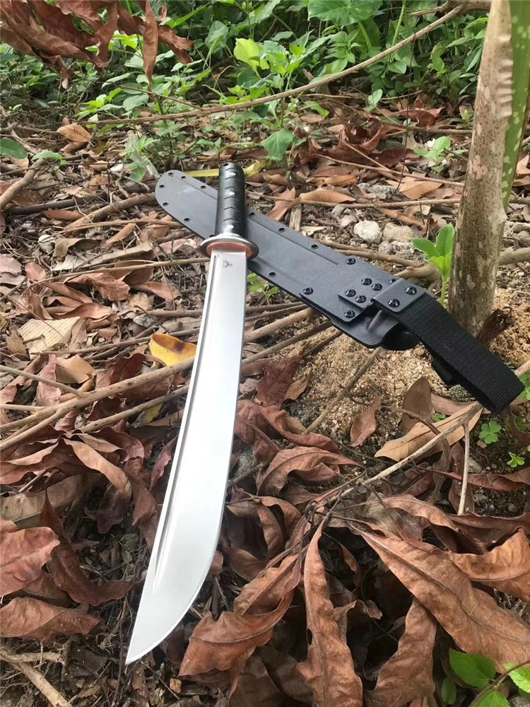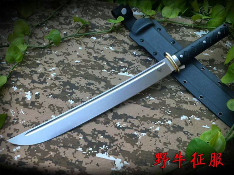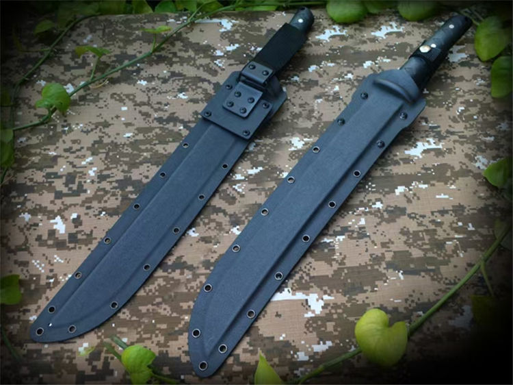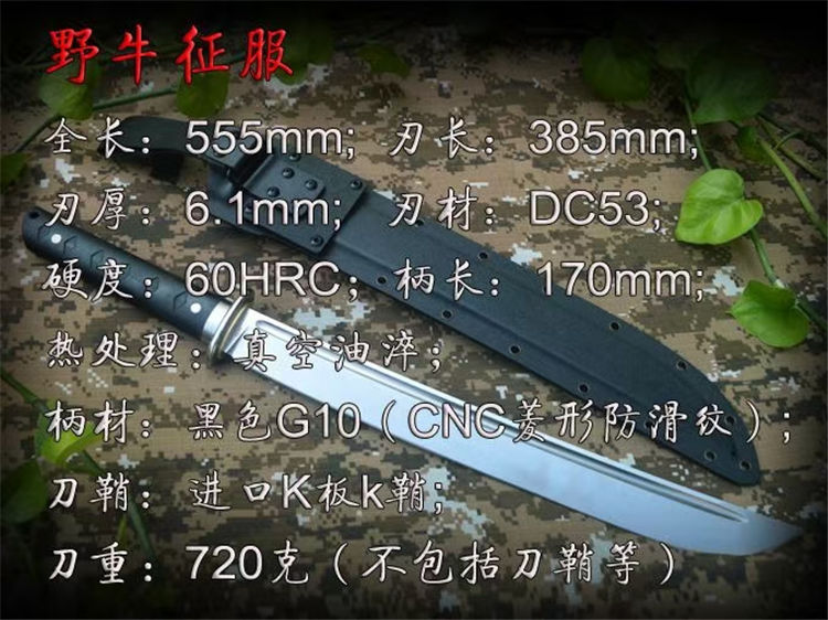 野牛征服开山刀 全长:555mm 刃长:385mm 刃厚:6.1mm 刃材:DC53 柄长:170mm 柄材:黑色G10 刀鞘:进口K板k鞘