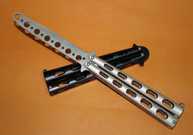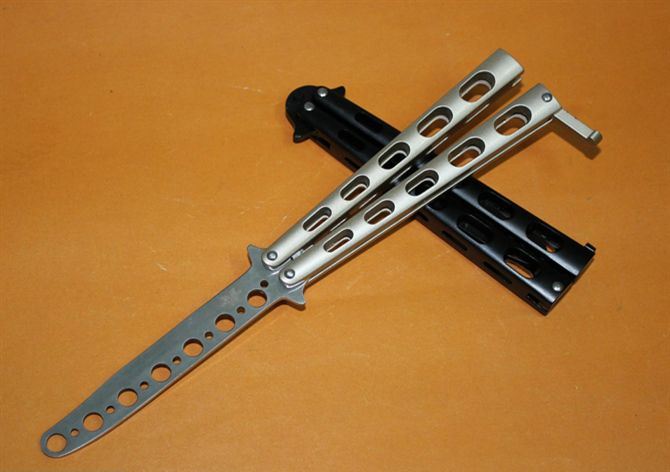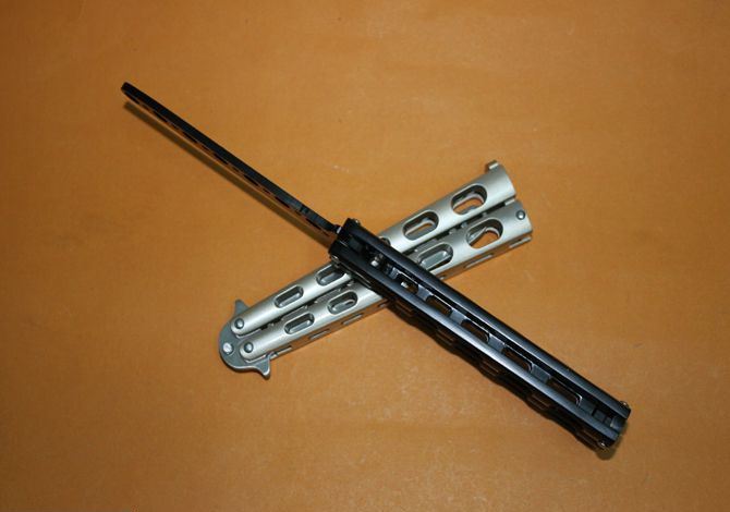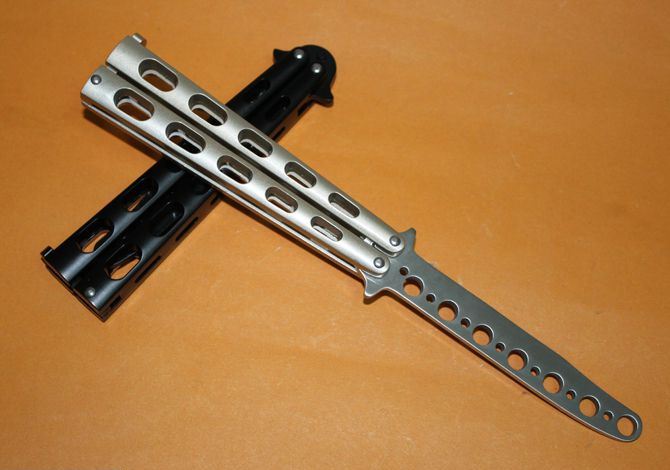 蝴蝶C33训练甩刀(黑色.银色) 全长:23CM(打开) 刃长:10CM 刃厚: 0.3CM 刃材料:440C 硬度:55-57 净重:120克