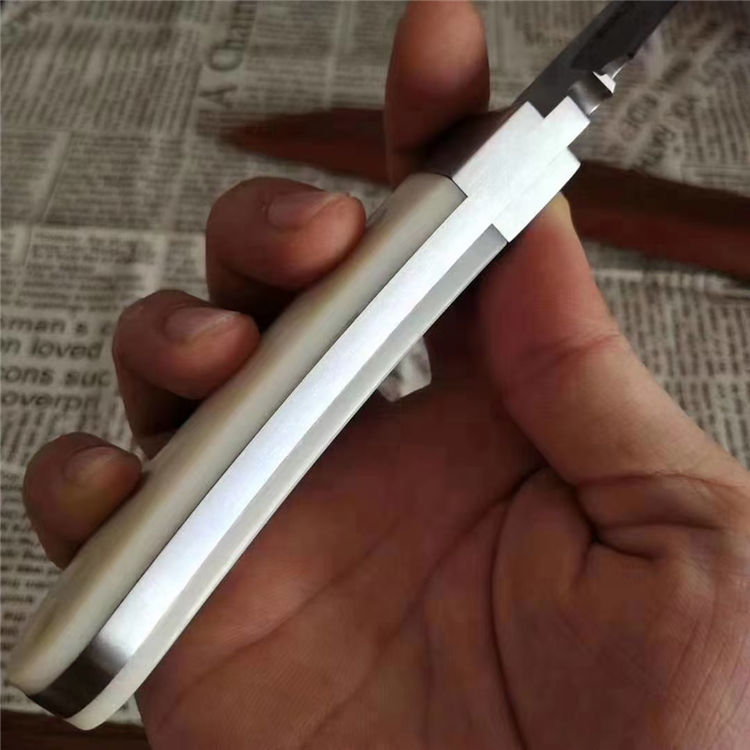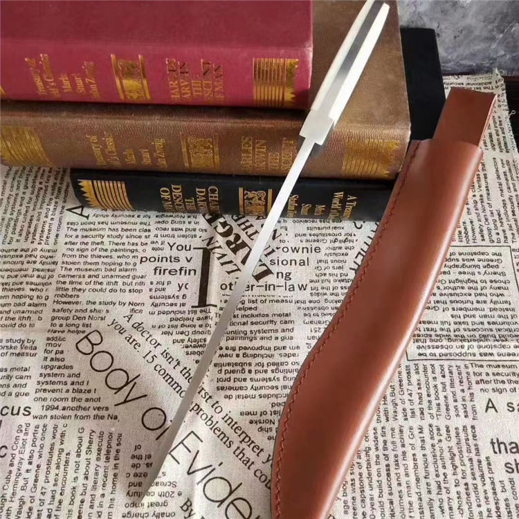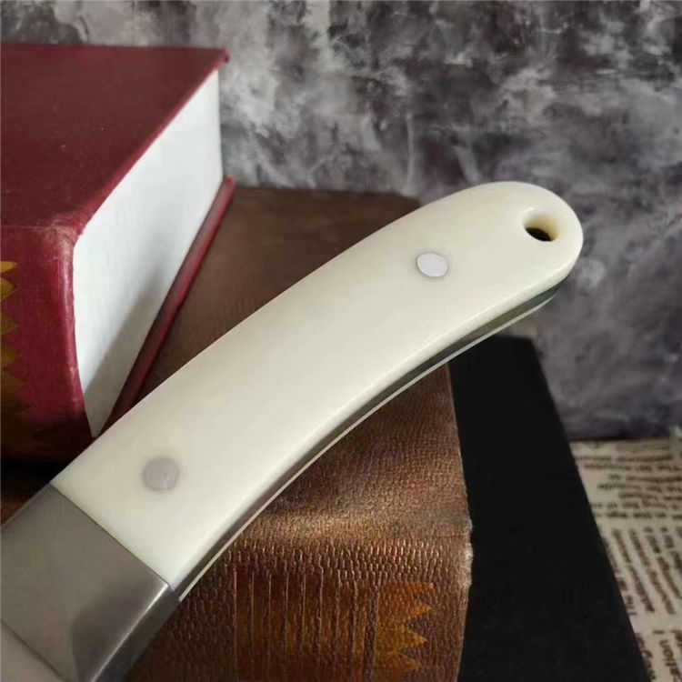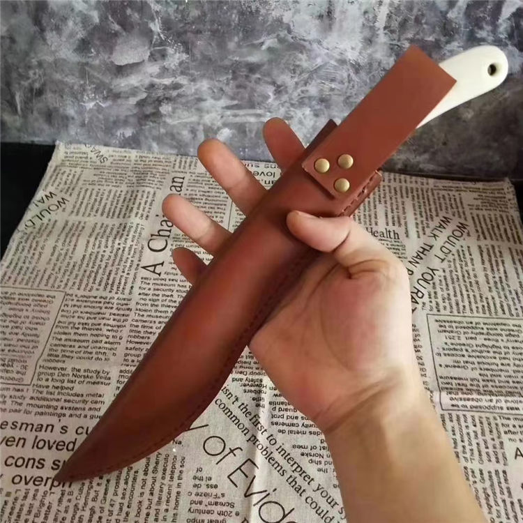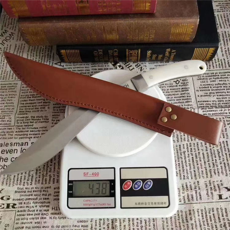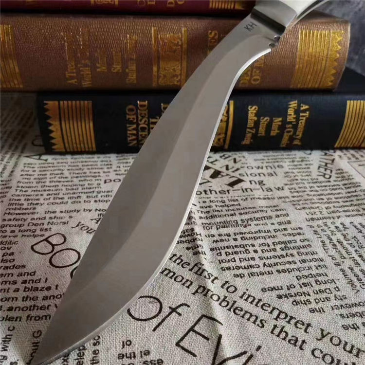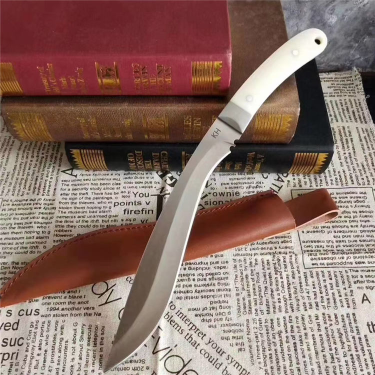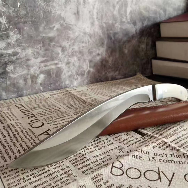 廓尔喀窈窕淑女狗腿弯刀 全长:35cm 刃长:22cm 柄长:12cm 刃厚:5.8mm 刃材:7Cr15Mov 硬度:58-59HRC 表面:砂光拉丝 柄材:天然牛骨 结构:一体龙骨钢 重量:154g 配套:优质牛皮套