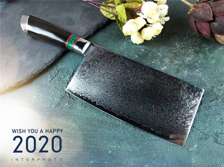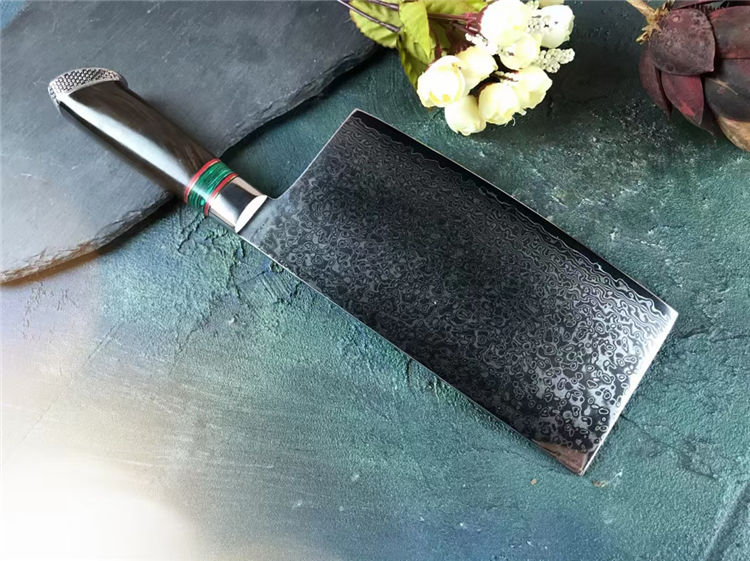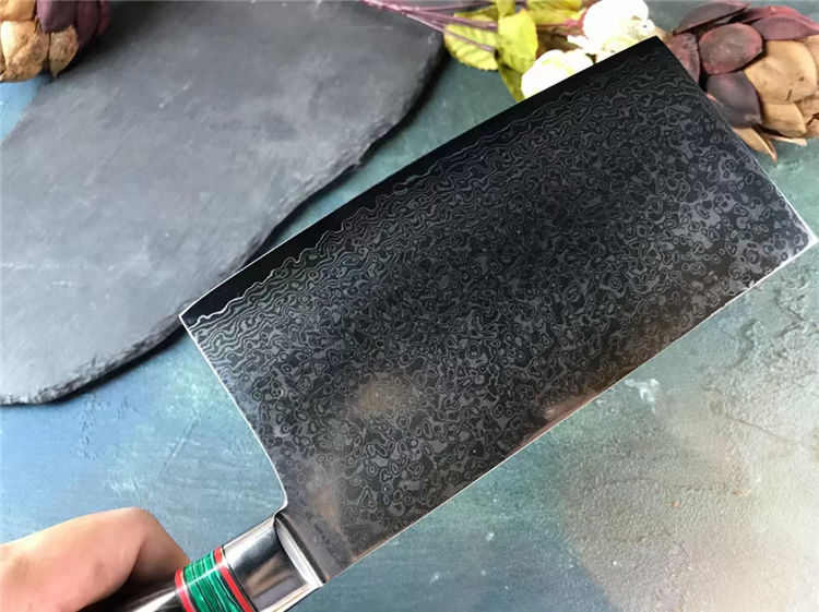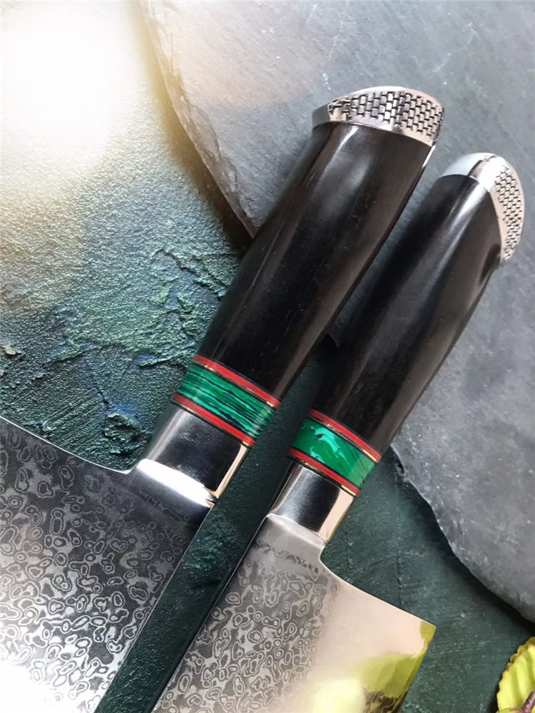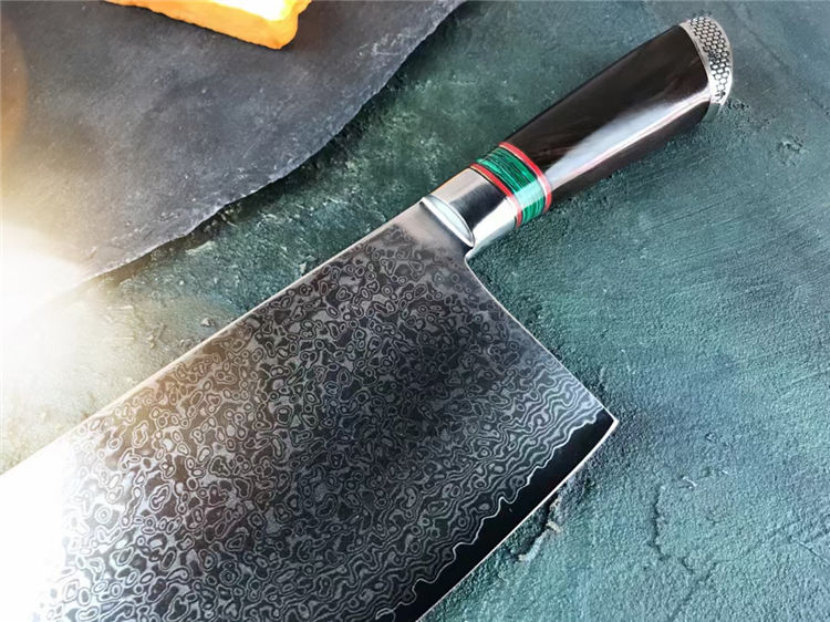 大马士革金粉世家菜刀 总长:30cm 刃长:17.8cm 刃厚:3.5mm 刃宽:9cm 钢材:台湾公司提供VG10锻造大马士革钢103层,真空热处理 硬度:60-62HRC 柄材:黑檀木+绿松石 包装:黑色手工盒子