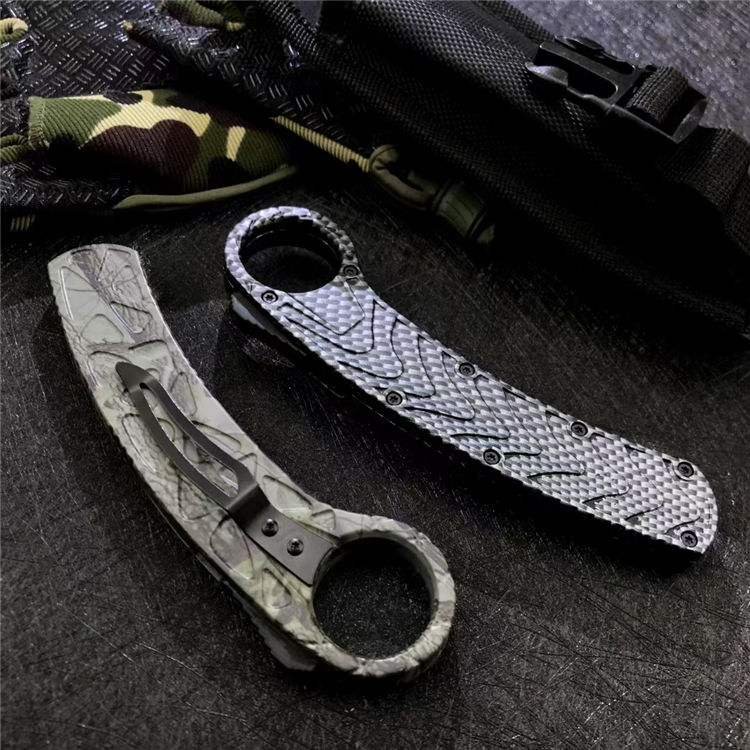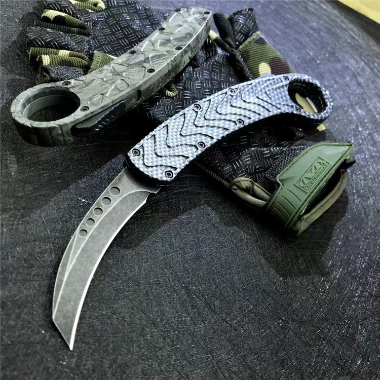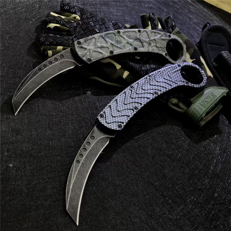 灵鸟石洗版爪子跳刀 总长:22CM 刃长:7.5CM 柄长:14.5CM 厚度:0.3CM 刃材:D2工具钢叶片 硬度:58-61 重量:213克 护套材料:尼龙