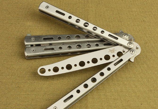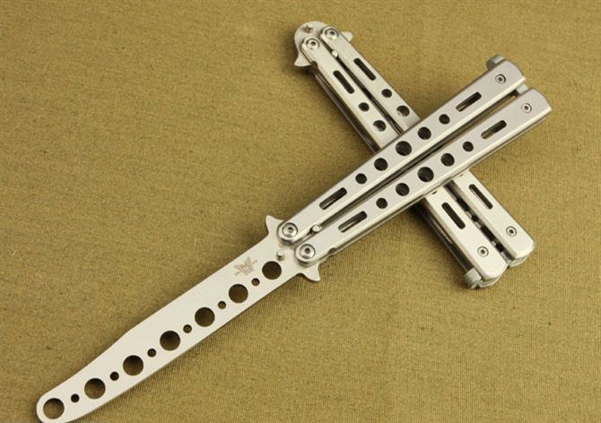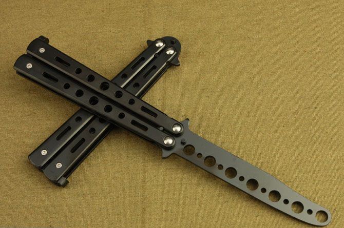 蝴蝶C27训练甩刀(黑.白) 全长:22.5CM(打开) 刃长:10CM 刃厚: 0.26CM 刃材料:440C 硬度:55-57 净重:130克