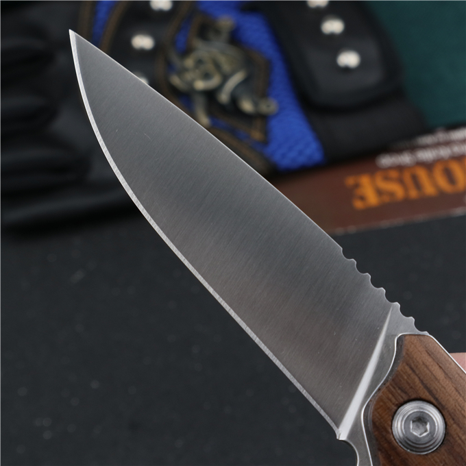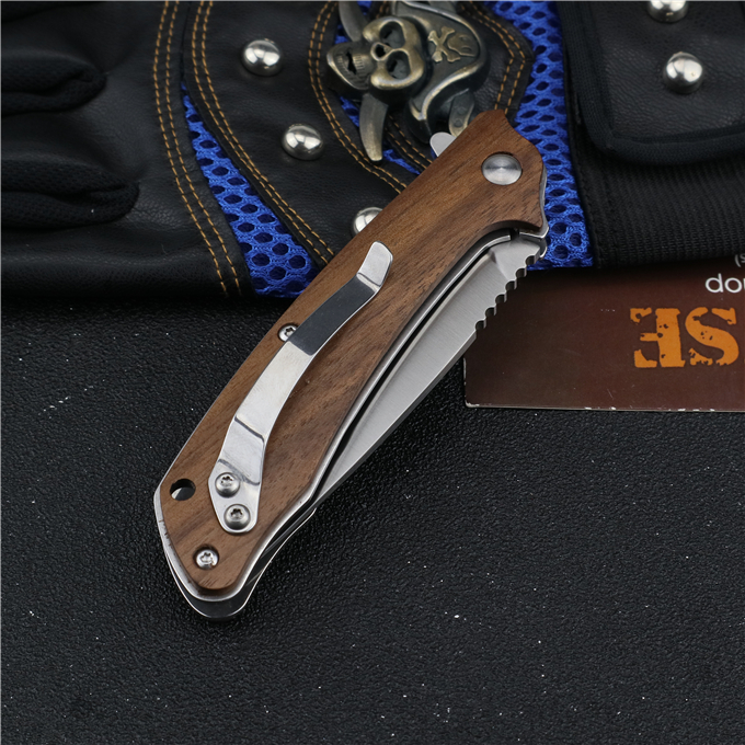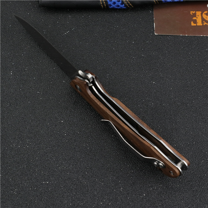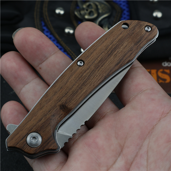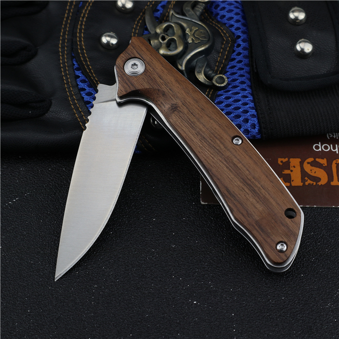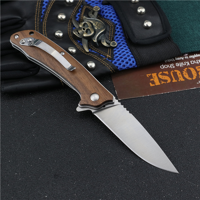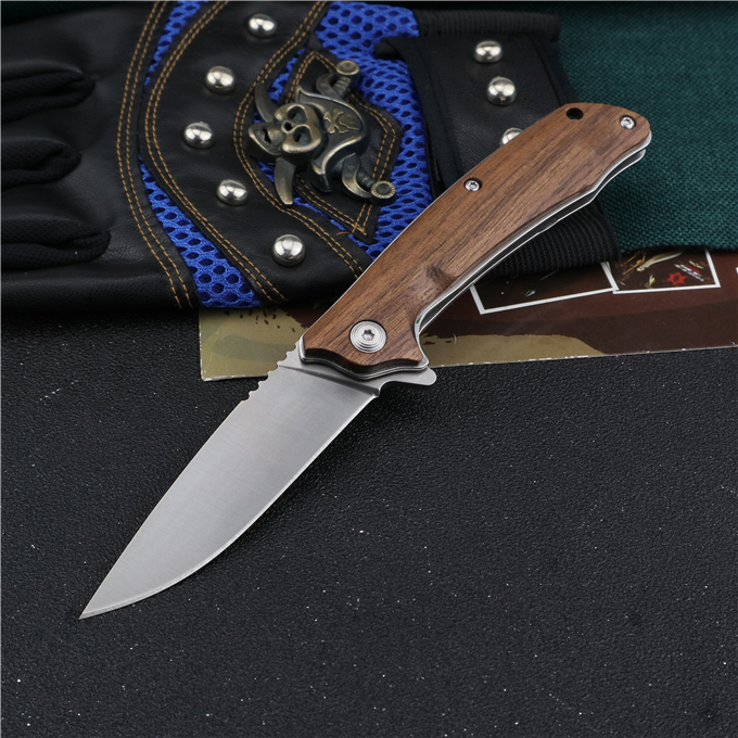 胡桃木轴承折刀 类型:轴承快开 全长:180mm 刃长:80mm 闭合长度:108mm 刃宽:20mm 钢材:8CR14MOV 硬度:58-59HRC 刃厚:2.5mm 表面:砂光 刀柄内衬:2.0mm不锈钢减重内片 刀柄:胡桃木 净重:57.3g