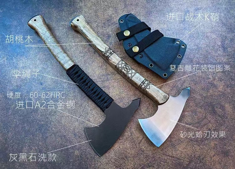 产地:美国公司授权国内代工生产出口、包装:盒子包装内带EVA、使用范围:户外野营、自驾游装备、日常军迷收藏、功能使用:砂光蛤刃设计是锋利度为主,可削纸、灰黑石洗V刃设计师以劈砍日常多用功能为主,好东西、永远留给有准备的人,高颜值、高品质、高性能户外求生必备营地斧