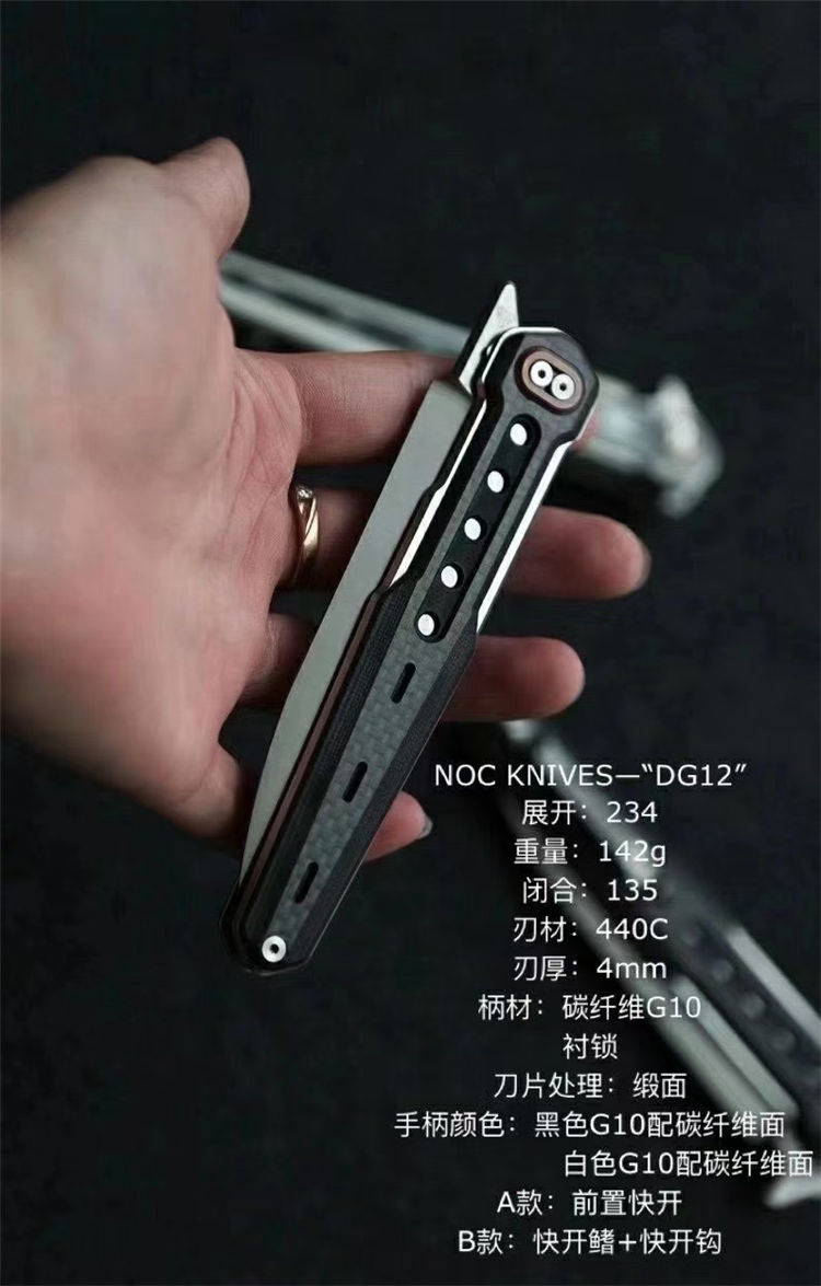 NOC DG12折刀 全长:234mm 折叠:135mm 刃材:440C 刃厚:4mm 柄材:炭纤维G10衬锁 刃材处理:缎面 重量:142g
