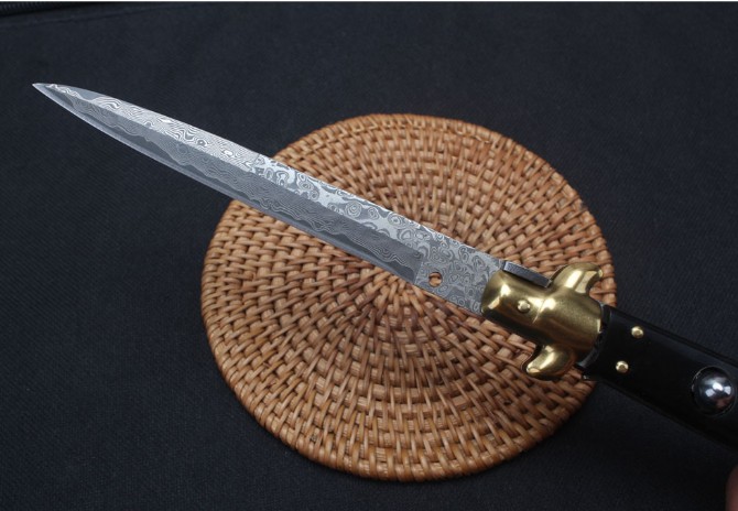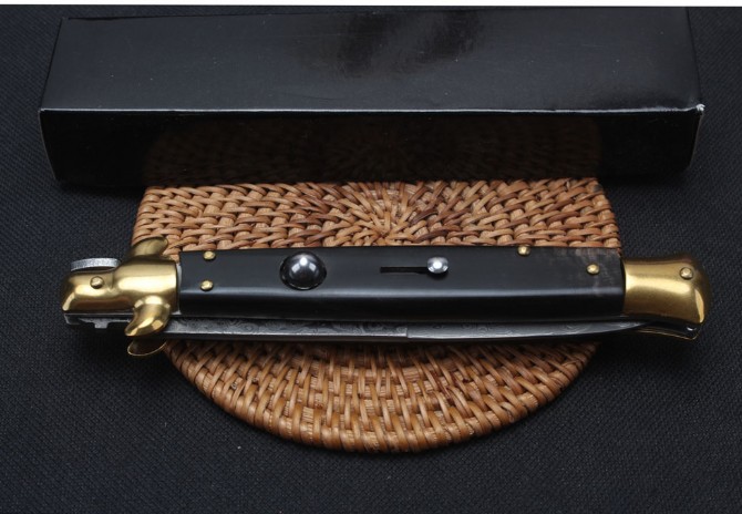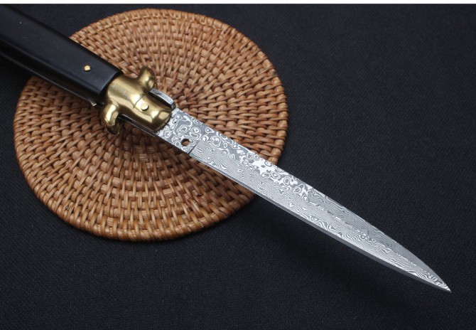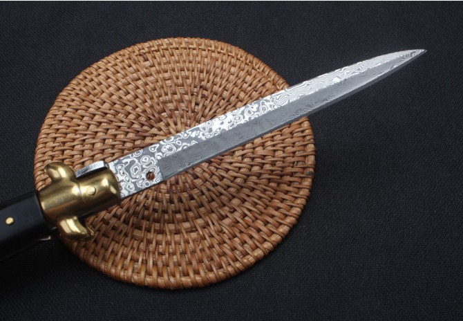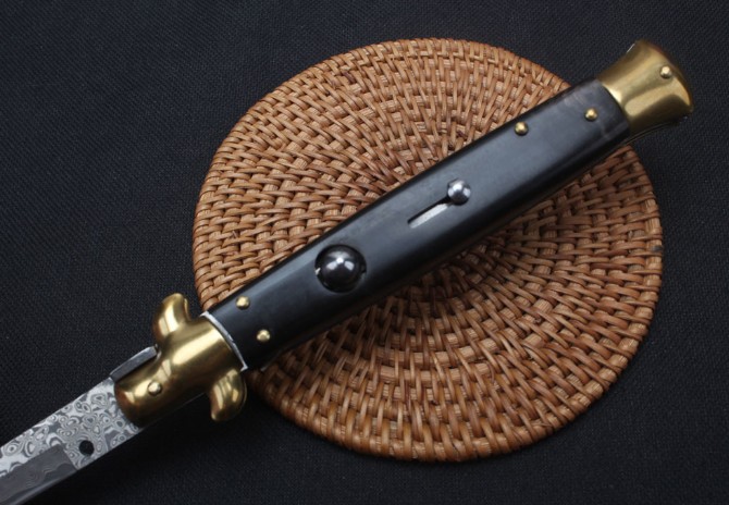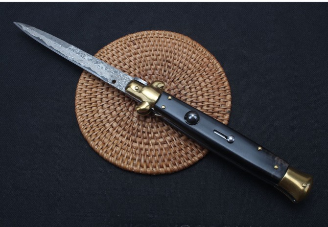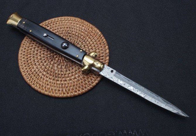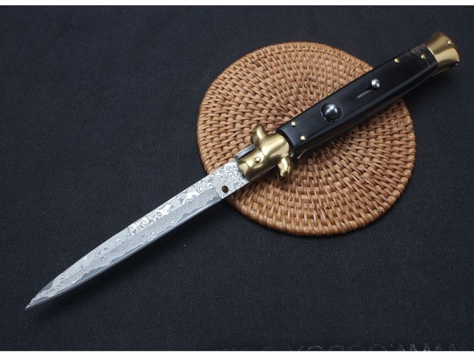 大马士革11寸黑牛角AKC意大利跳刀 全长:27.8cm 刃长:12.3cm 柄长:15.5cm 刃宽:1.4cm(最宽处) 刃厚:3.0mm 刃材:7铬17钼钒大马士纹 刀柄:黑牛角 表面:大马士纹 开刀方式:弹簧 重量:143克168毛重
