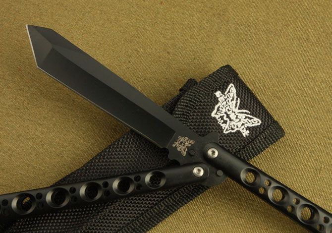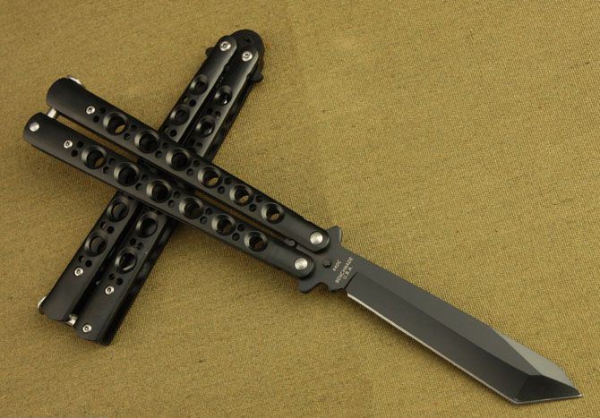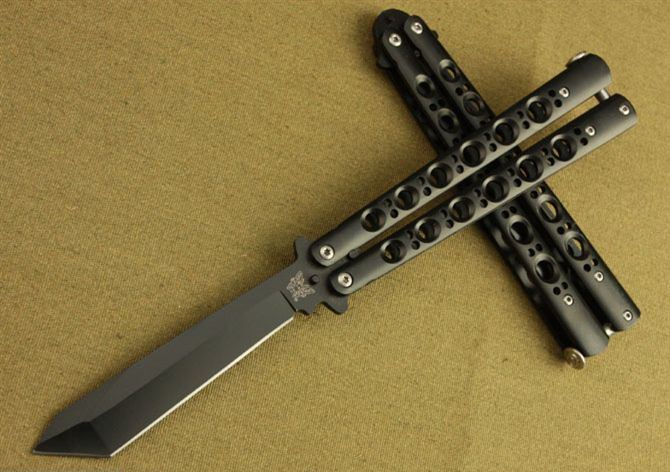 蝴蝶C47甩刀(黑色) 全长:23.5CM(打开) 刃长:10CM 刃厚: 0.28CM 刃材料:440C 硬度:57 净重:130克 总重量:180克 刀鞘:尼龙套