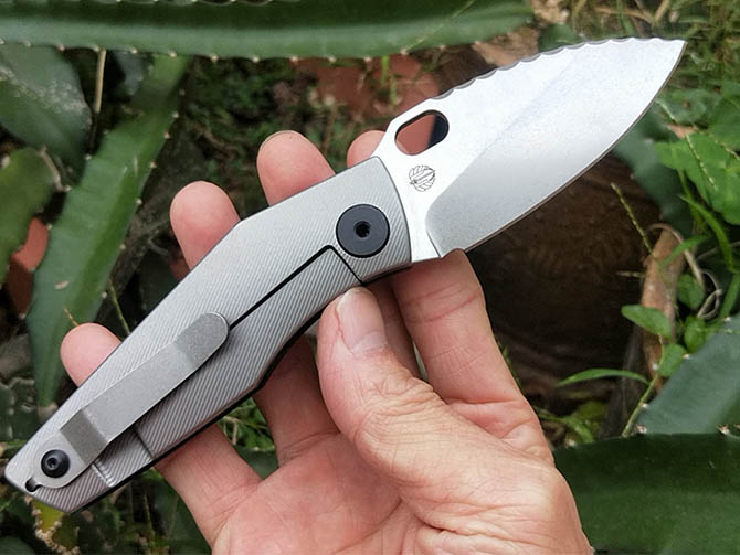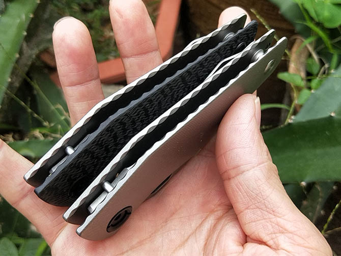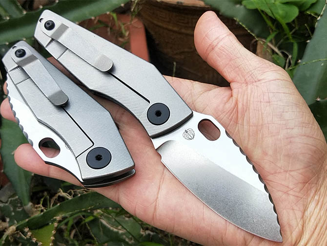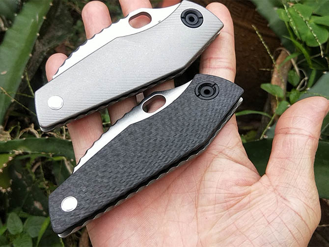米克D2钢折刀 总长:180mm 刃长:70mm 柄长:110mm 厚度:3.5mm 刃宽:35mm 表面:石材清洗 系统:铜垫片 硬度:59-60HRC 净重:CF98gG10102gti120g 材质:D2(100%D2) 柄材:碳纤维+钛,CNC切割,成型工艺