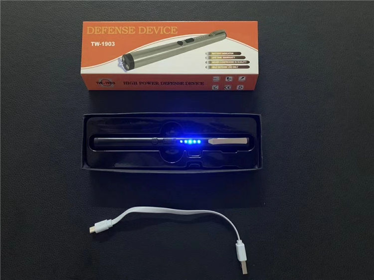 TW钢笔1903电棍 全长:15.5厘米 直径:1.4厘米 带电量显示真正的小身板大能量,电压最高峰值达到了9500万伏,体积不到相同威力机型的一半,此款新机型带有电量显示(很罕见),采用常见的USB micro充电插口,可以使用手机充电器,或者电脑上的USB接口都可以充电。尾部带有挂扣,像钢笔一样可以挂在胸前和裤兜内外,有很好的隐蔽性,轻松携带到户外