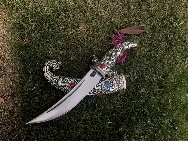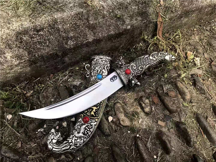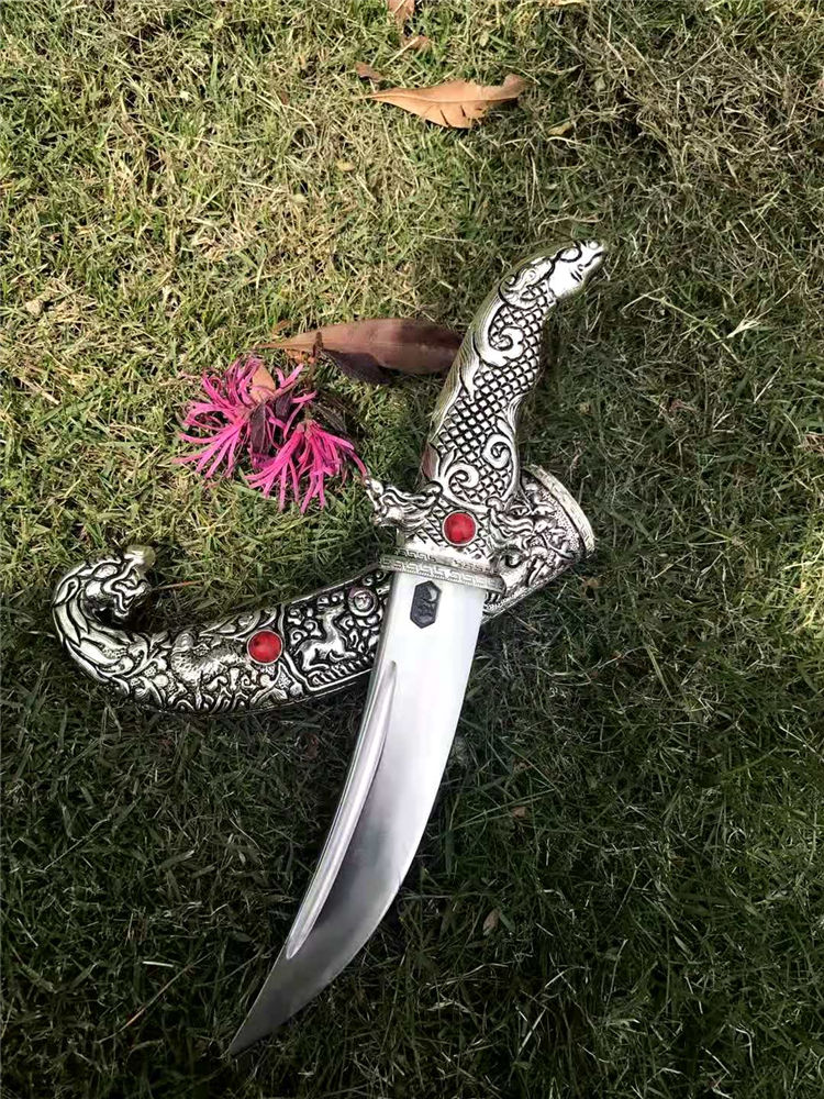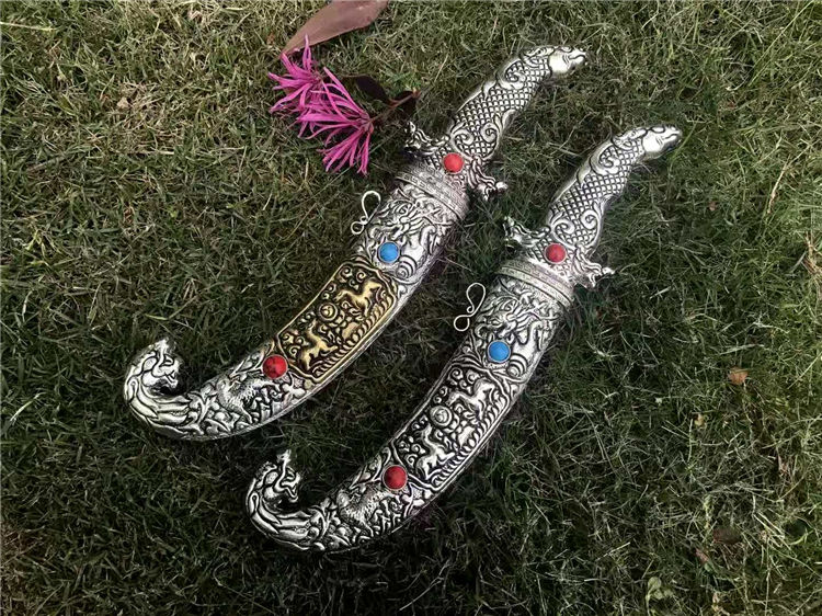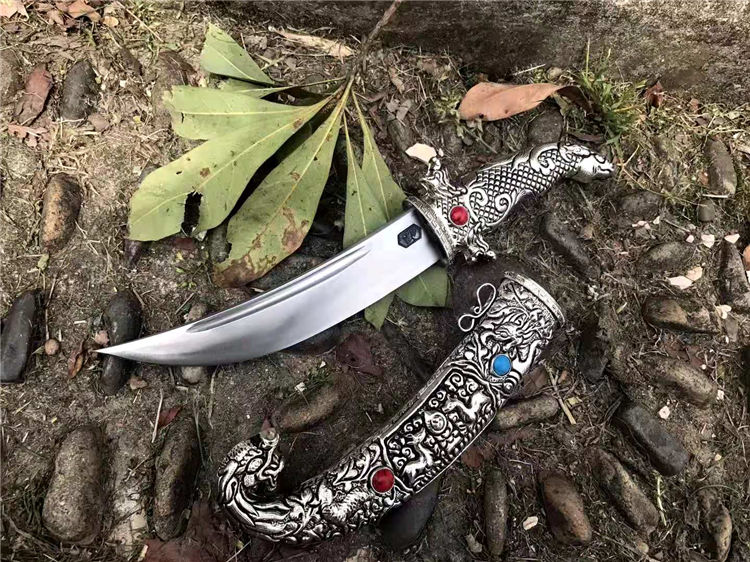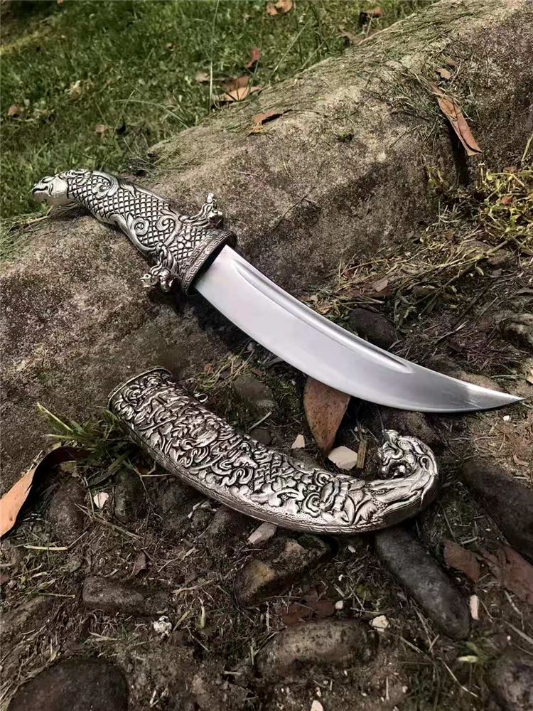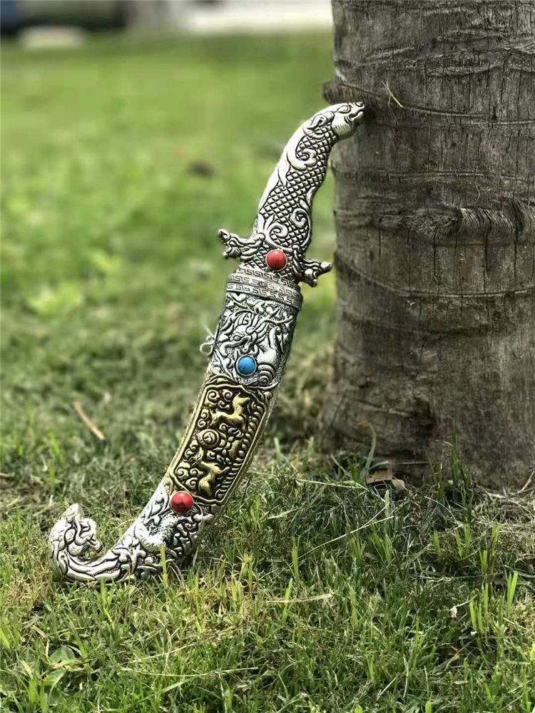 藏刀蒙古弯刀 全长:30cm 刃长:18cm 柄长:12cm 刃宽:3cm 刃材:弹簧钢锻打 鞘材:藏银 硬度:高达60°