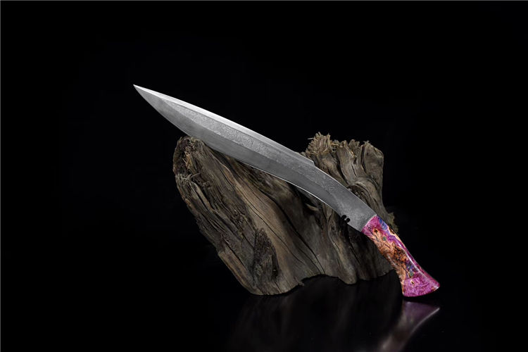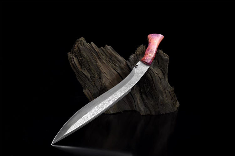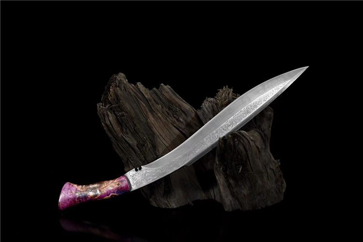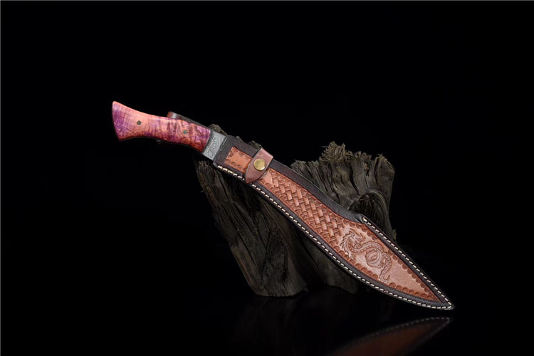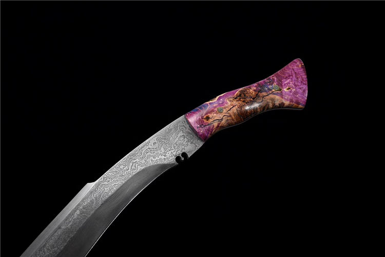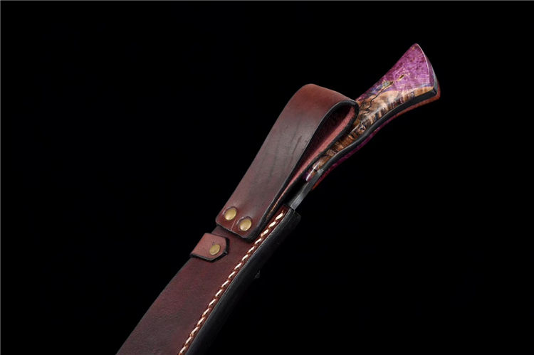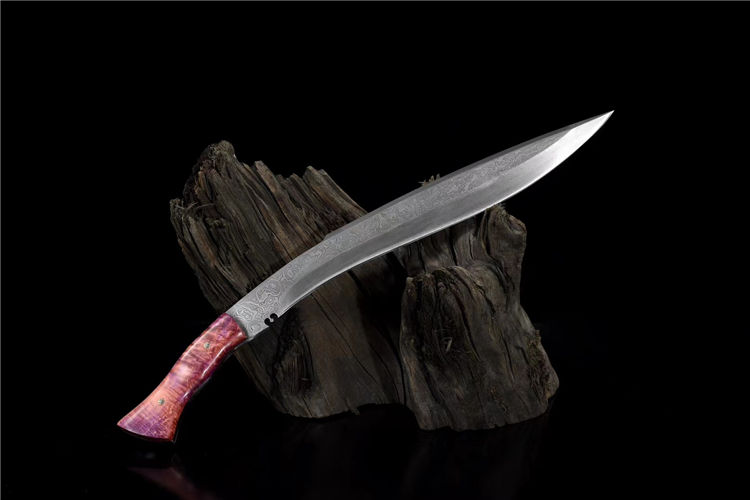 诸神狗腿弯刀(非量产) 工艺:龙泉古法传统手工艺 规格:长46cm 重:550g(少许误差) 护手:纯铜 刃材:自炼大马 柄材:稳定化木柄 鞘材:手工牛皮鞘 赠品:精美锦盒、养护油、布