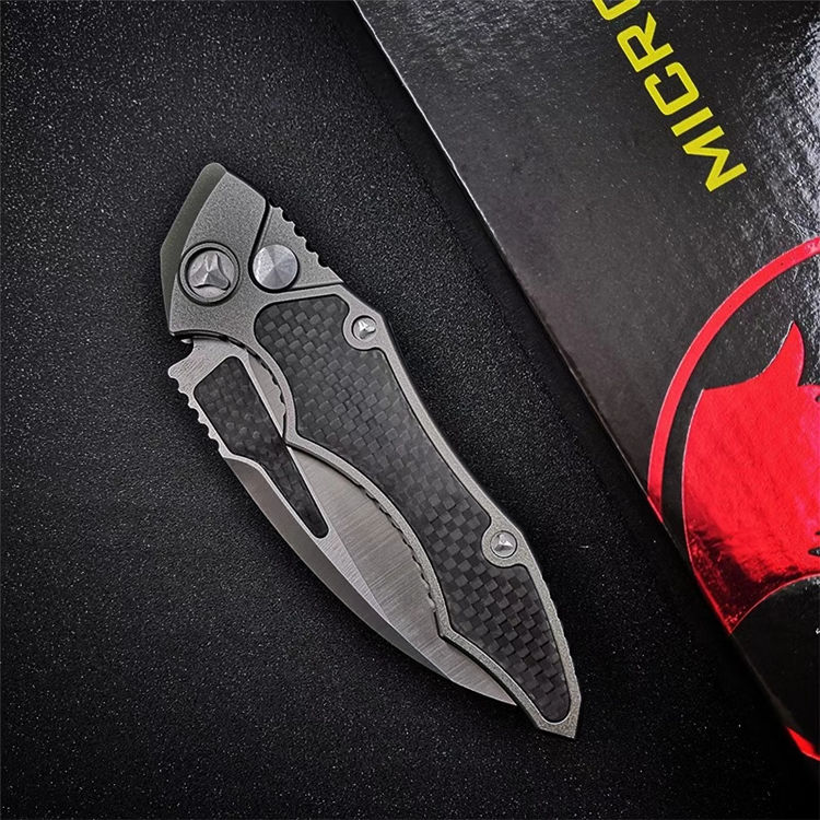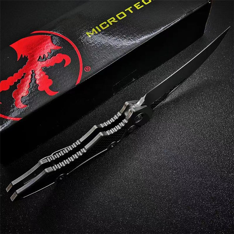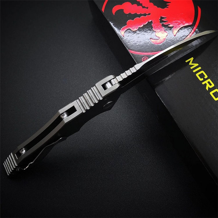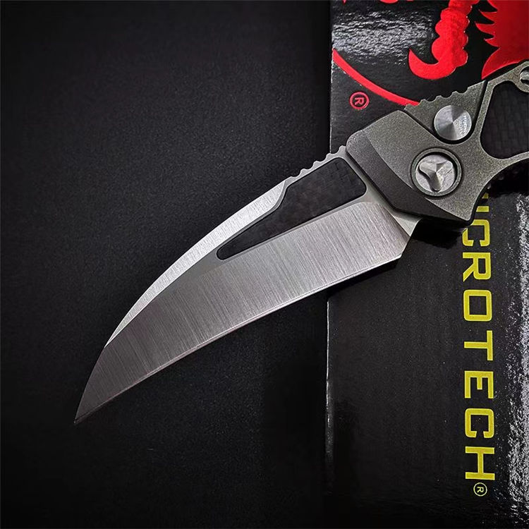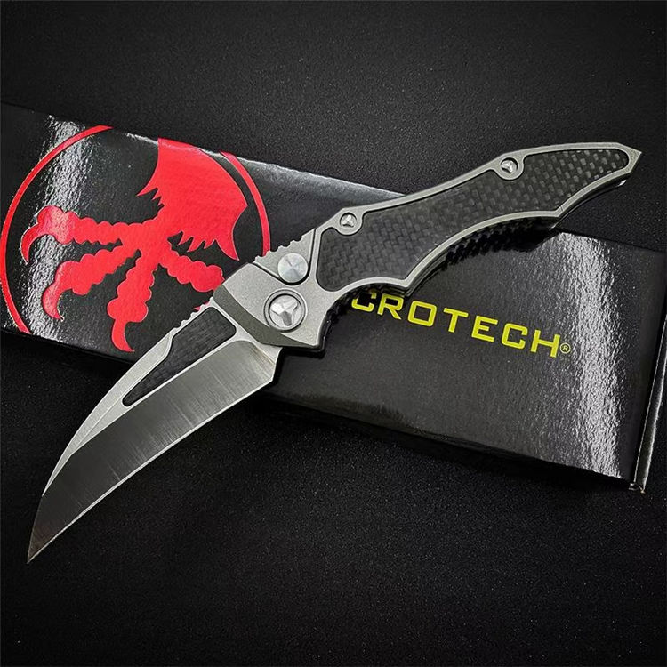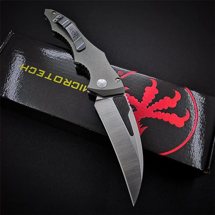 微技术HAWK侧开跳刀 全长:230mm 刃长:95mm 闭合:135mm 刃厚:4mm 刃材:D2 柄材:航空铝+碳纤 硬度:56-58HRC 净重:127g