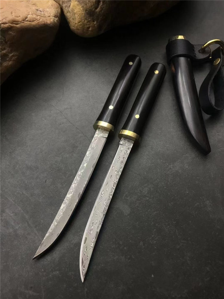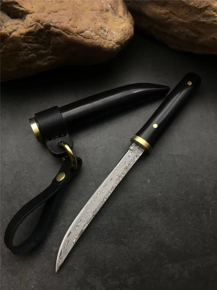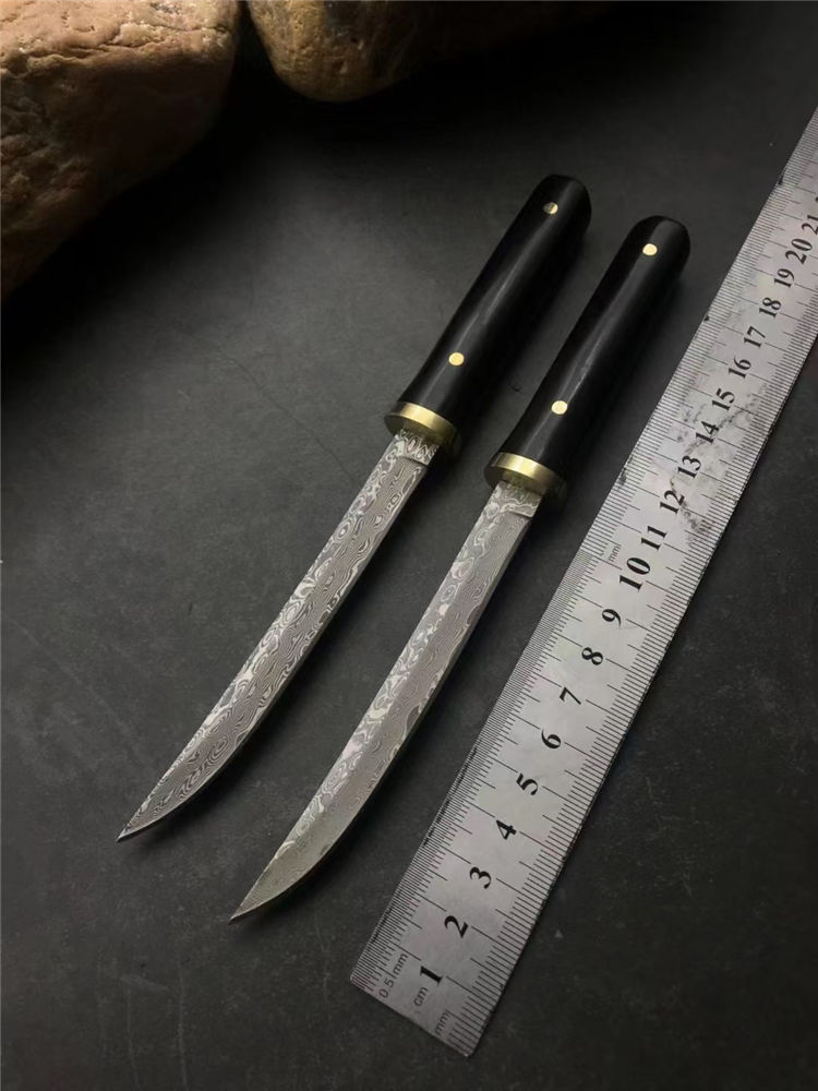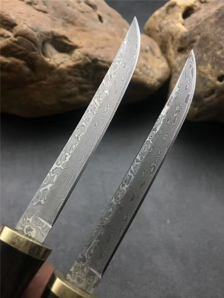 大马士革迷你肋差武士 全长:19CM 刃长:11CM 柄长:8CM 刃厚:2MM 刃宽:1.1CM 刃材:大马士钢夹VG10 硬度:59-60HRC 表面:捶打大马士革钢形成花纹,进行平磨水磨开刃刀 柄:黄铜+黑檀刀 套:黑檀 重:84克 其它:配包装盒