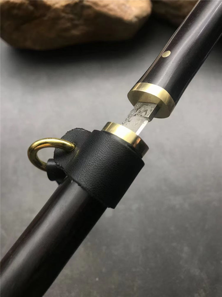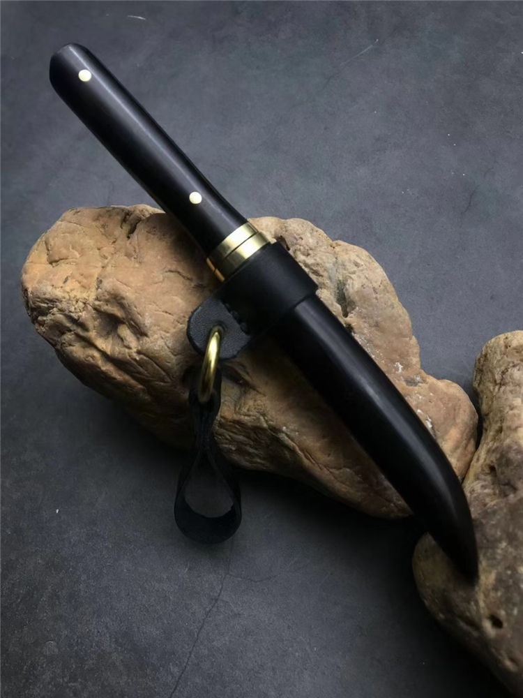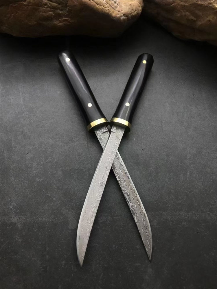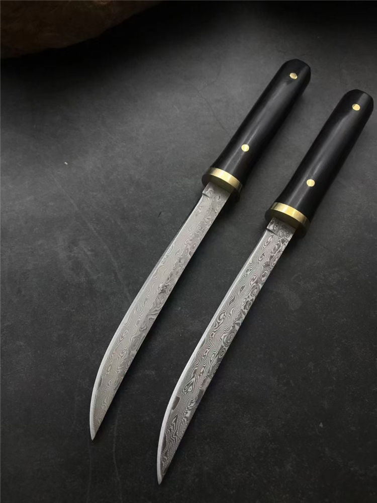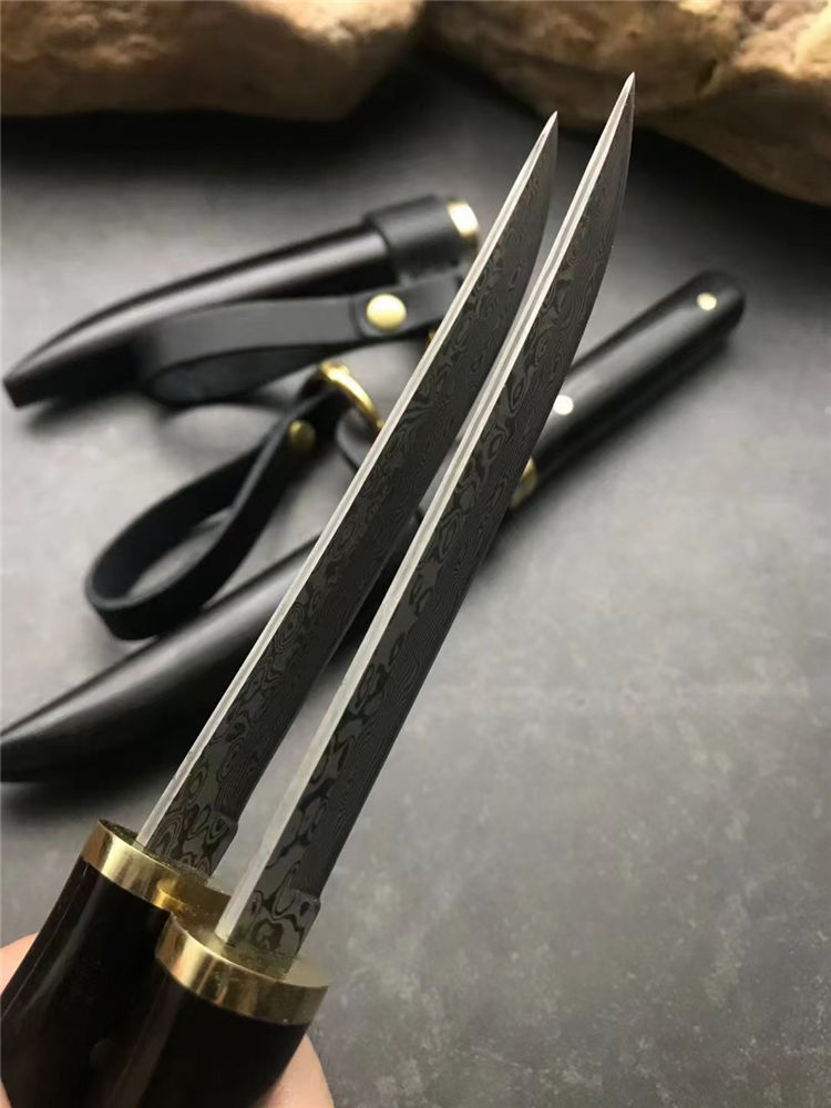 大马士革迷你肋差武士 全长:19CM 刃长:11CM 柄长:8CM 刃厚:2MM 刃宽:1.1CM 刃材:大马士钢夹VG10 硬度:59-60HRC 表面:捶打大马士革钢形成花纹,进行平磨水磨开刃刀 柄:黄铜+黑檀刀 套:黑檀 重:84克 其它:配包装盒