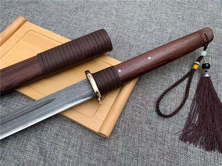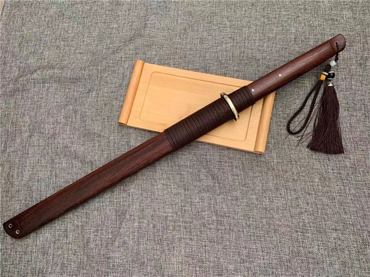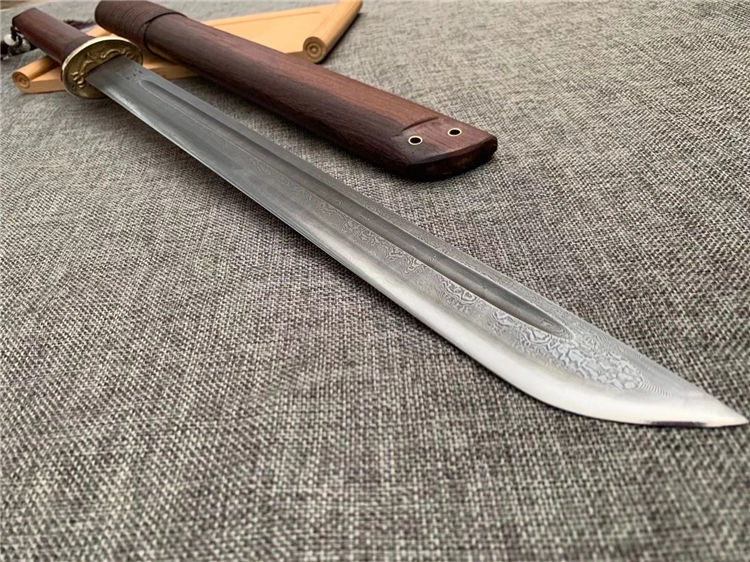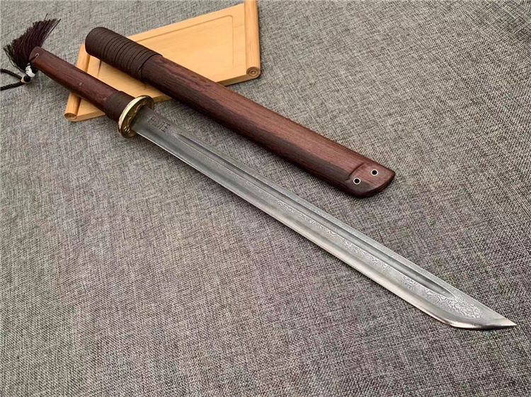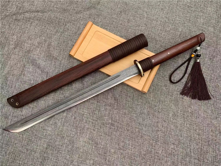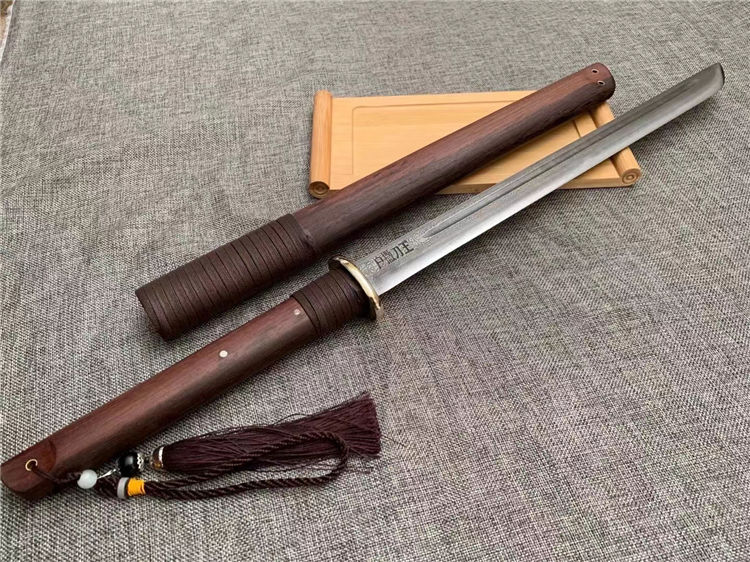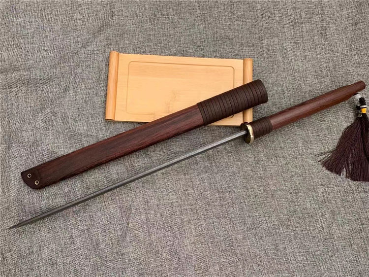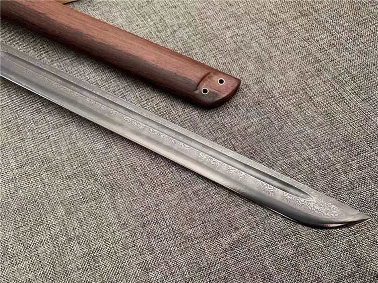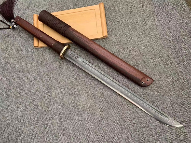 正品户撒唐刀 全长:70cm 刀宽:3.5cm 刃材:花纹钢手工锻打 刀鞘:为黑鸡翅刀木 传统工艺,此刀手感非常好,重量适合,钢火更是好,锋利耐用持久性能相当好