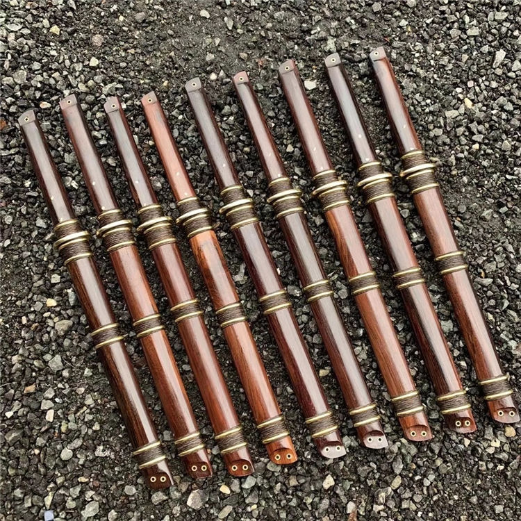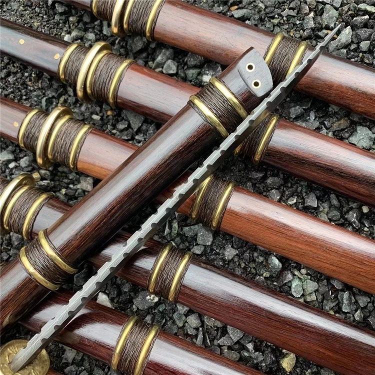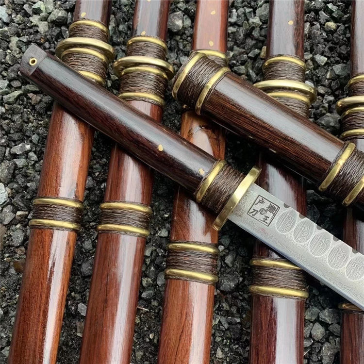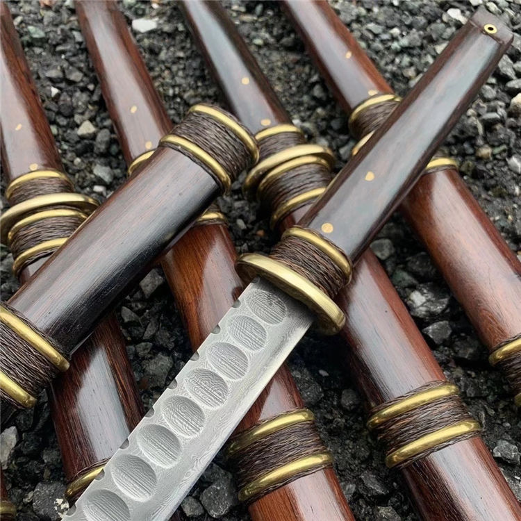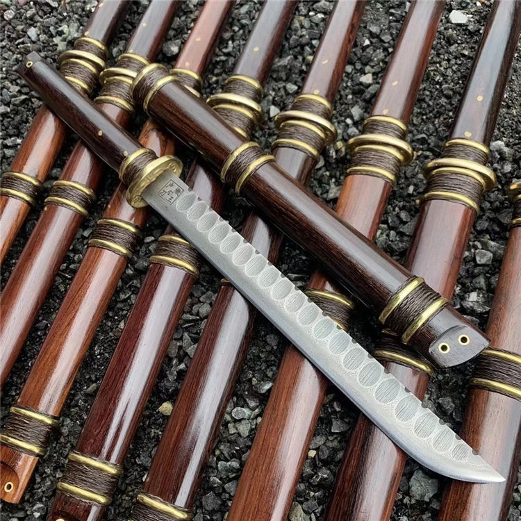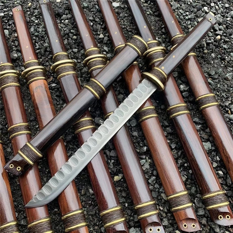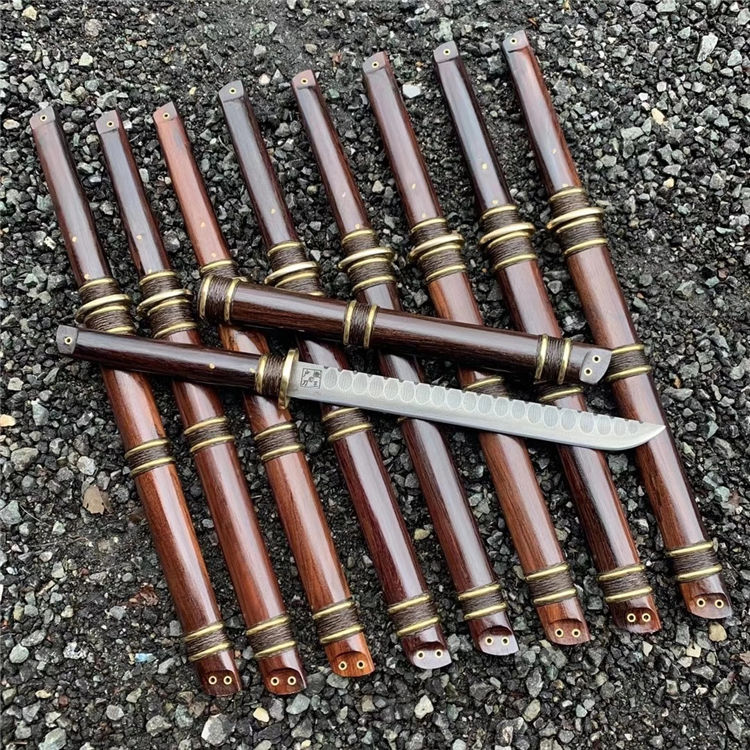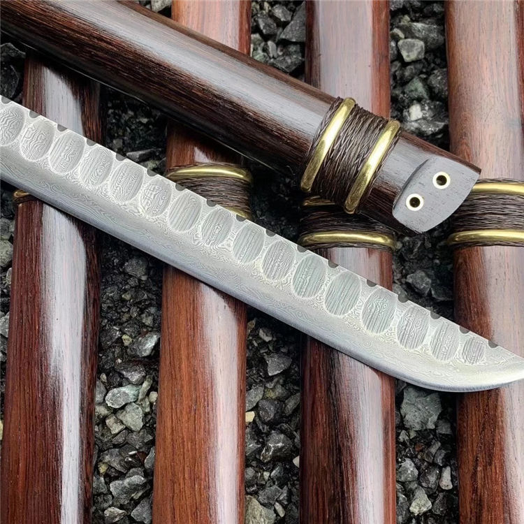 正品户撒刀博弈猎刀 总长:53.5cm (左右) 刃长:30.5cm 柄长:20cm 刃宽:3.2cm(最宽处) 刃厚:0.9cm 刃材:折叠锻打花纹钢 柄材:黑酸枝木