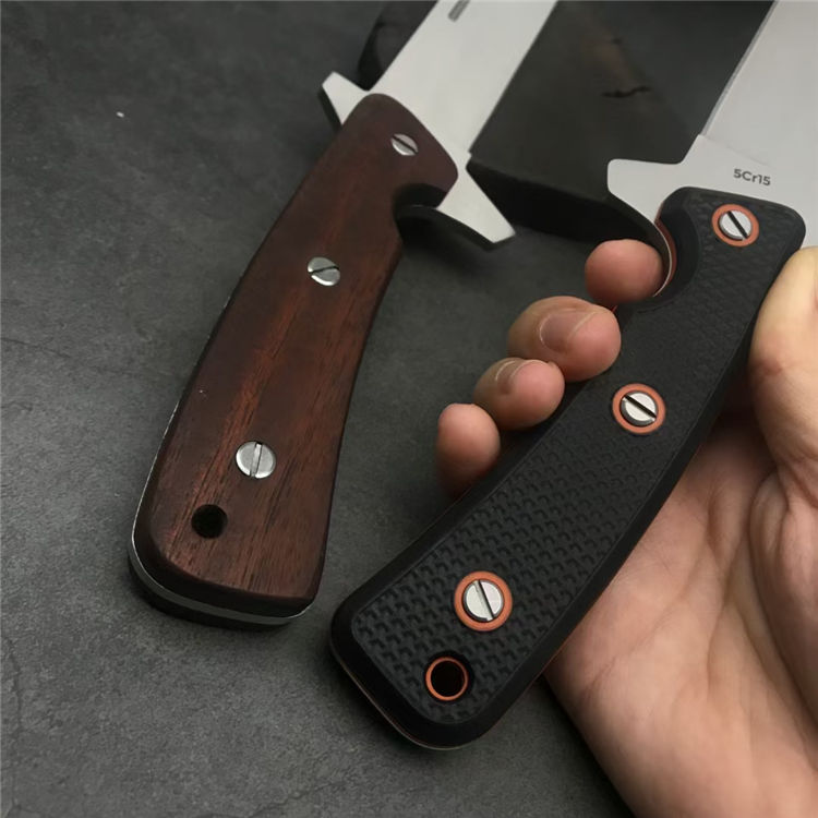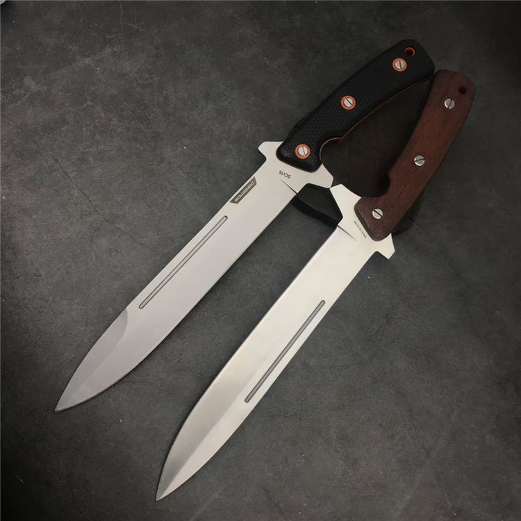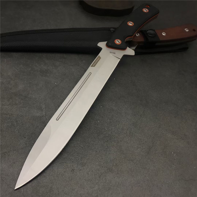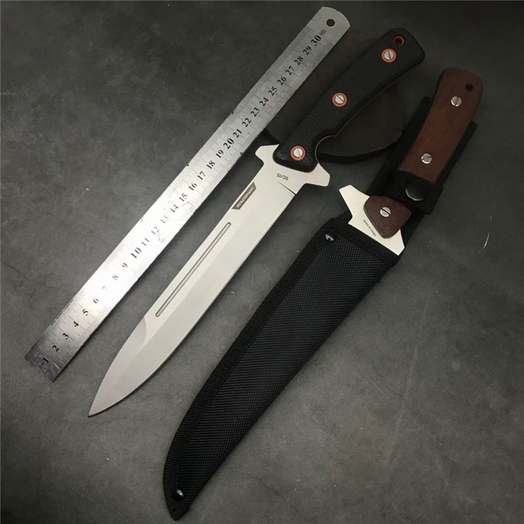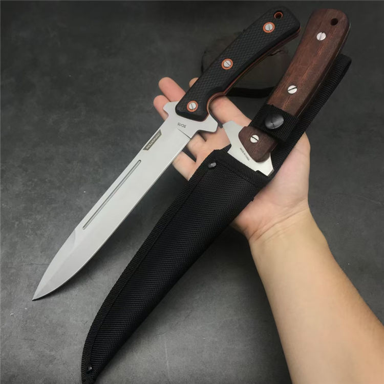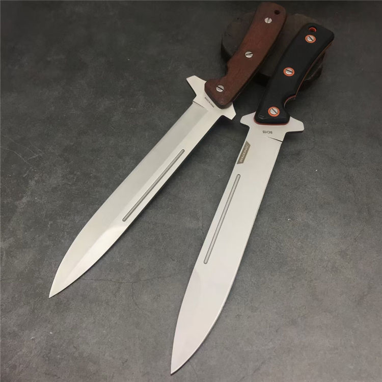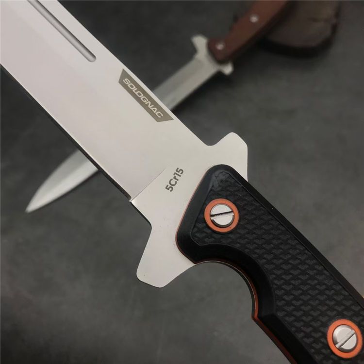 Solognac狩猎直刀 品牌:Solognac狩猎军刺一体钢 全长:33cm 刃长:20cm 柄长:13cm 刃宽:3cm(最宽处) 刃厚:3.5mm 刃材:5CR15MOV 硬度:56-58HRC 刀柄:实木(红手柄)PP(黑色柄) 表面: 沙光刀 静重: 276克 重量:335克(含刀套) 备注:配刀套