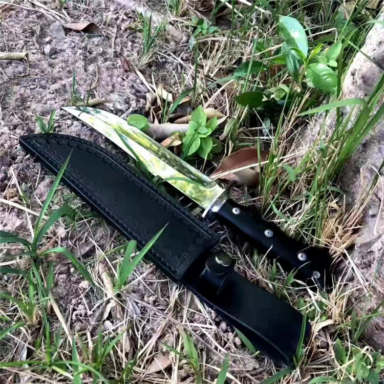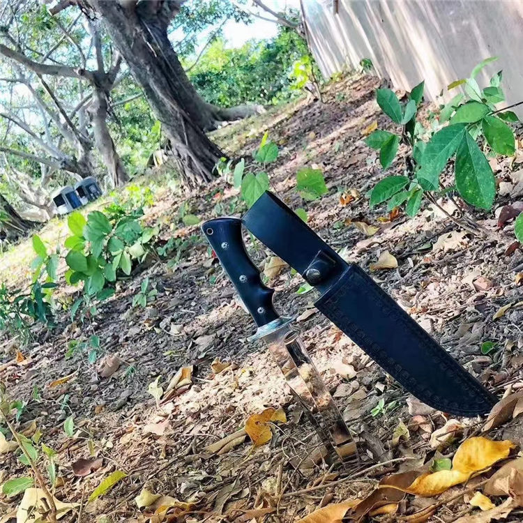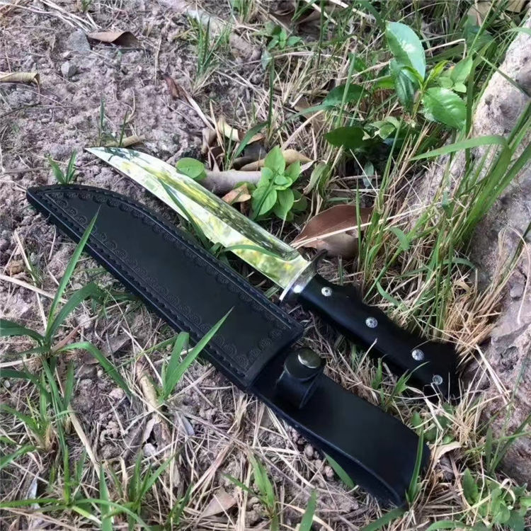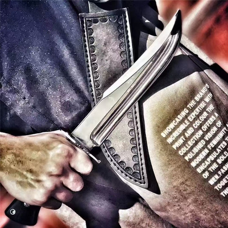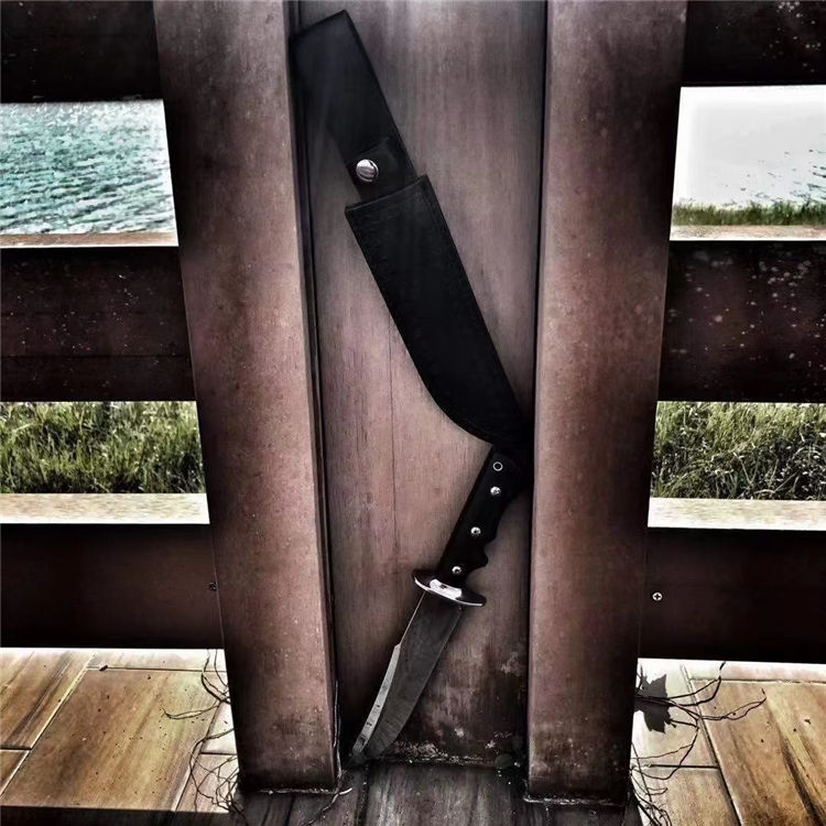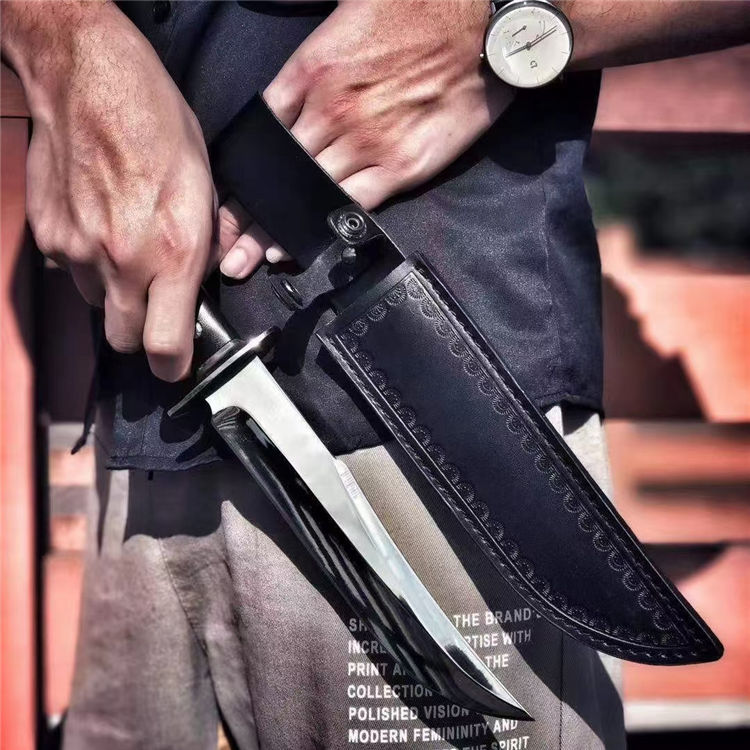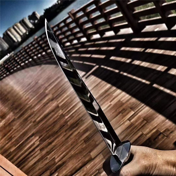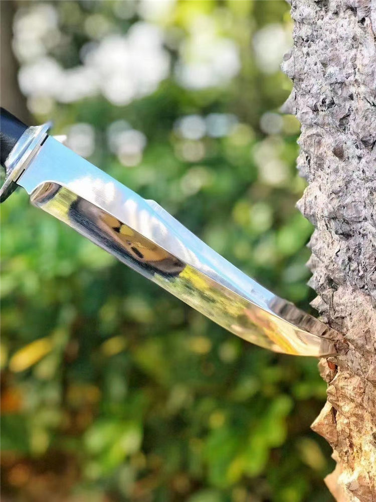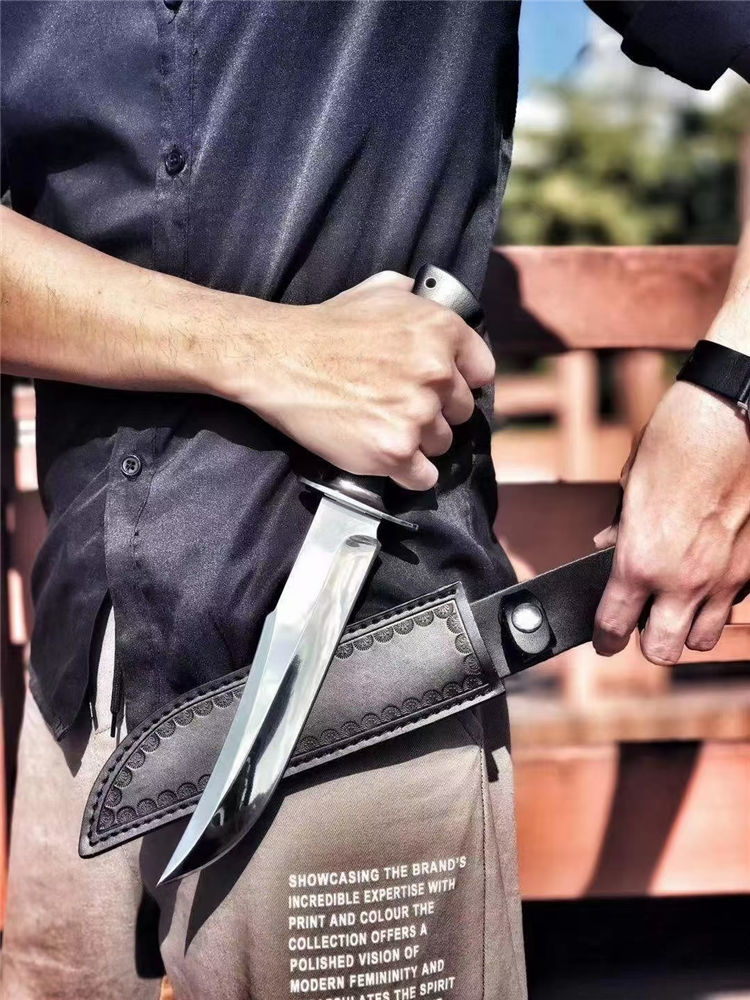 超镜光勇者军刀 全长:33cm 刃长:20.5cm 刃宽:3.5cm(最宽处) 柄长:12.5cm 刃材:DC53 刃厚:6.5mm 硬度:60HRC{真空热处理) 表面:镜光 柄材:黑色G10 重量:405克(含套) 刀套:皮套