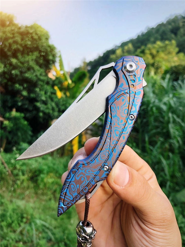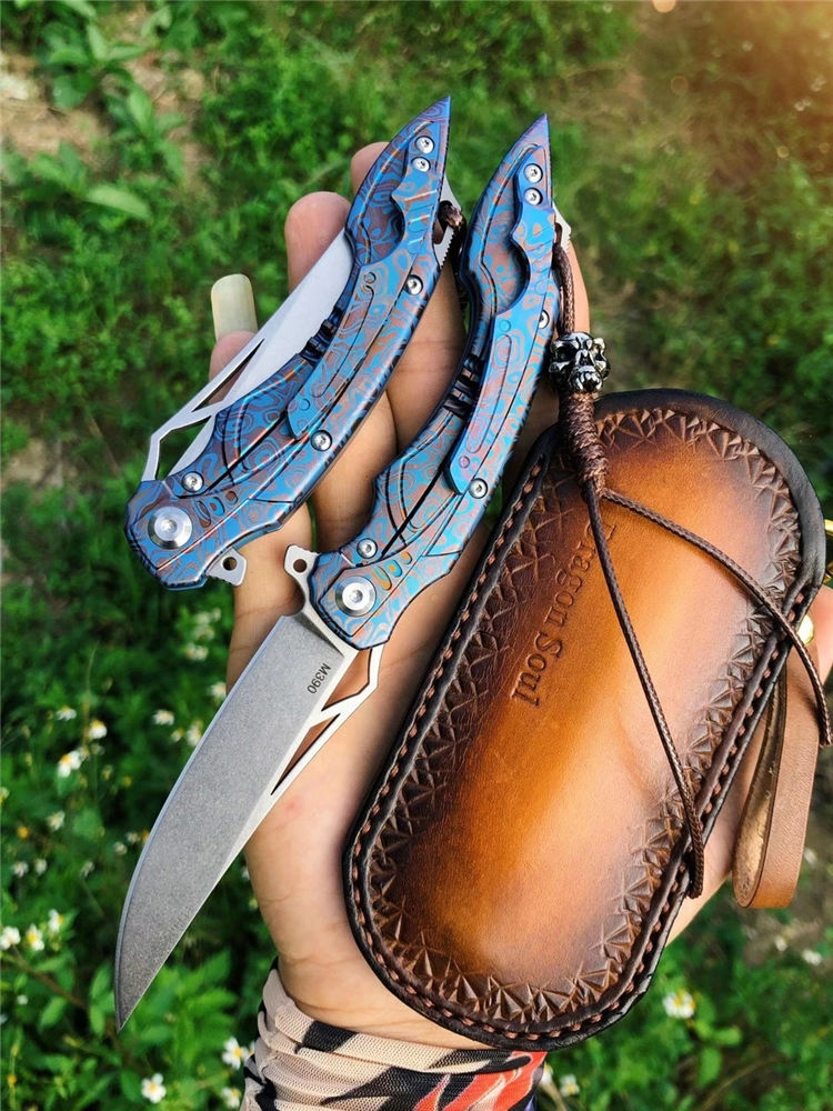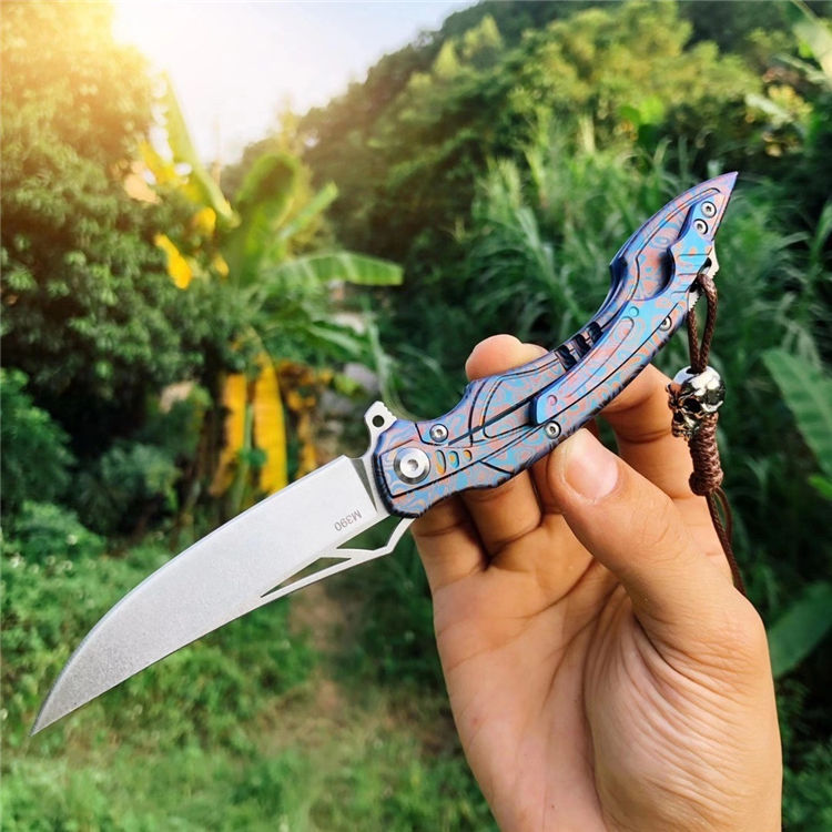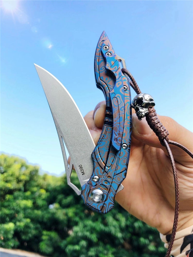 M390蓝枪鱼折刀 总长:20cm 刀刃:8.5cm 折合:11.5cm 刃厚:3MM 刃宽:2.9cm 刃材:奥地利M390粉末钢(支持官方专业钢材数据分析) 热处理:专业上海真空热处理真空深冷油淬 硬度:60-62HRC 柄材:TC4钛合金 结构:陶瓷滚珠轴承 重量:净重95克 包装:骷髅吊坠+手工皮套+原厂黑色盒