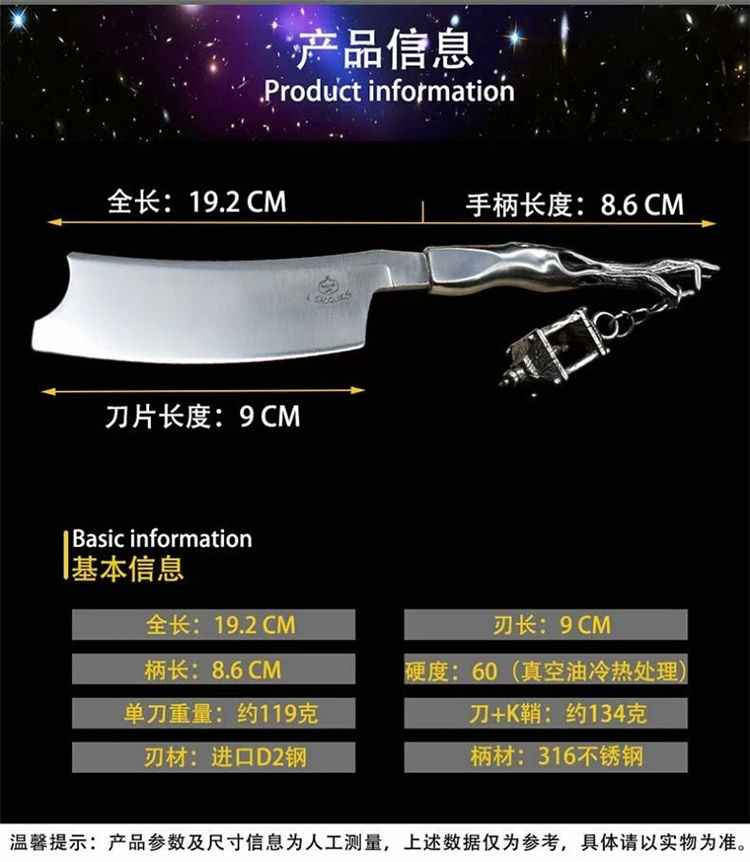 正品艺术剃刀 全长:19.2CM 刃长:9CM 柄长:8.6CM 硬度:60(真空油冷热处理) 单刀重量:约119克 刀+K鞘:约134克