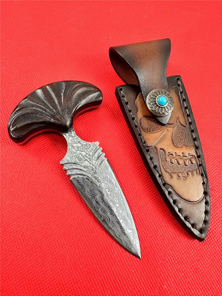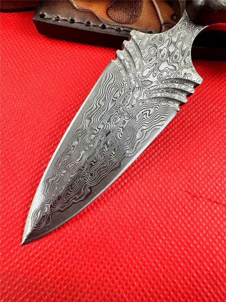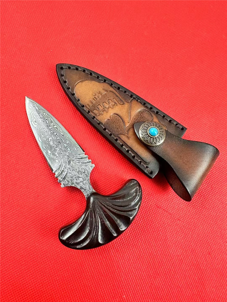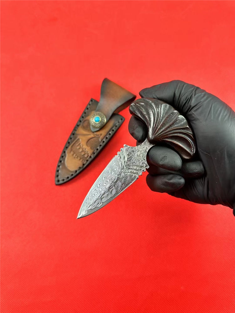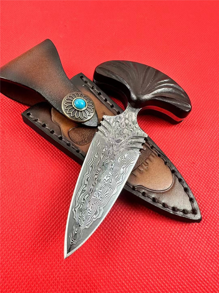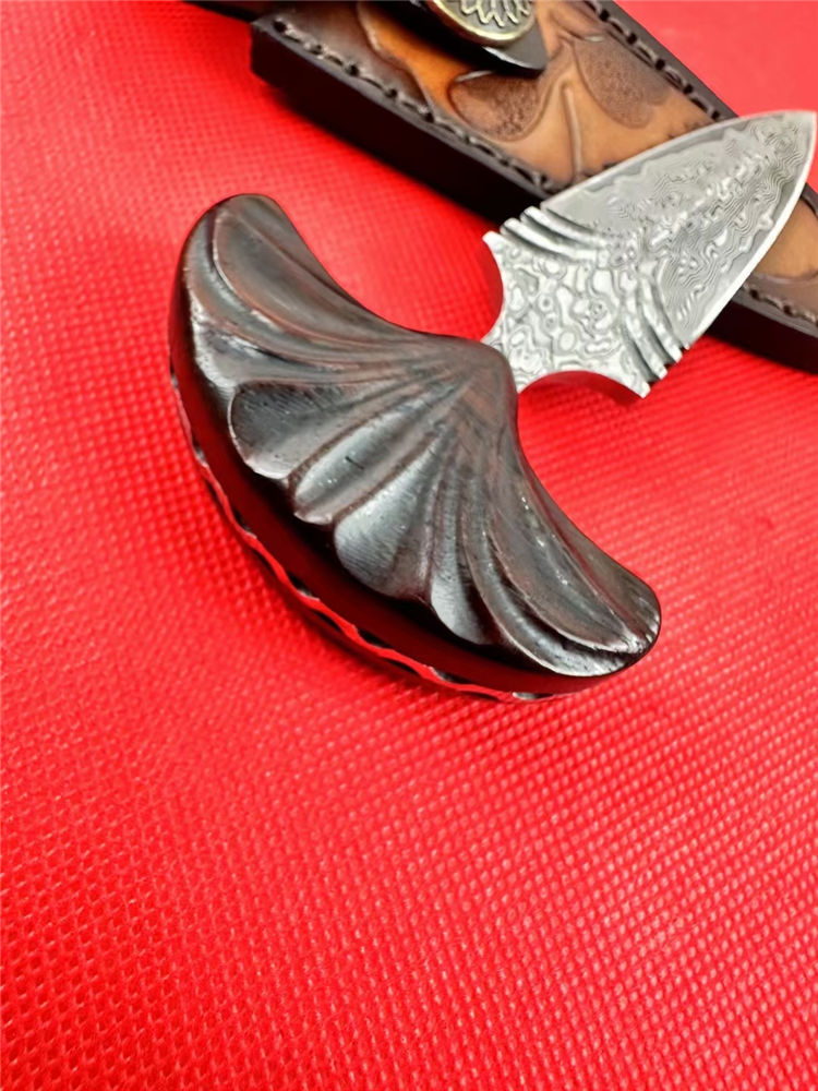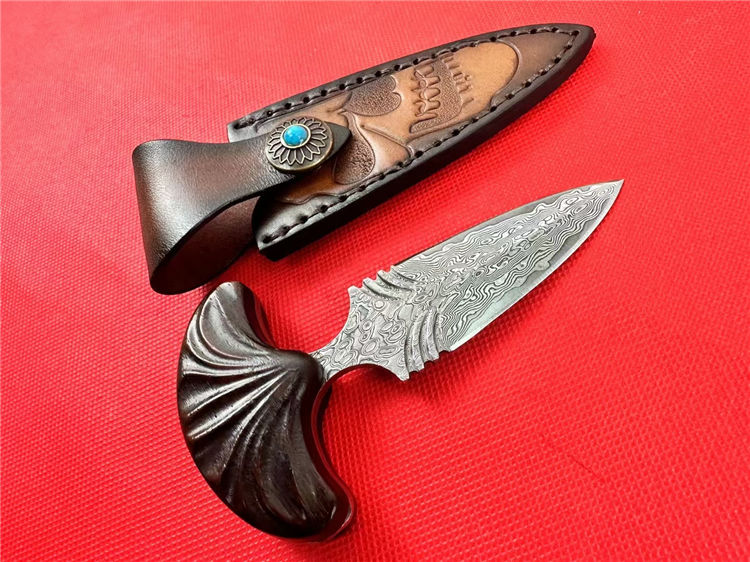 大马士革扇刺手刺 总长:12cm 刃长:7cm 柄长:5cm 刃厚:4.5mm 开刃方式:手工二次开刃 钢材:一体大马士革钢(68层) 硬度:60HRC 柄材:红檀木 皮套:手工制作牛皮套+保养油