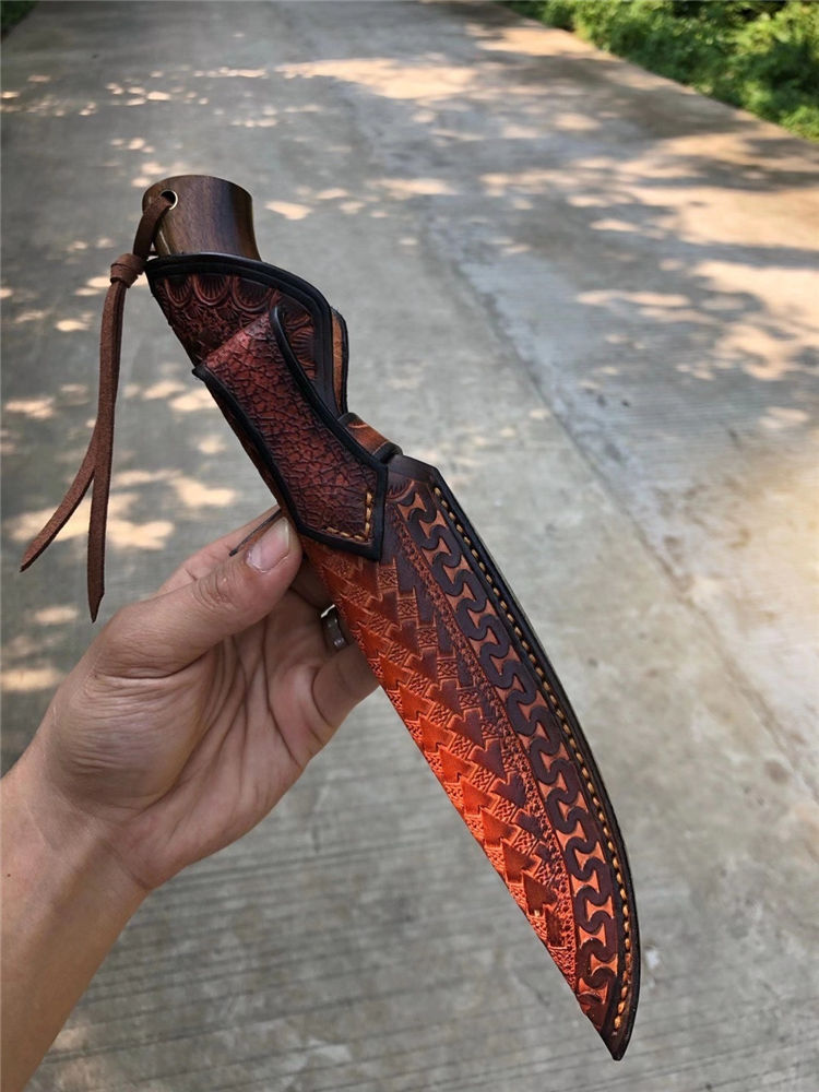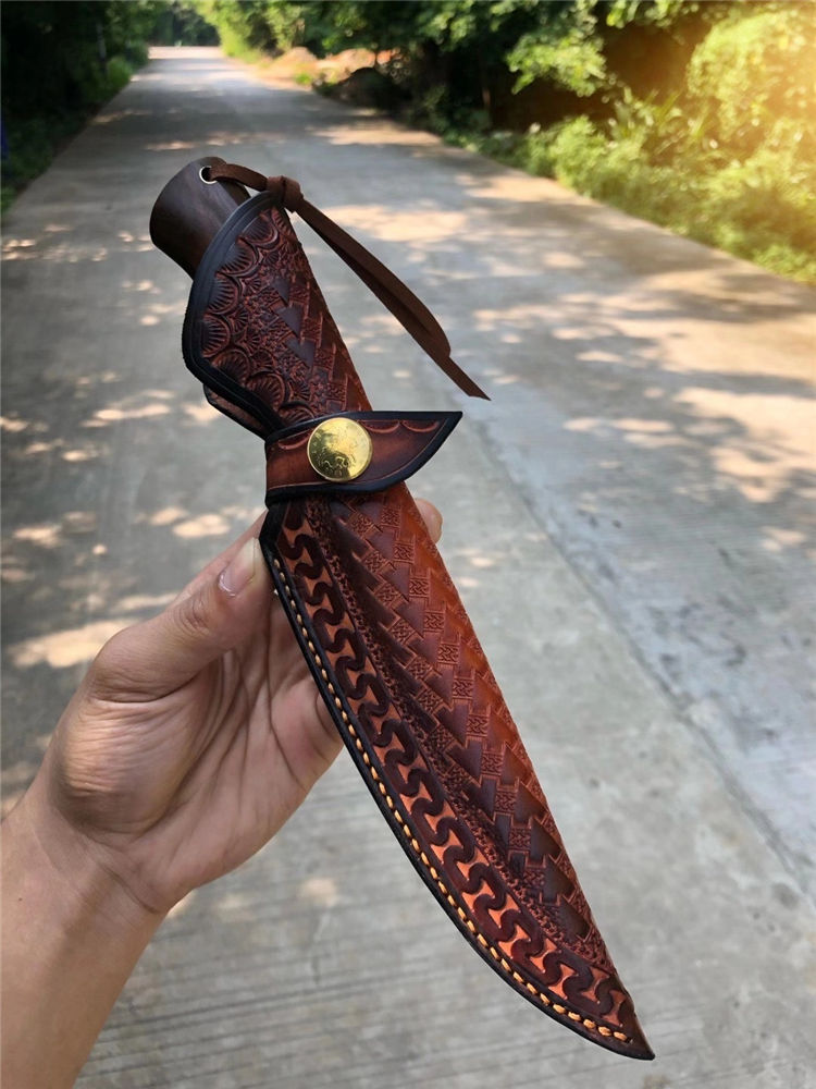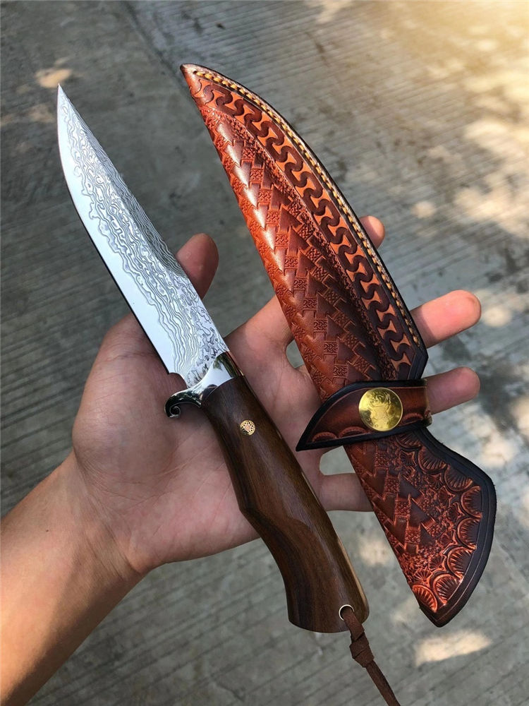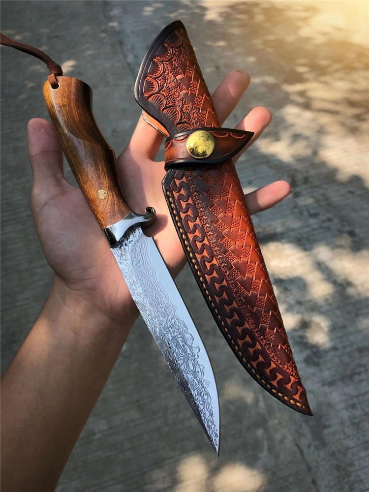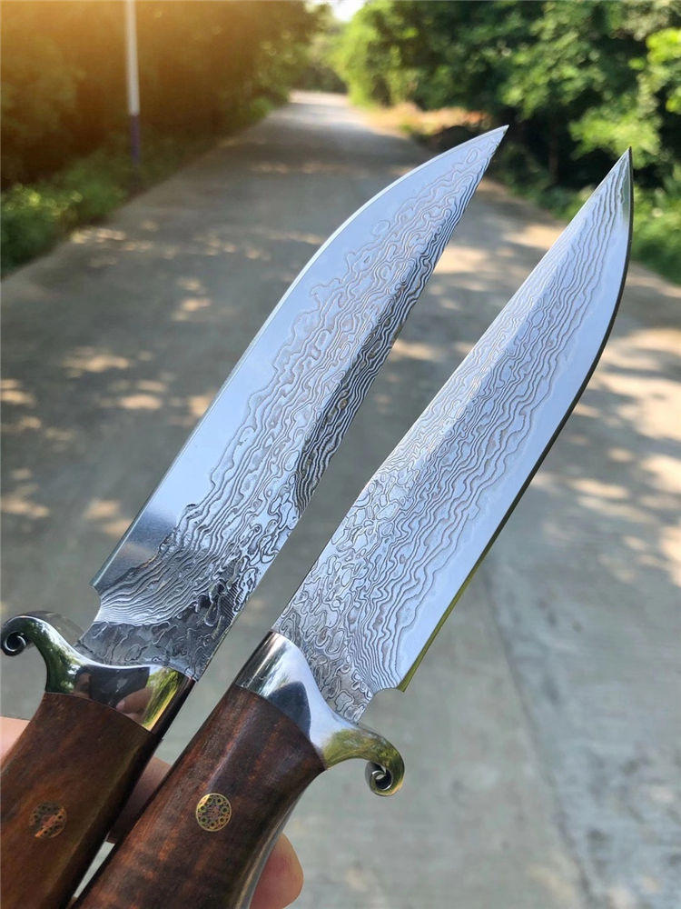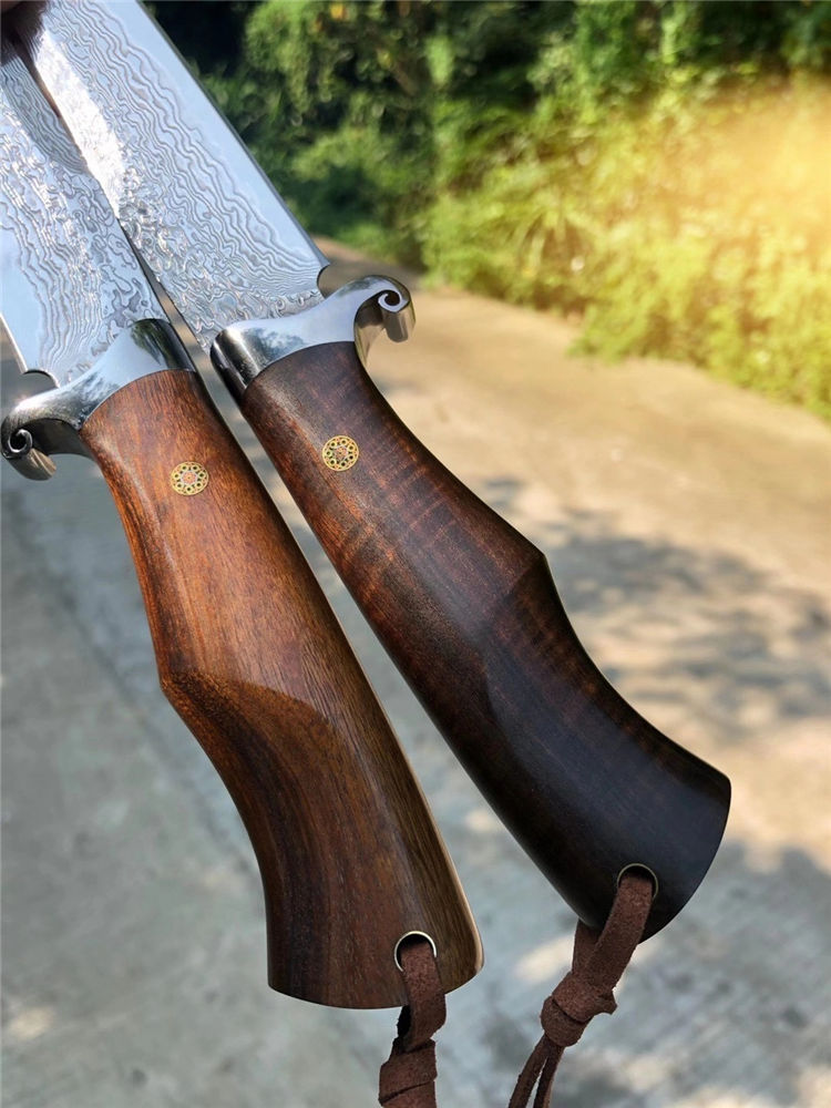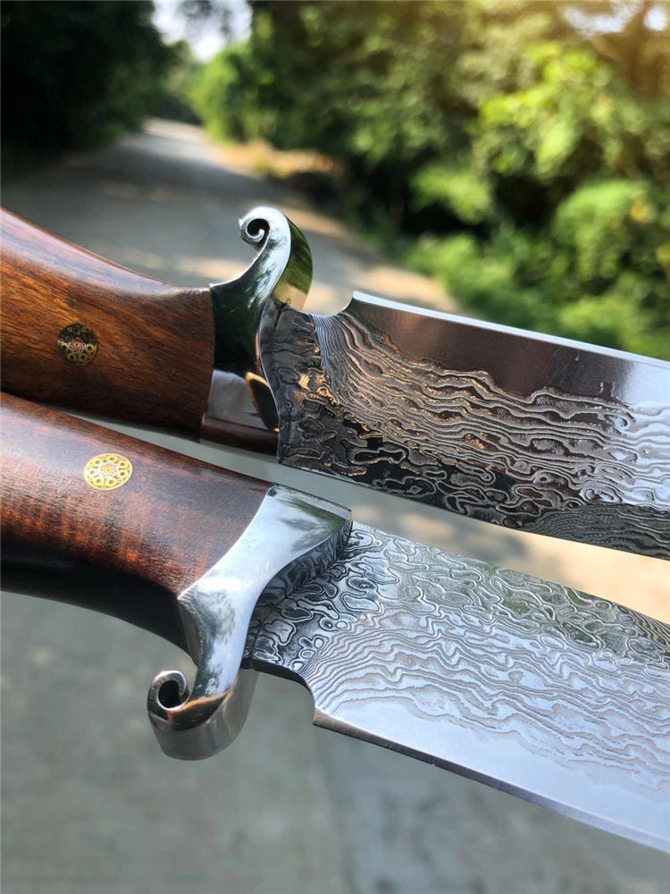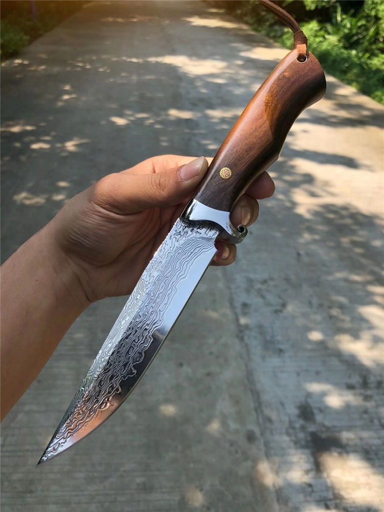 大马士革征途直刀 总长:26cm 刀刃:13cm 手柄:12cm 刃宽:2.8cm 钢材:大马士革钢85层 厚度:3.9MM 硬度:60HRC 开刃方式:手工二次开刃 柄材:进口沙铁木