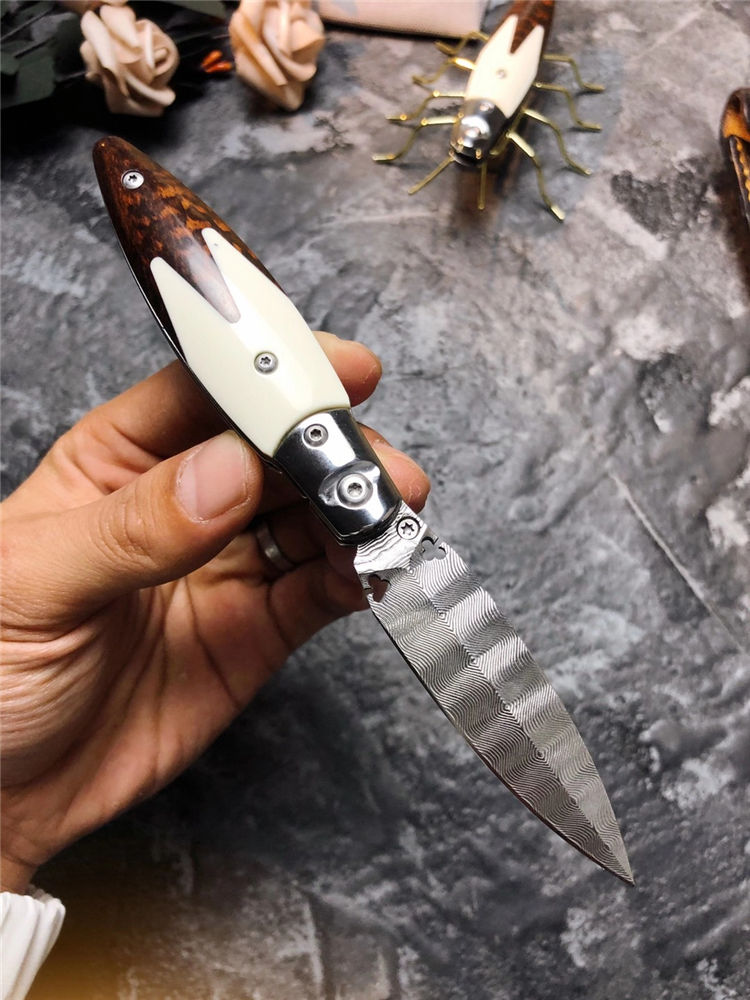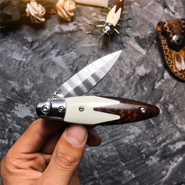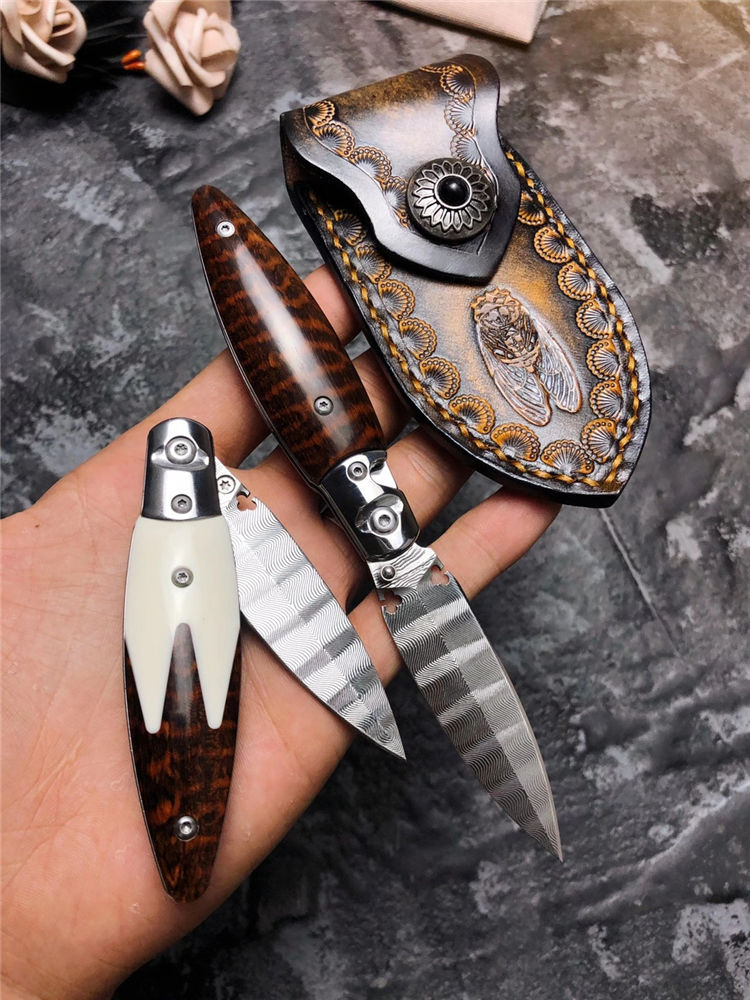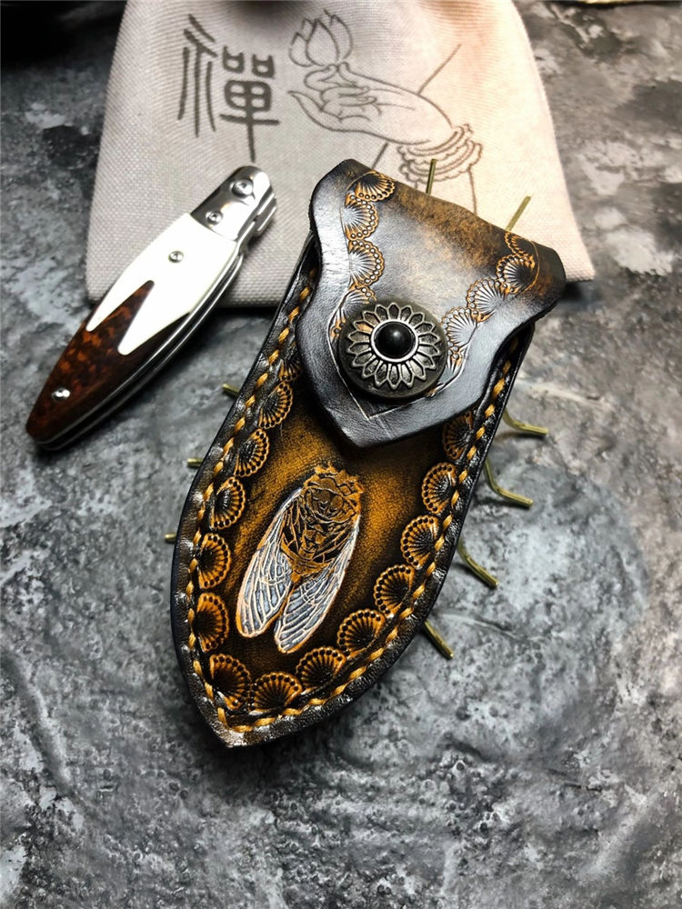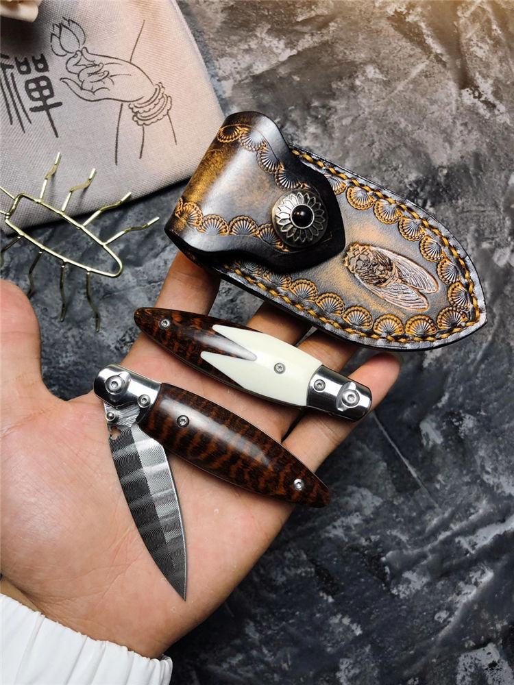 大马士革金蝉折刀 总长:16cm 刃长:7cm 折合:9cm 刃厚:3MM 刃宽:1.8cm 钢材:进口锻造大马士革钢 硬度:60HRC 柄材:钢头+白牛骨片+进口蛇纹木 皮套:意大利植鞣皮纯手工制作,蝉雕图案,手工缝线着色皮套