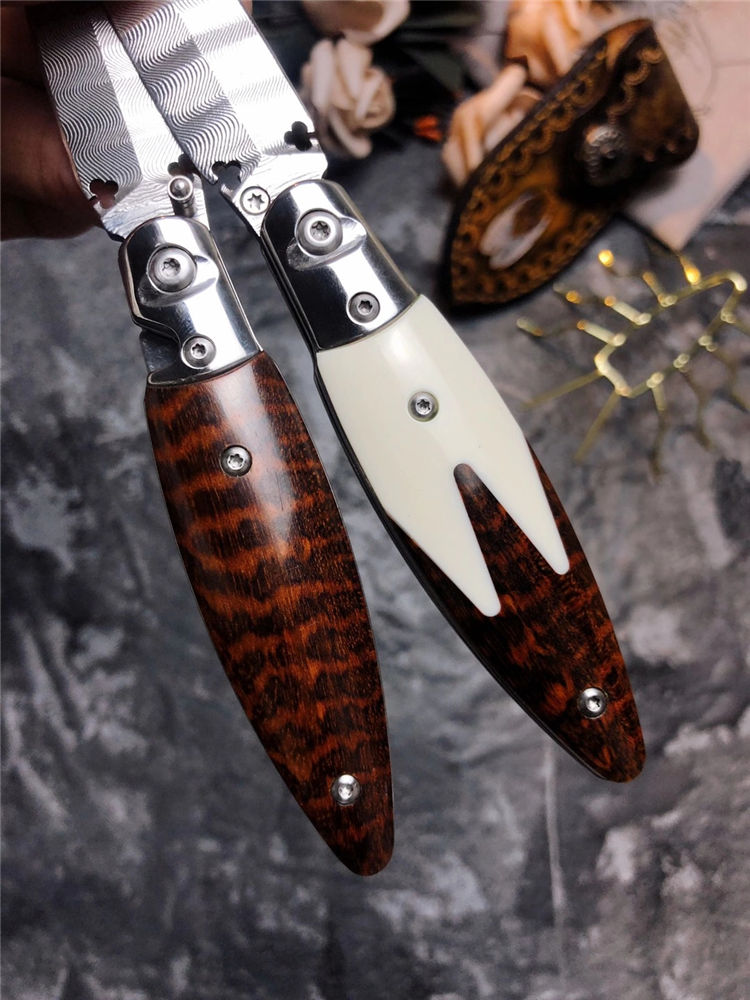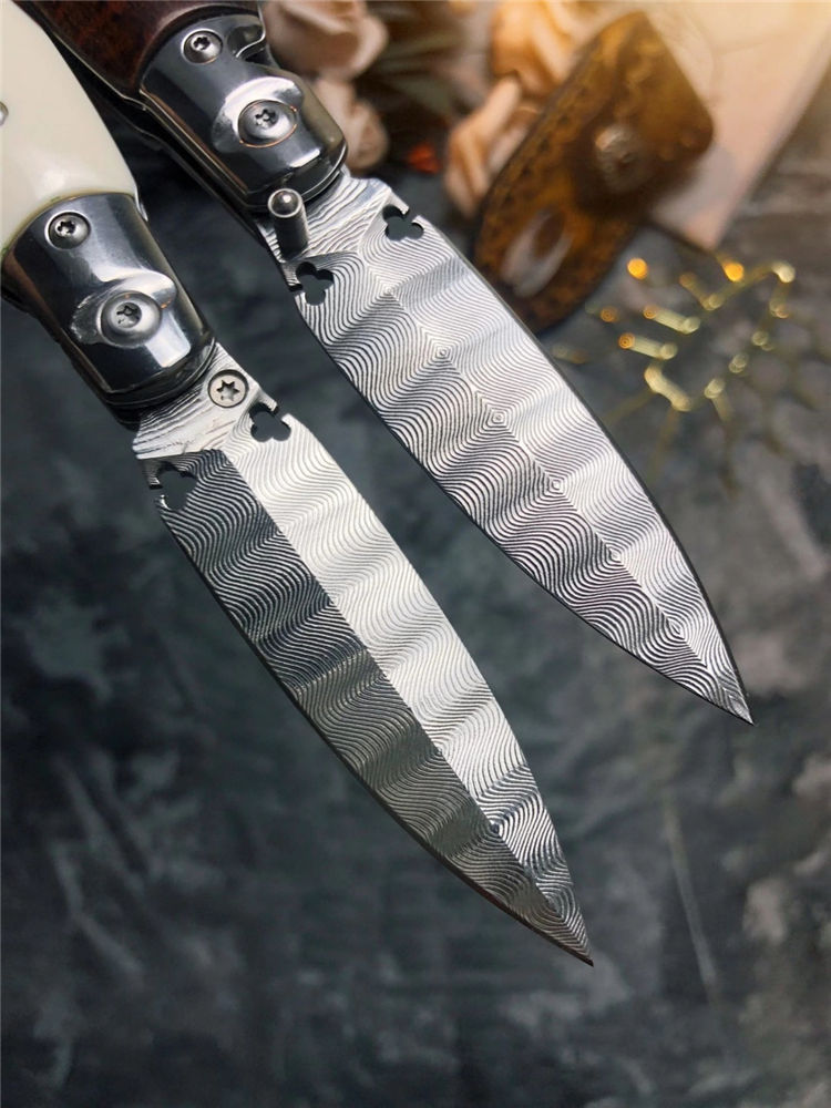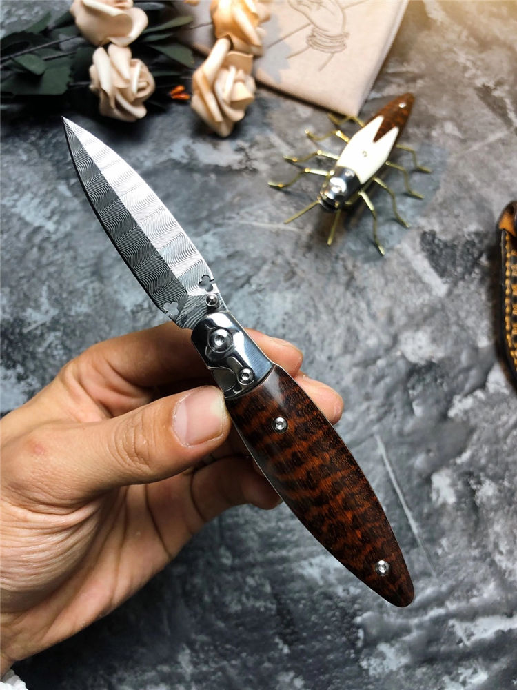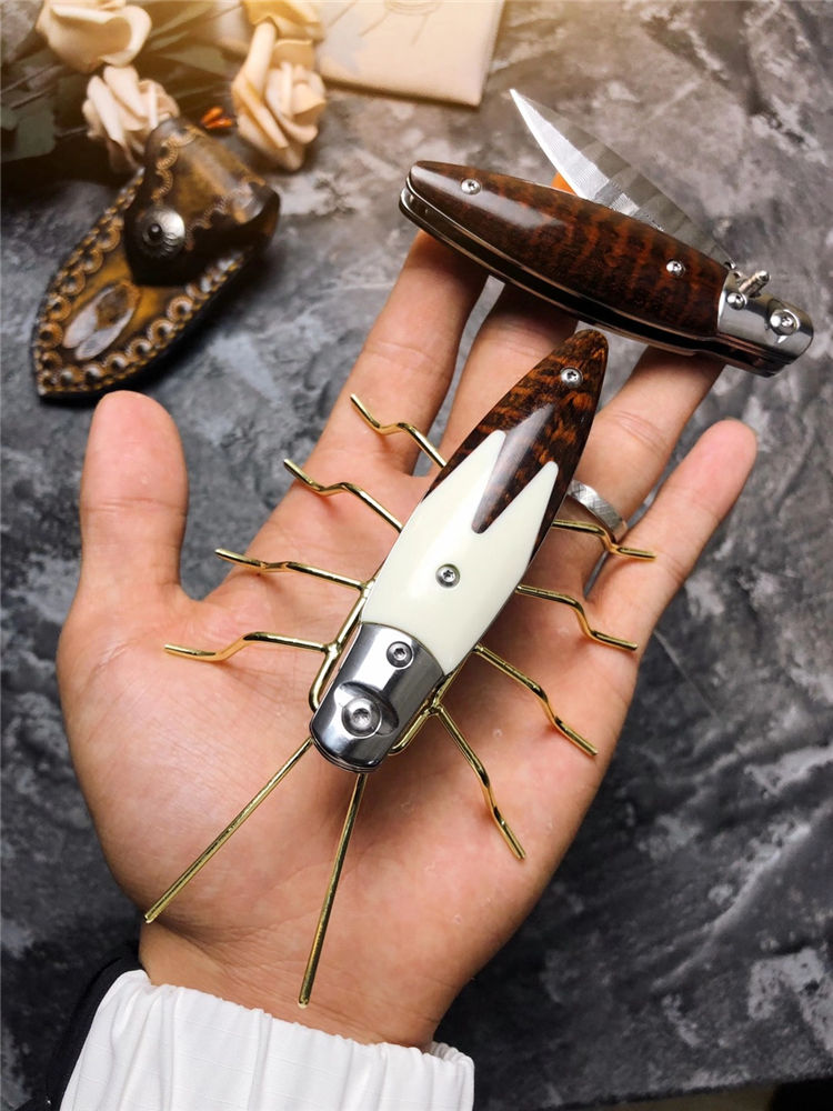 大马士革金蝉折刀 总长:16cm 刃长:7cm 折合:9cm 刃厚:3MM 刃宽:1.8cm 钢材:进口锻造大马士革钢 硬度:60HRC 柄材:钢头+白牛骨片+进口蛇纹木 皮套:意大利植鞣皮纯手工制作,蝉雕图案,手工缝线着色皮套