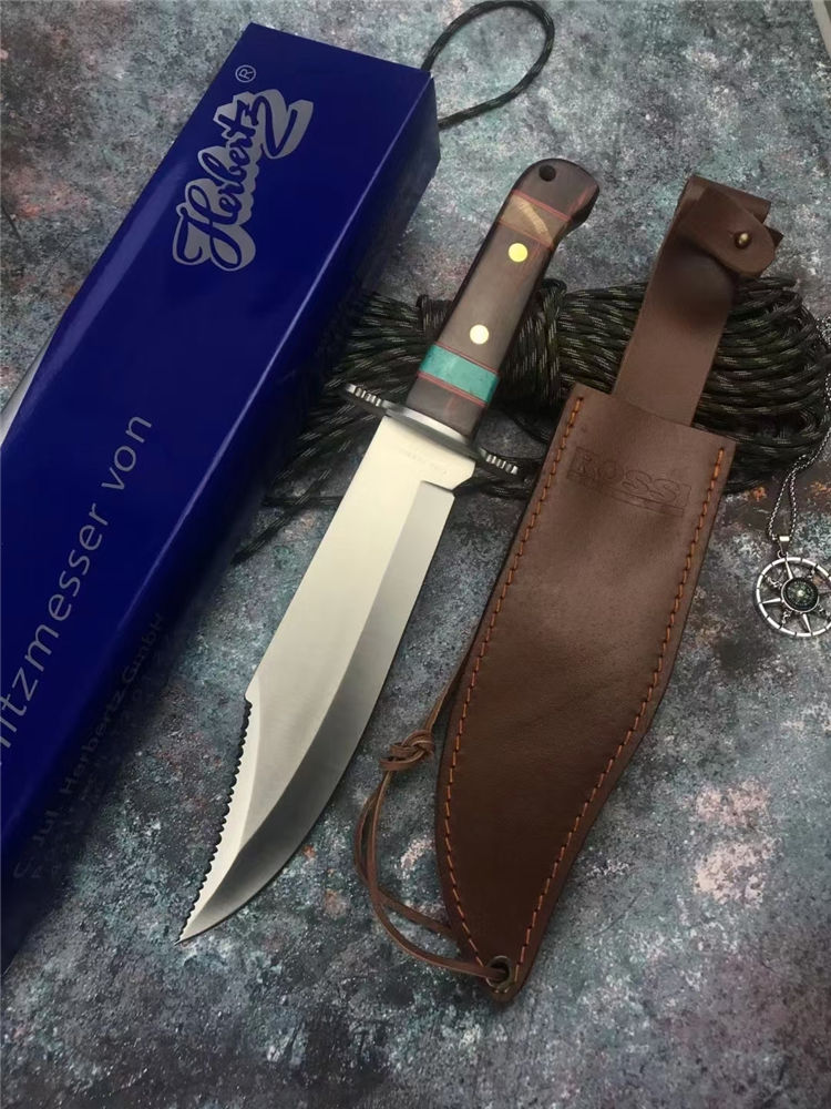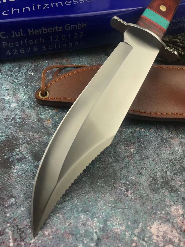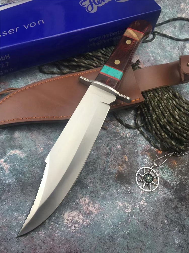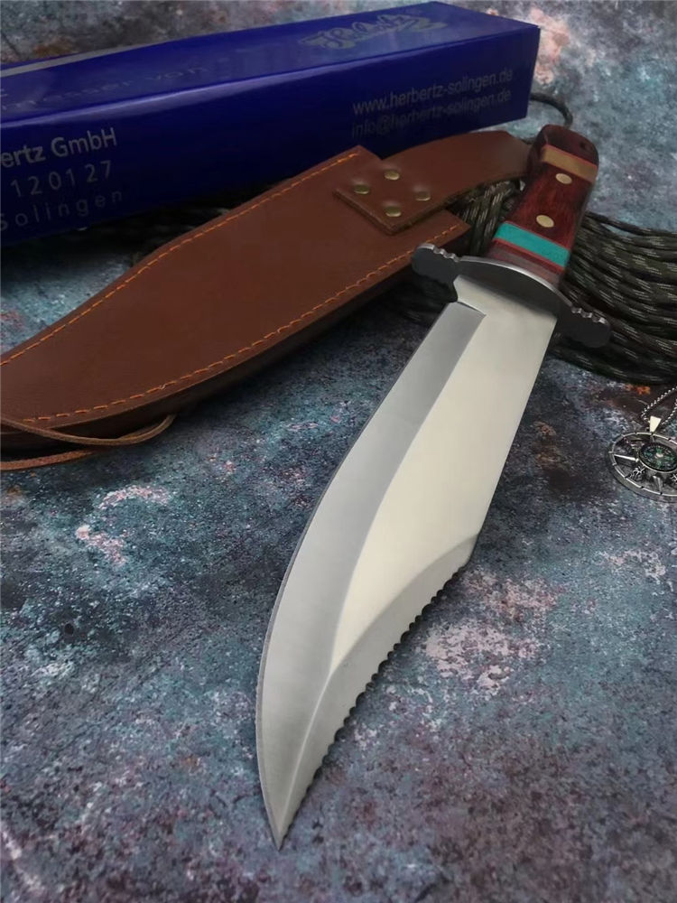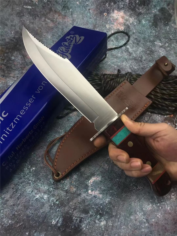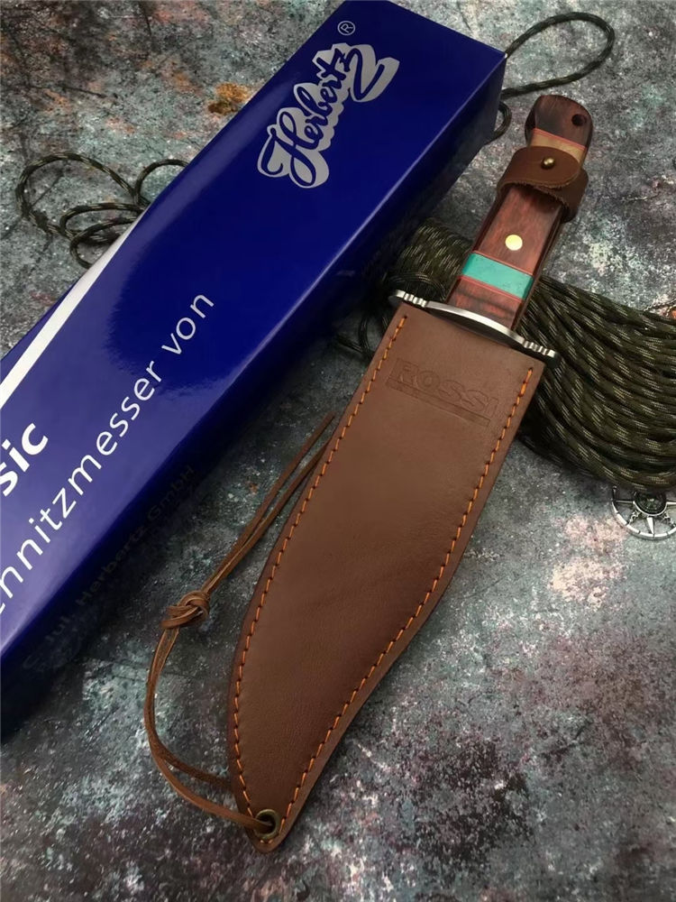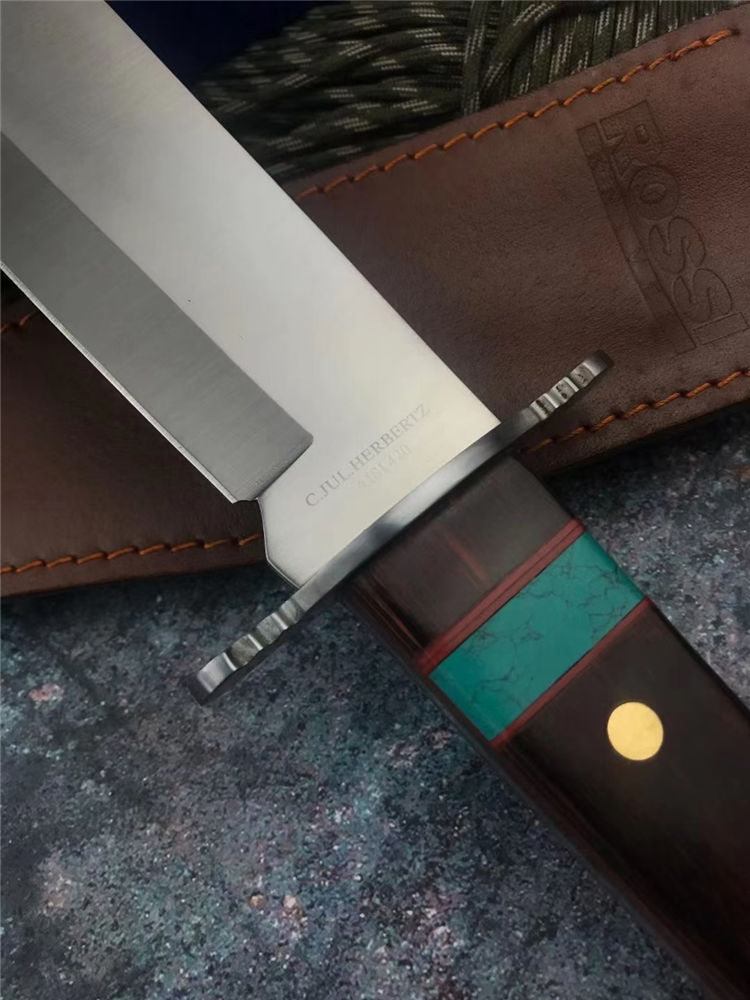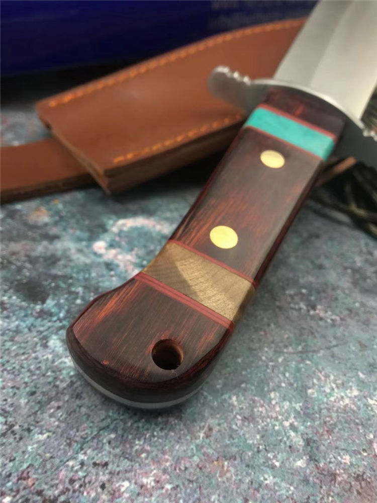 外贸鳄鱼战术直刀 全长:35.5cm 刃长:22cm 刃厚:4mm 手柄:13.5cm 刃材:7Cr15Mov高碳钢 柄材:红彩木实木+松石 硬度:58HRC 结构:一体龙骨双钢头 刃面:手工砂光/拉丝 包装:头层牛皮套+彩盒
