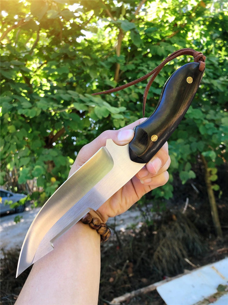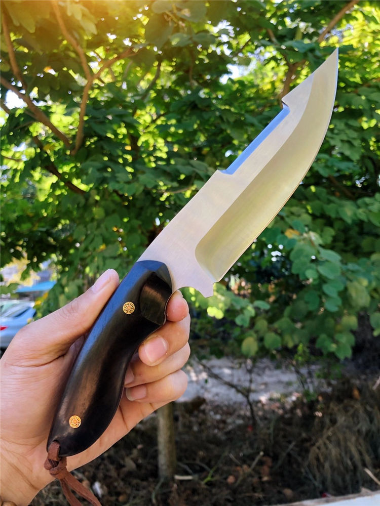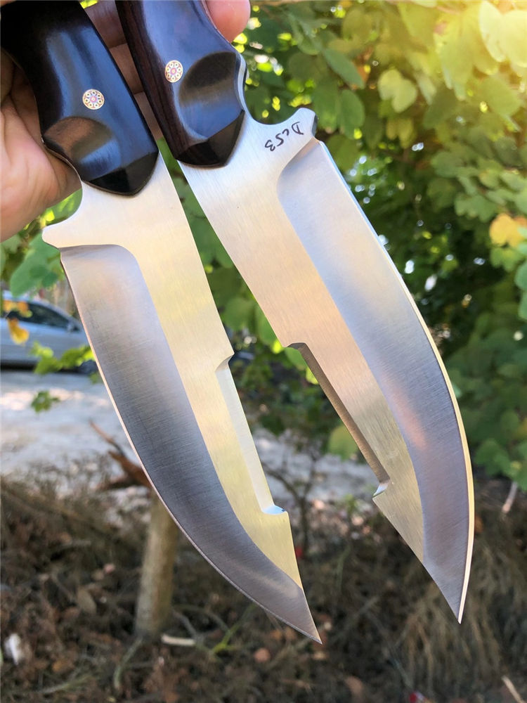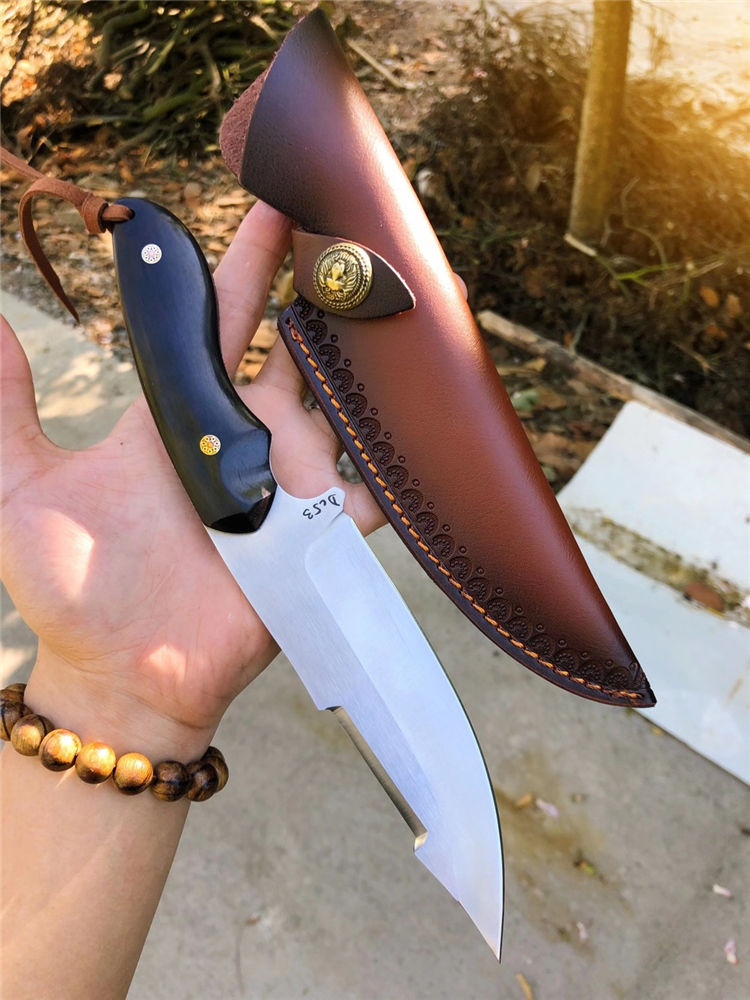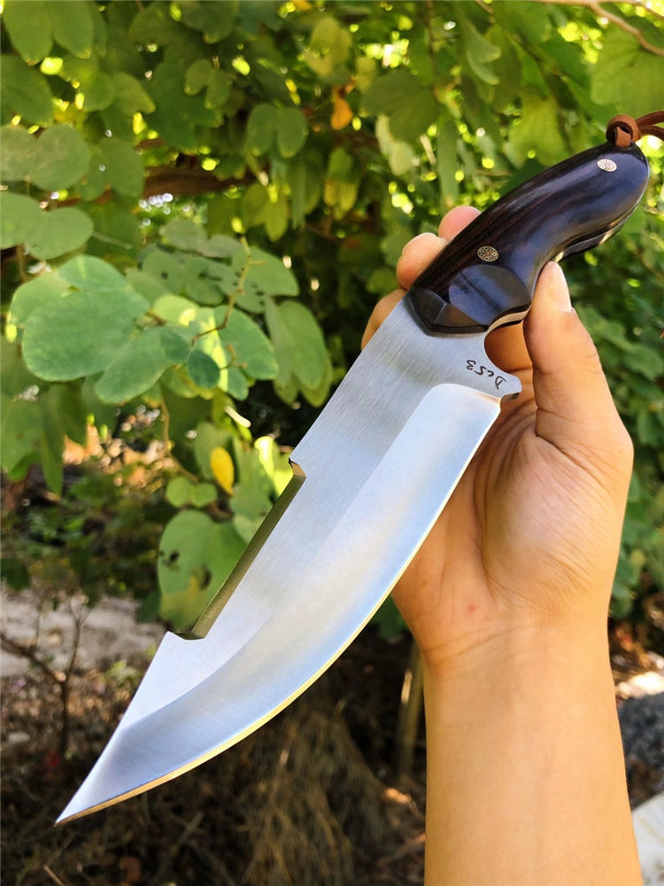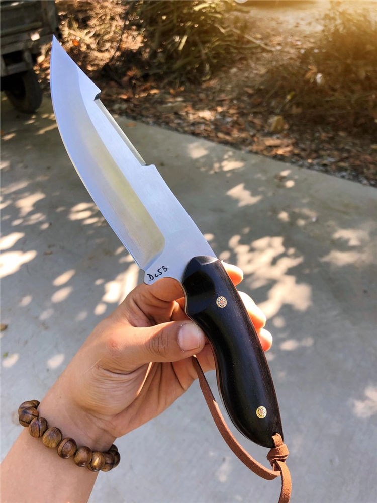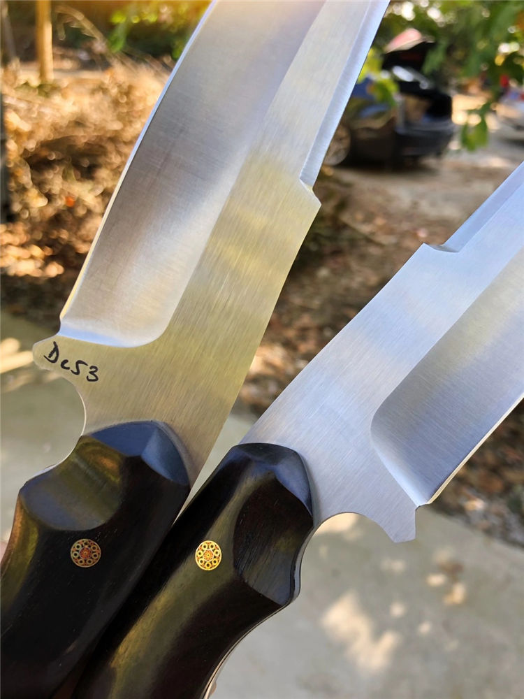 DC53锋影直刀 总长:26.5cm 刃长:14cm 刃厚:3.2mm 刃宽:4cm 钢材:DC53合金钢 热处理:真空深冷热处理 硬度:60HRC,回火处理,设计是以锋利度为主 表面处理:砂光效果 开刃方式:多次水冷二次开刃 工艺制作:纯手工打磨抛光制作 柄材:进口天然黑檀木 皮套:进口优质植鞣皮纯手工雕花皮套 包装:手工盒子包装