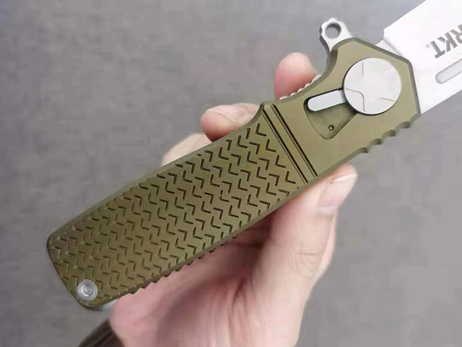CRKT家园防线折刀 刃材:山特维克12C27 柄材:铝合金 全长:21.5cm 刃长:9.3cm 闭合:12.5cm 刃厚:3.98mm 表面处理:石洗 硬度:59-60HRC 净重:160克 备注:折刀裸手可拆开