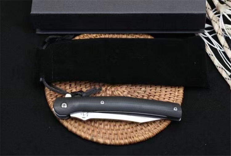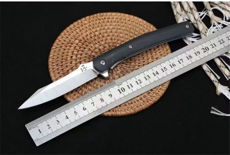 圣剑快开折刀 全长:20.1cm 闭合:11.4cm 刃长:8.7cm 刃厚: 4.0mm 刃材:9Cr18MoV钢 柄材:G10 硬度:58HRC 内衬:滚珠轴承的主轴 净重:121克 配:彩盒布袋