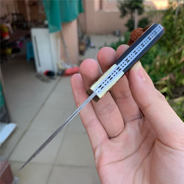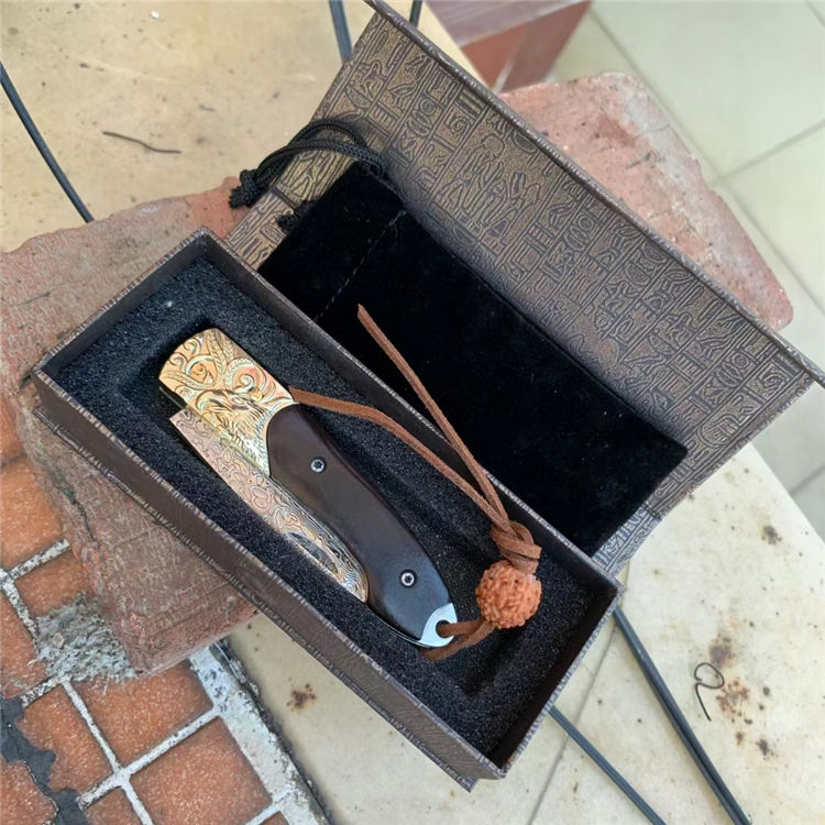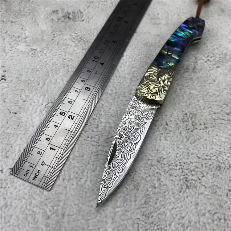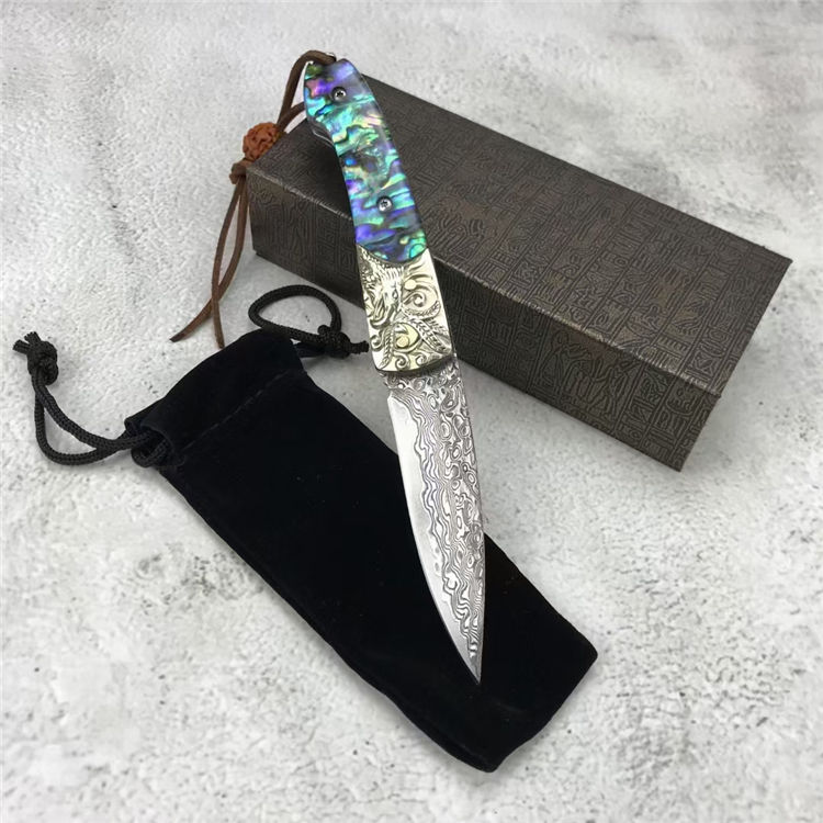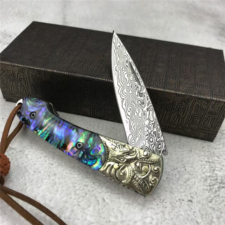大马士革鹰头折刀 全长:16.9CM 刃长:8.3CM 刃材:128层大马士革钢 刃宽:2CM 刃厚:0.3CM 柄长:9.7CM 柄材:质天然彩贝+3D雕刻铜头 重量:150克 附件:绒布袋+小礼盒