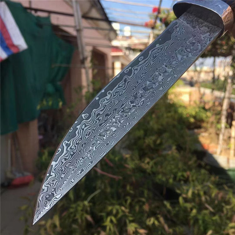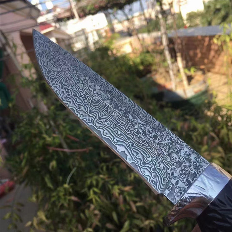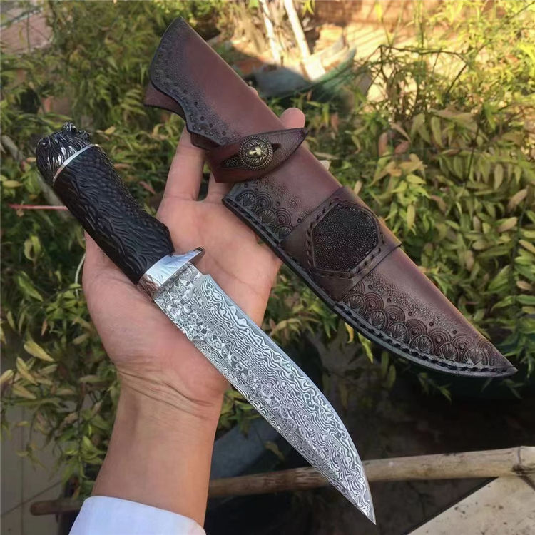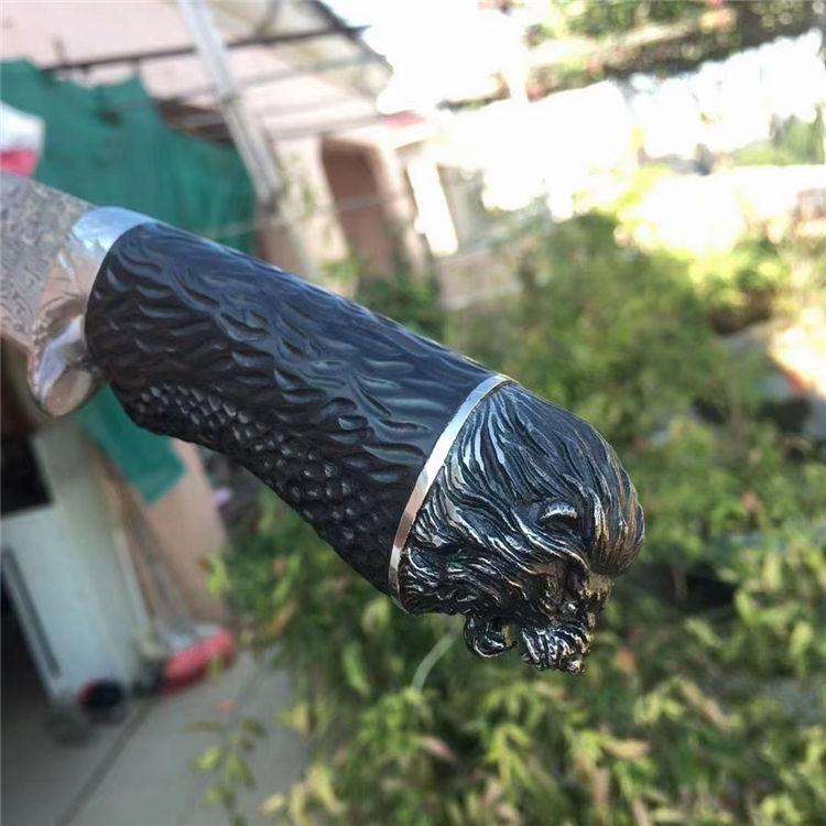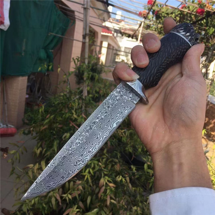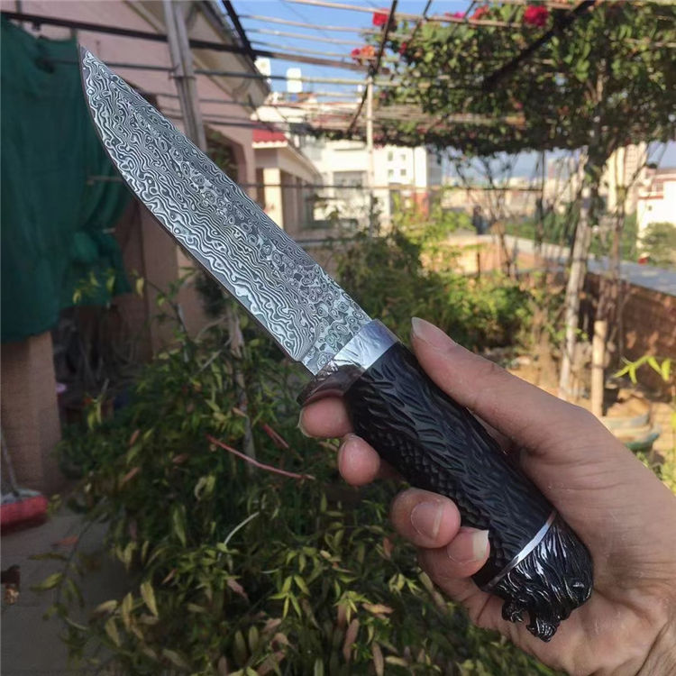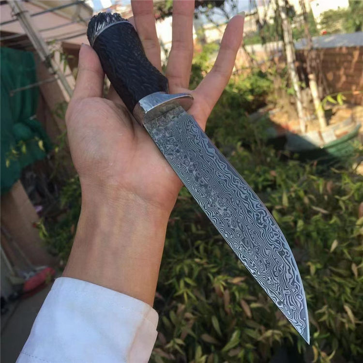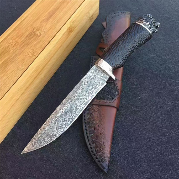 大马士革雄狮直刀 总长:28.5cm 刃长:14.5cm 手柄:12cm 刃厚:4mm 硬度:60HRC 钢材:大马士革钢 柄材:雄狮外形钢头+黑檀木 包装:高端竹盒+保养油+抹刀布