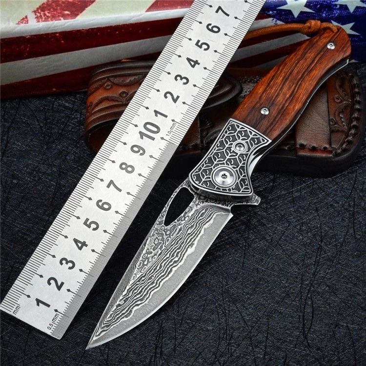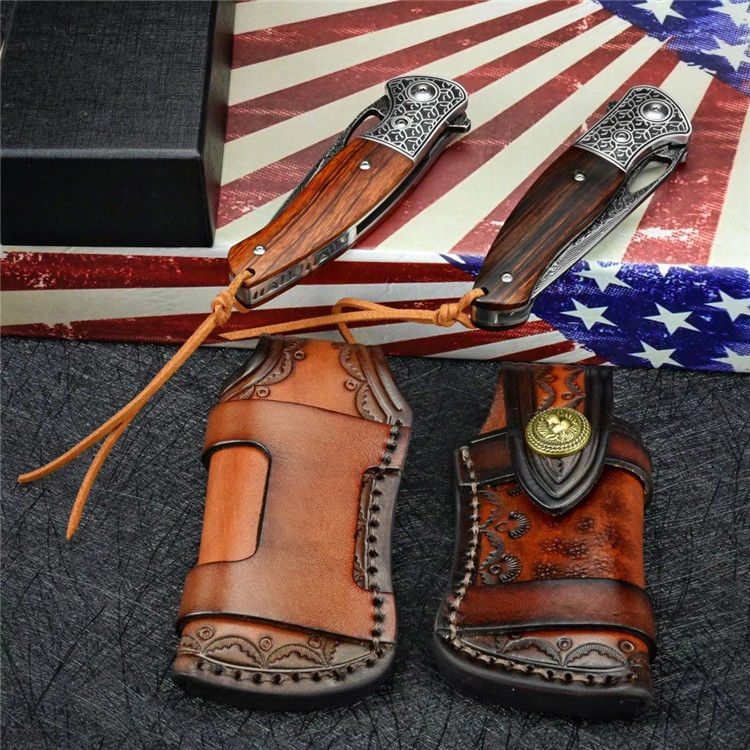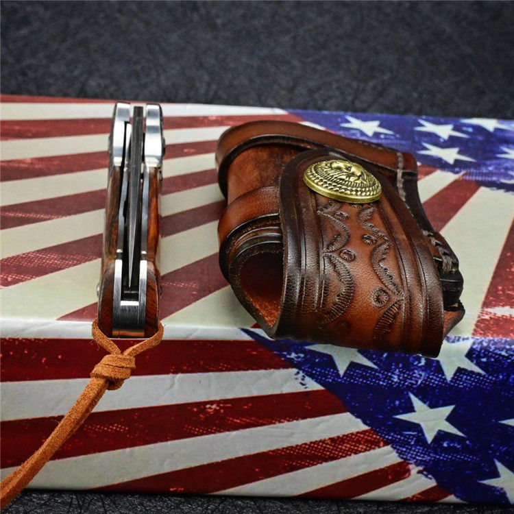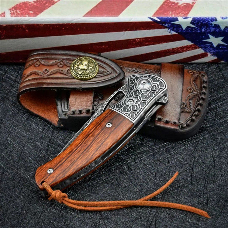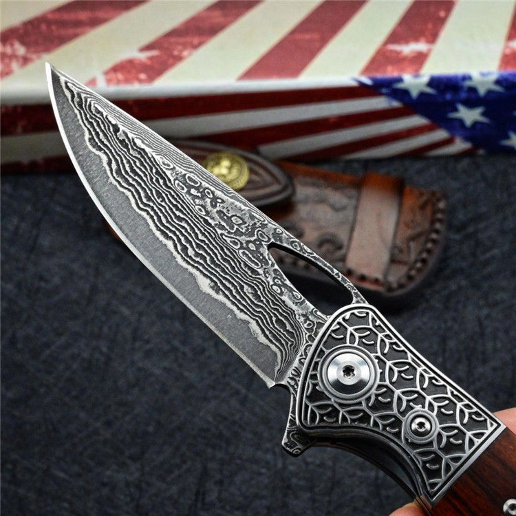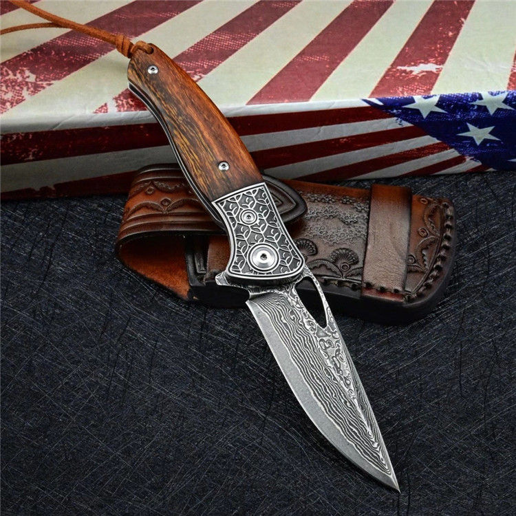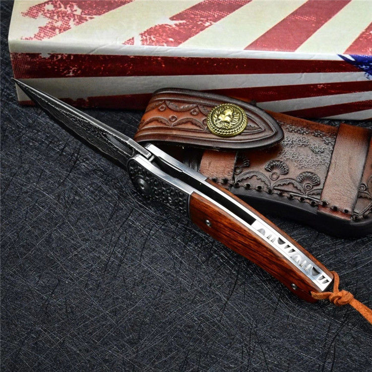 大马士革乱战折刀 总长:19.7cm 刃长:8.5cm 闭合:11cm 刃厚:0.28cm 刃宽:2.7cm 净重:133g 毛重:237g(刀+套+盒) 钢材:进口VG10大马士革钢 硬度:60-61HRC 柄材:3D精雕440C钢头+进口沙漠铁木 皮套:意大利植鞣皮纯手工制作,手工缝线着色皮套 包装:黑色手工盒子