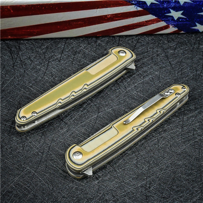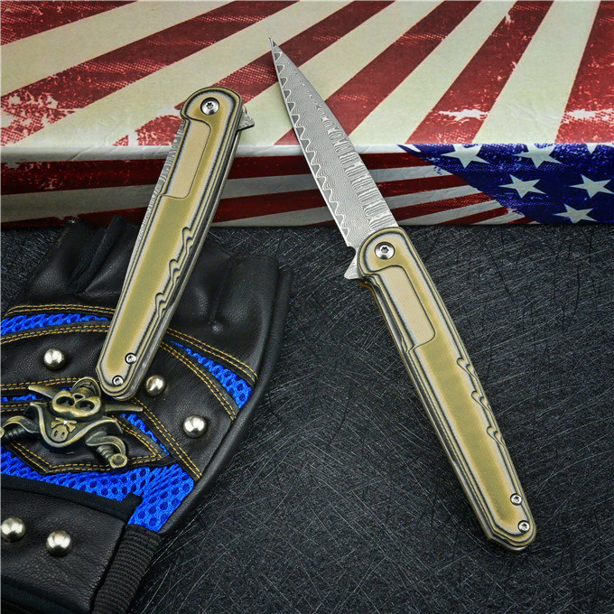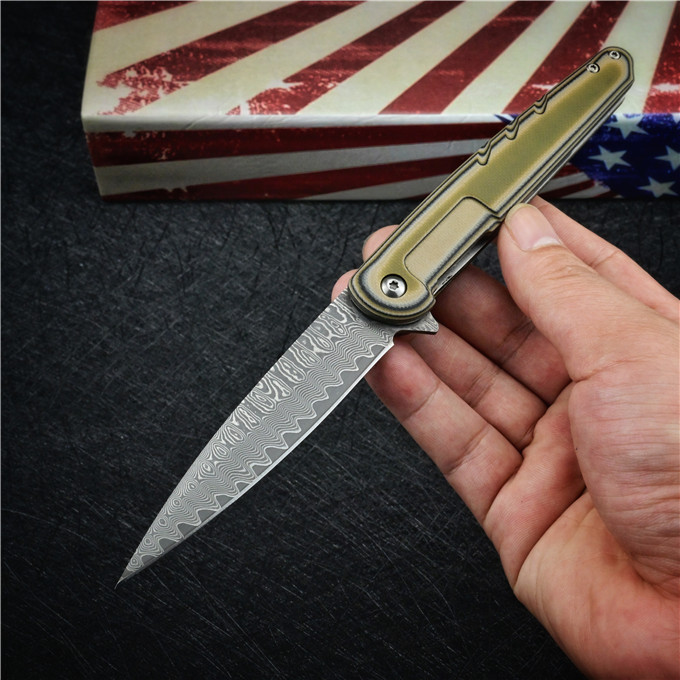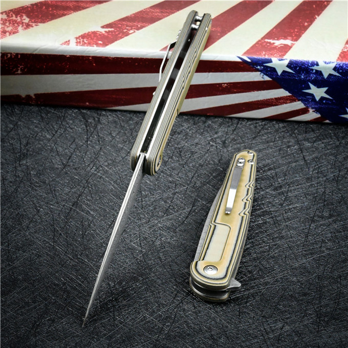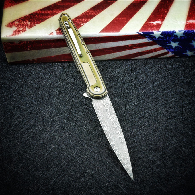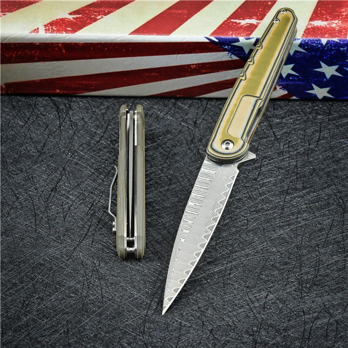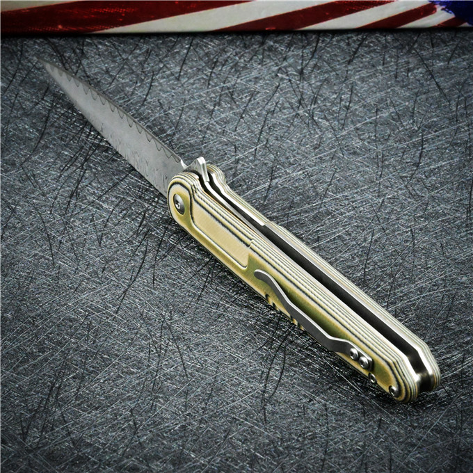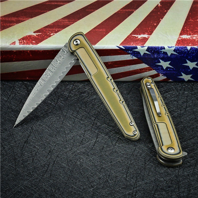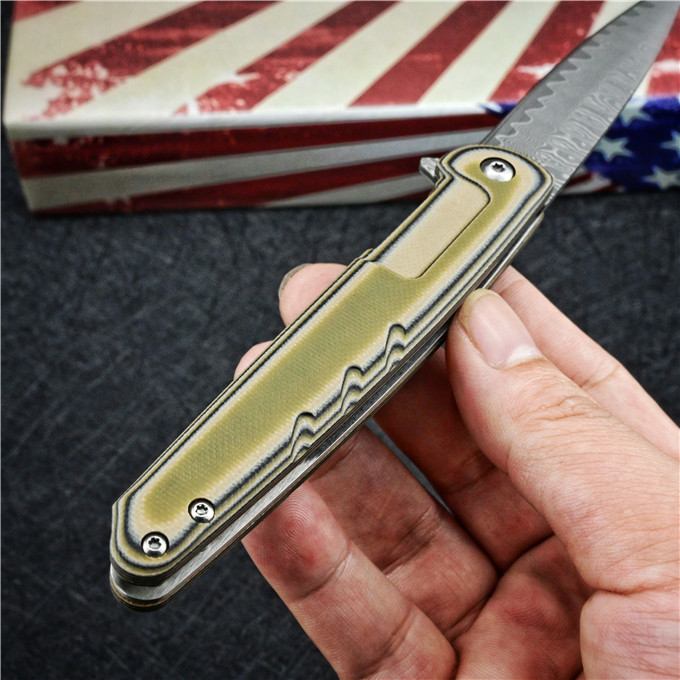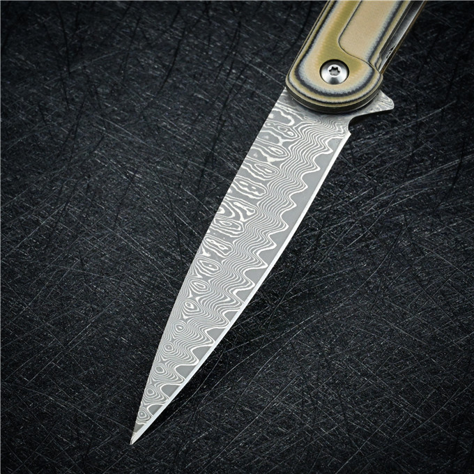 大马士革绿战鲨折刀 总长:20.8cm 刃长:9.2cm 闭合:11.8cm 刃厚:0.21cm 刃宽:1.9cm 净重:83g 毛重:132g(刀+盒) 钢材:进口VG10大马士革钢 硬度:60-61HRC 柄材:双色G10 包装:黑色手工盒子