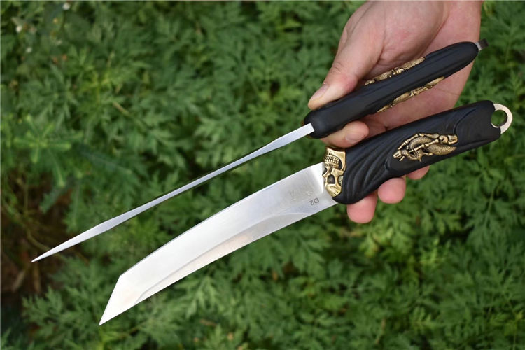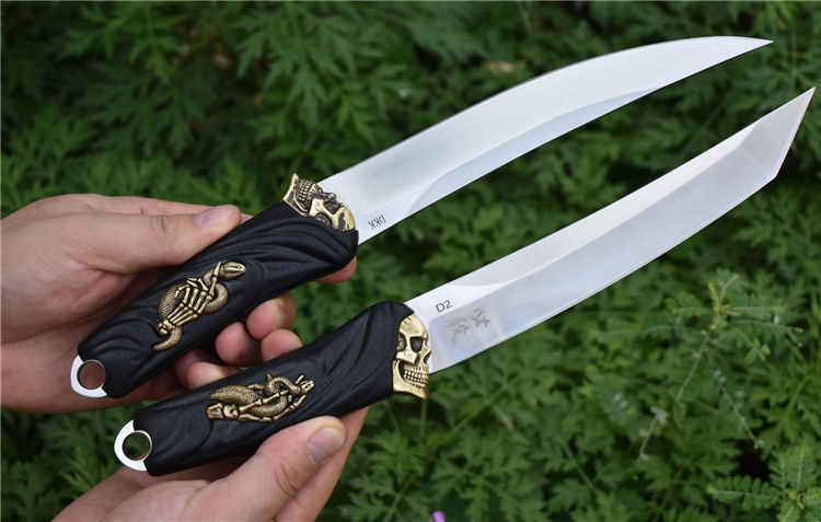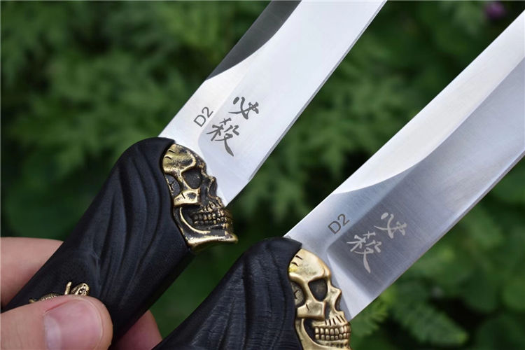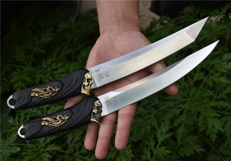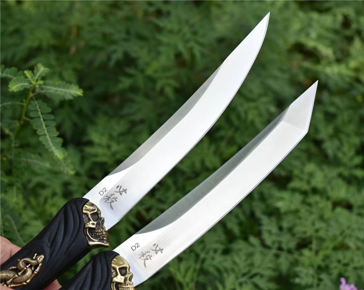 D2钢死神必杀武士刀 全长:30.5CM 刃长:18.5CM 刃厚:0.55CM 刃宽:2.94CM 刃材:进口D2钢 硬度:60(真空油冷热处理) 刀套:战术K鞘,牛皮挂件 尖头单刀重量:267克(含刀鞘340) 方头单刀重量:285克(含刀鞘358)