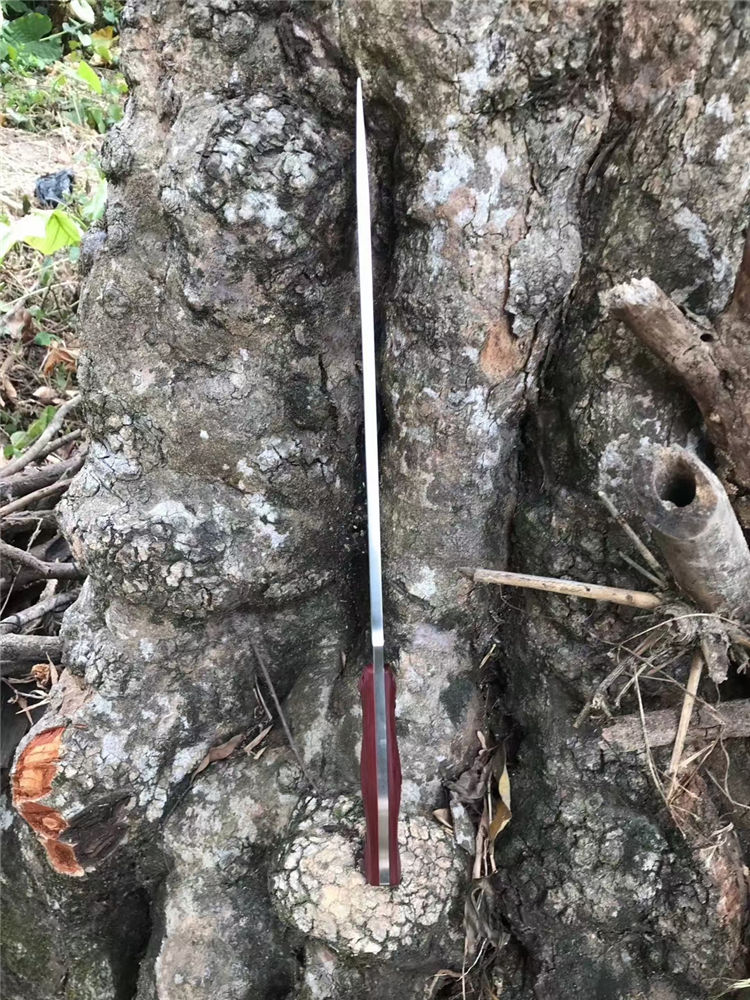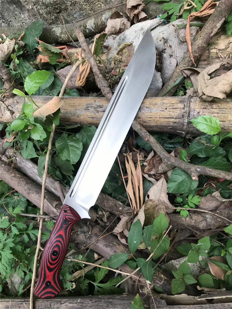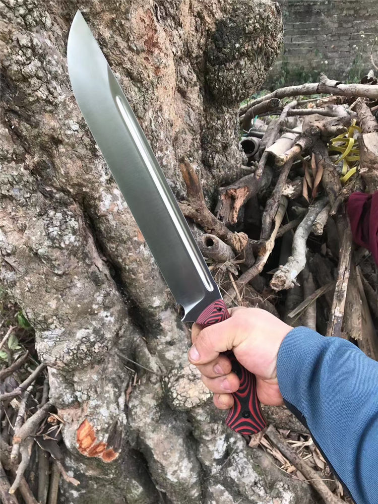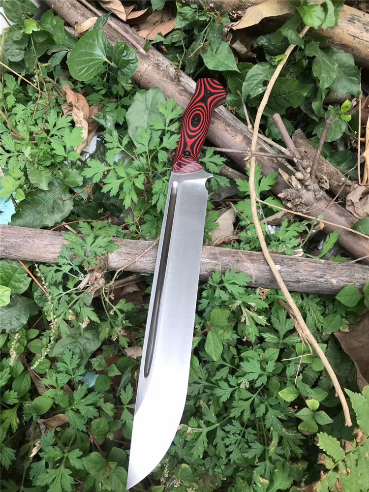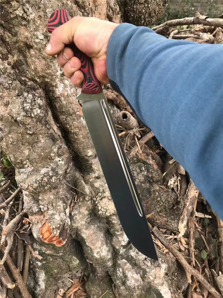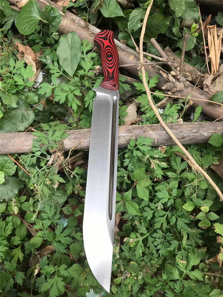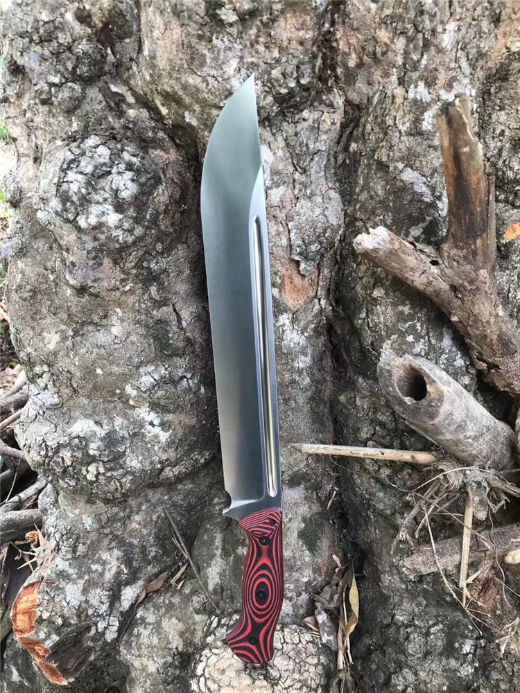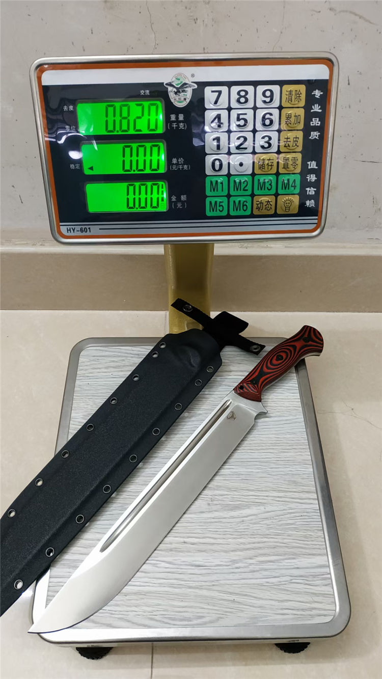 加长版红色柄野牛直升机直刀 全长:450MM 刃长:315MM 刃材:DC53 刃厚:6.7MM 热处理:真空油淬,回火3次 硬度:60-61HRC 表面处理:精细砂光,数控v磨 刃宽:47MM 柄材:红黑G10 柄长:135MM,一体龙骨,内部锣减重,重心调整完美 刀鞘:进口k鞘 刀重:约660克(不包括刀鞘) 总重:约820克(含刀鞘)