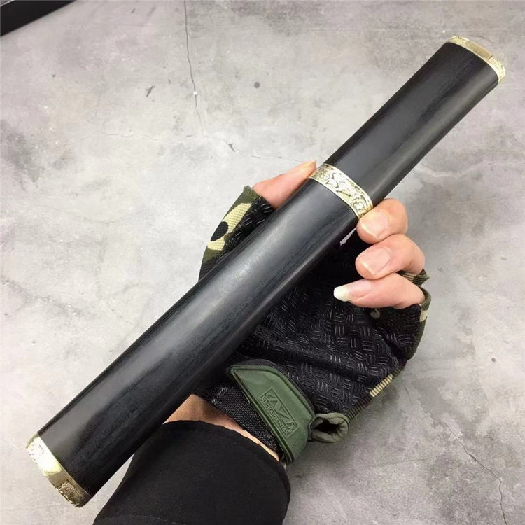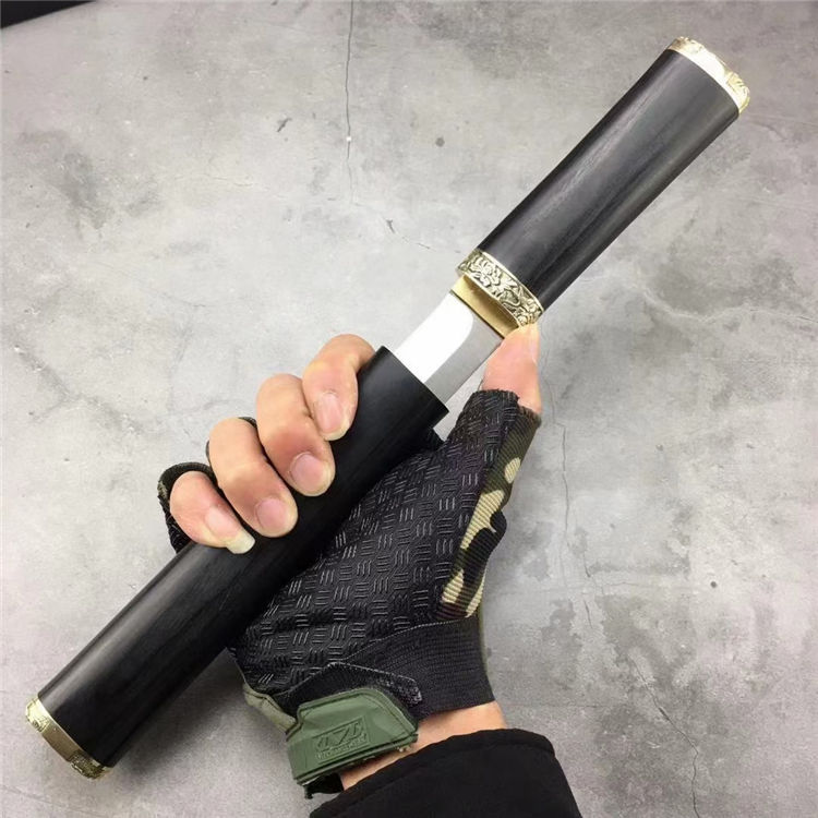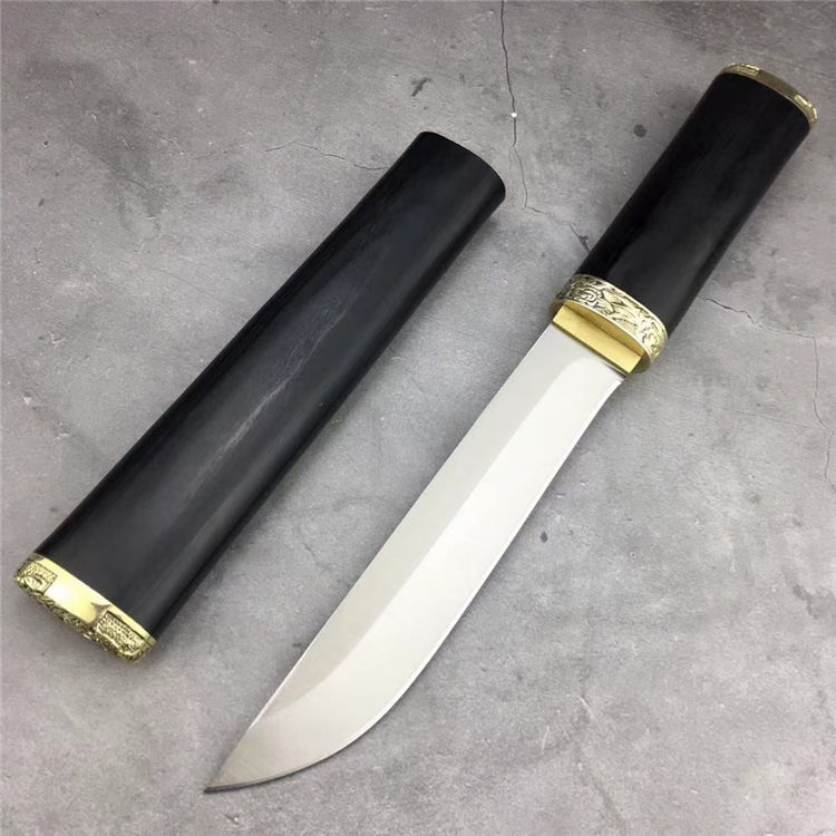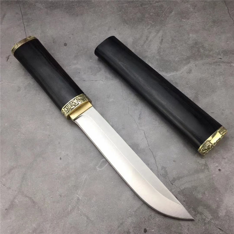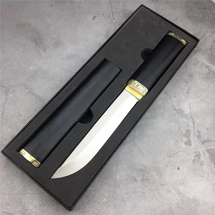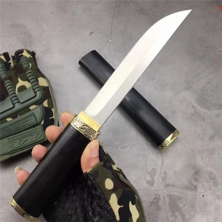 宫本小武士刀 全长:29.5CM 刀长:28CM 刃长:15.3CM 柄长:12.7CM 刃厚:0.5CM 刃宽:2.7CM 柄材:黑檀木 重量:455克(含包装) 刀鞘:黑檀木 全刀带有钢头雕花,是户外爱好者和把玩的热爱