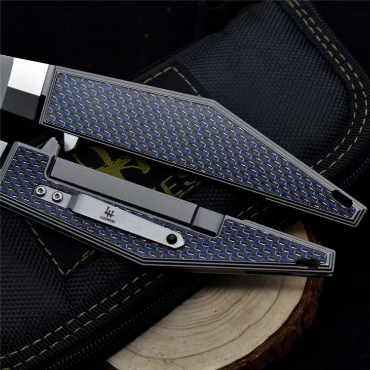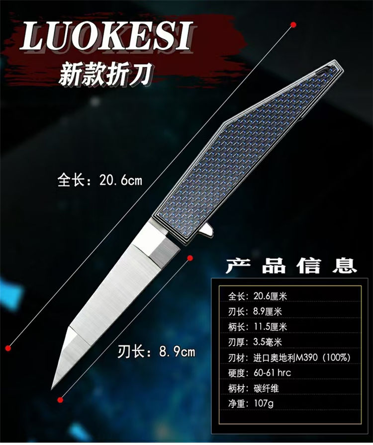 M390LUOKESI折刀 总长:206mm 刃长:89mm 柄长:115mm 刃厚:3.5mm 刃材:进口奥地利M390(100%) 硬度:60-62HRC 热处理:专业真空热处理深冷处理 柄材:碳纤维 重量:107克 系统:陶瓷滚珠轴承快开,开刀顺畅,刀刃居中,手工度非常完美 其他:配LUOKESI刀袋