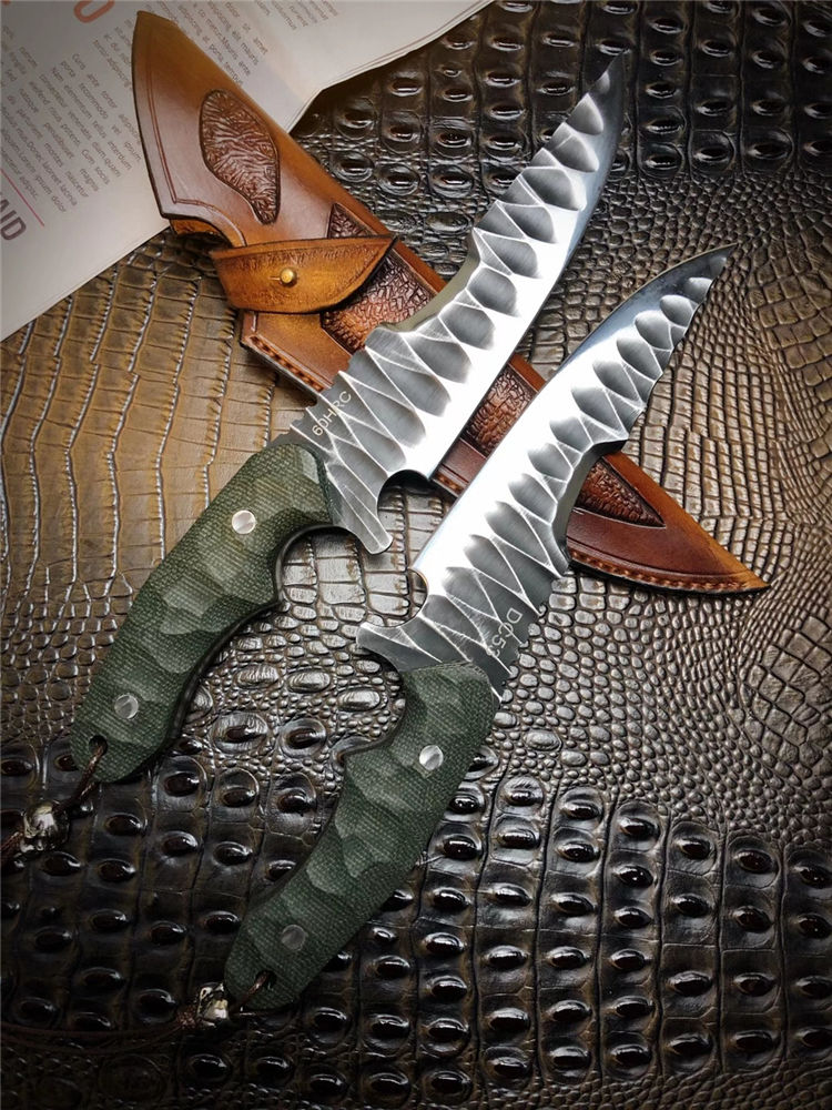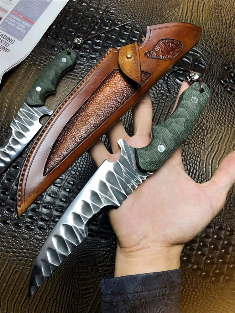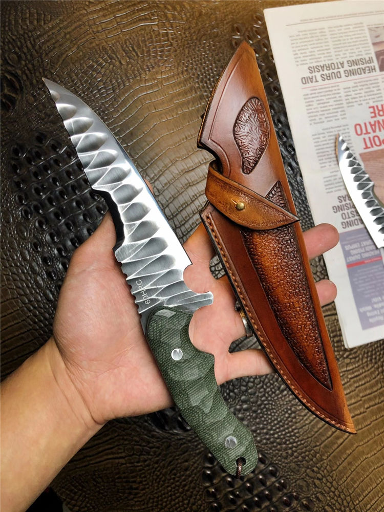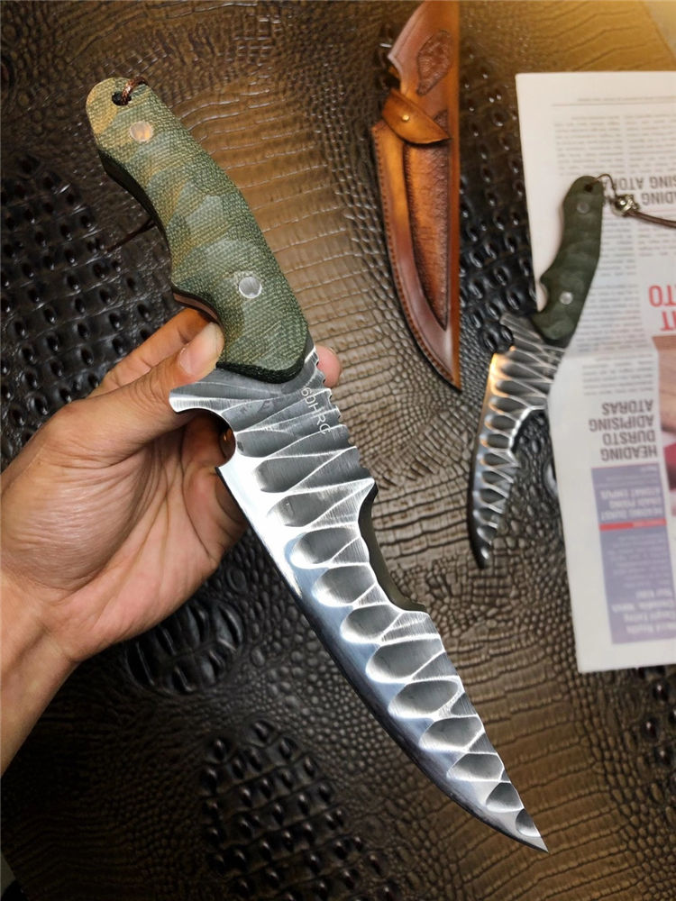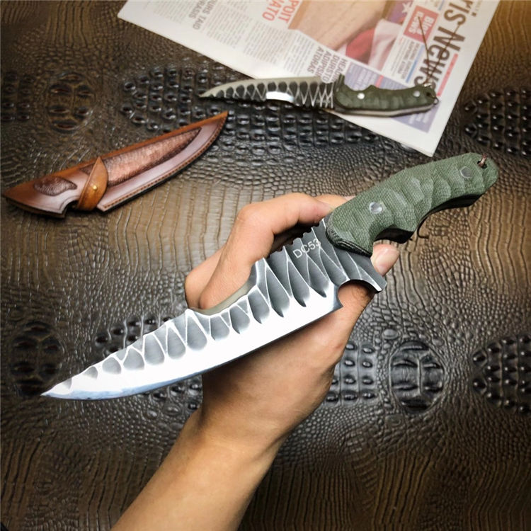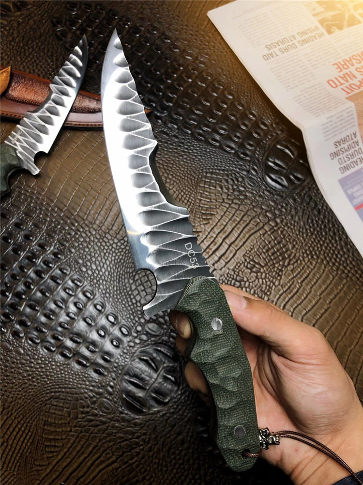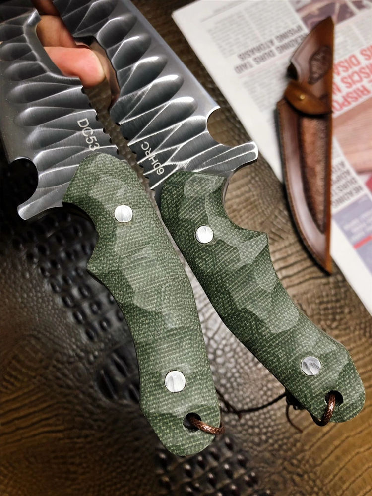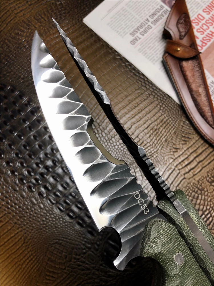 DC53徒迹直刀 总长:26cm 刃长:14.5cm 手柄:11.5cm 刃宽:4cm 刃厚:5mm 钢材:进口一体龙骨DC53合金钢 柄材:进口米卡塔 硬度:60HRC 热处理:真空热处理 开刃方式:蛤式开刃 皮套:阿根廷进口植鞣革皮手工雕花刀套 包装:手工盒